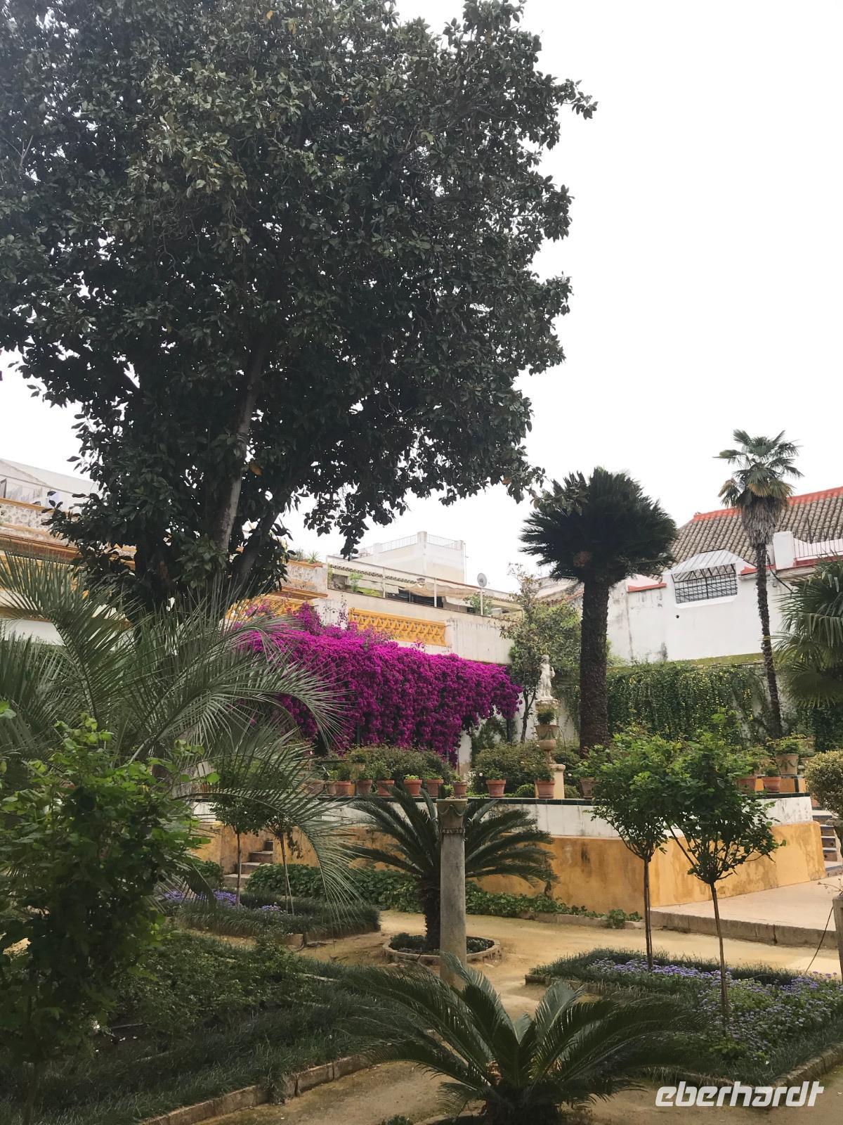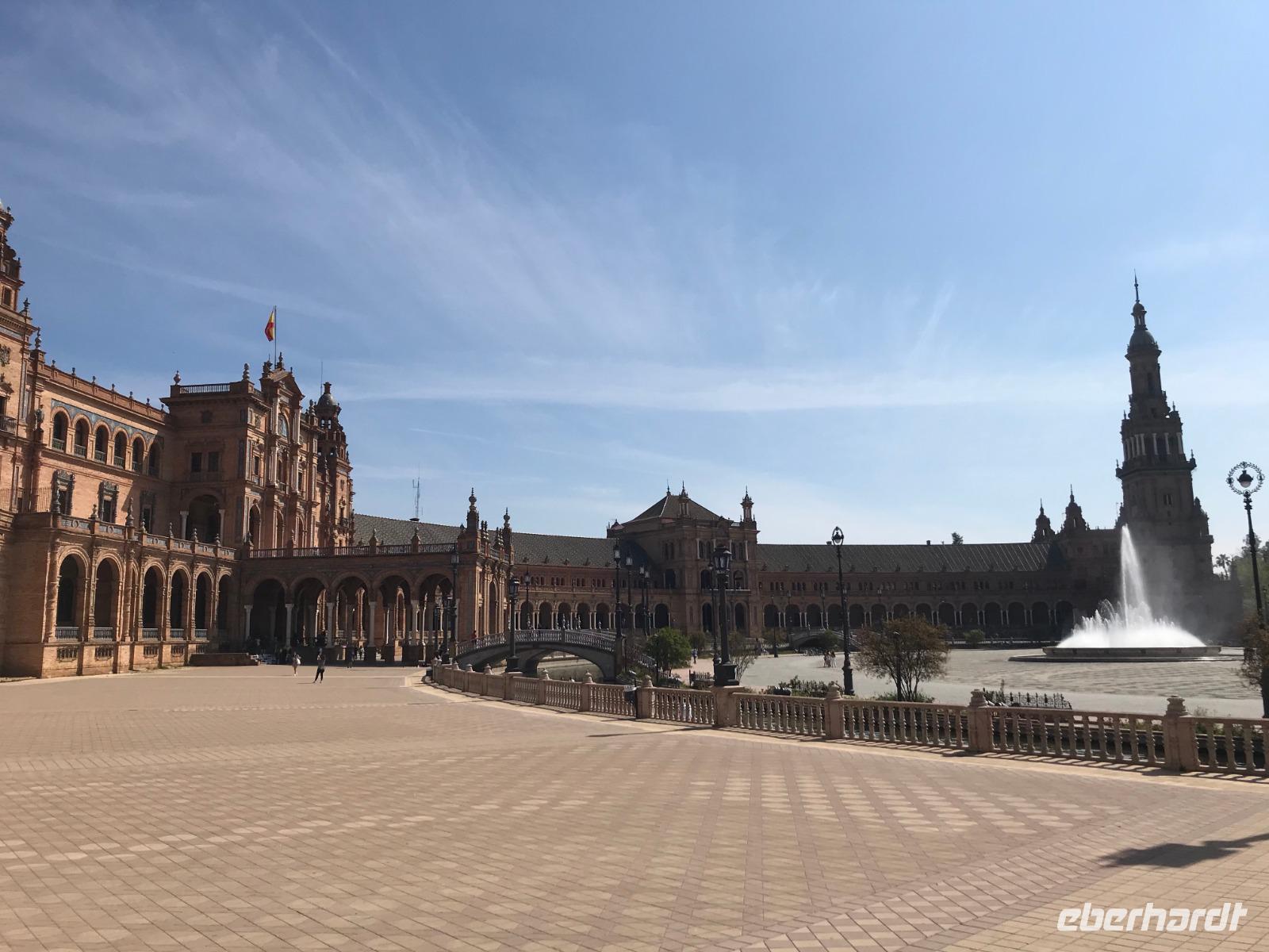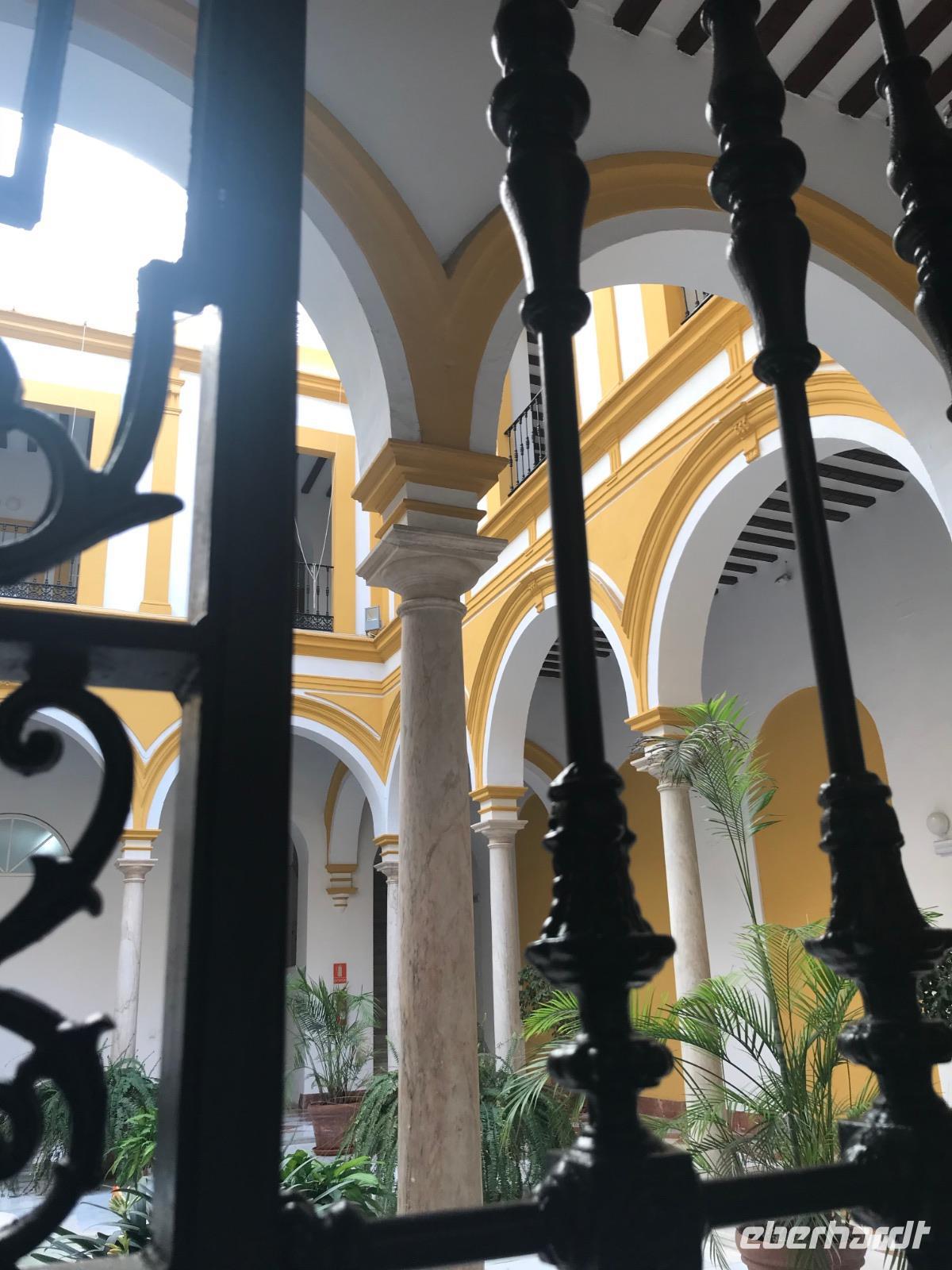 Gut erholt lassen wir uns ein leckeres Frühstück im Hotel schmecken und stärken uns für die heutige Stadtführung. Im Anschluss werden wir von unserer örtlichen Reiseleiterin Pilar abgeholt, die uns heute die wichtigsten Sehenswürdigkeiten ihrer Stadt zeigen möchte. Doch zunächst erfahren wir, dass der königliche Palast El Alcazar wegen der COVID-19-Ausbreitung geschlossen bleibt. Glücklicherweise hat Pilar die tolle Idee, alternativ das Casa de Pilatos zu besichtigen. Unsere Eberhardt-Gruppe bestaunt den andalusischen Adelspalast aus dem 16. Jahrhundert, der einen italienischen Renaissance-Stil und arabischen Mudéjar-Stil eindrucksvoll vereint. Anschließend führt uns Pilar durch die Altstadt Sevillas und bringt uns die reiche Geschichte der Stadt näher. Wir besichtigen sodann die Kathedrale, die zu den größten gotischen Bauwerken in Spanien zählt. Außerdem befindet sich dort der Sarkophag des Christopher Kolumbus. Wer danach noch Lust hat, einen atemberaubenden Überblick über Sevilla zu erhalten, besteigt mit der Reisebegleitung Carina den Turm Giralda. Als sich langsam der Hunger bemerkbar macht, kehren wir in eine Tapasbar ein und lassen uns Tortilla, Jamón ibérico (Schinken) und Kroketten schmecken.