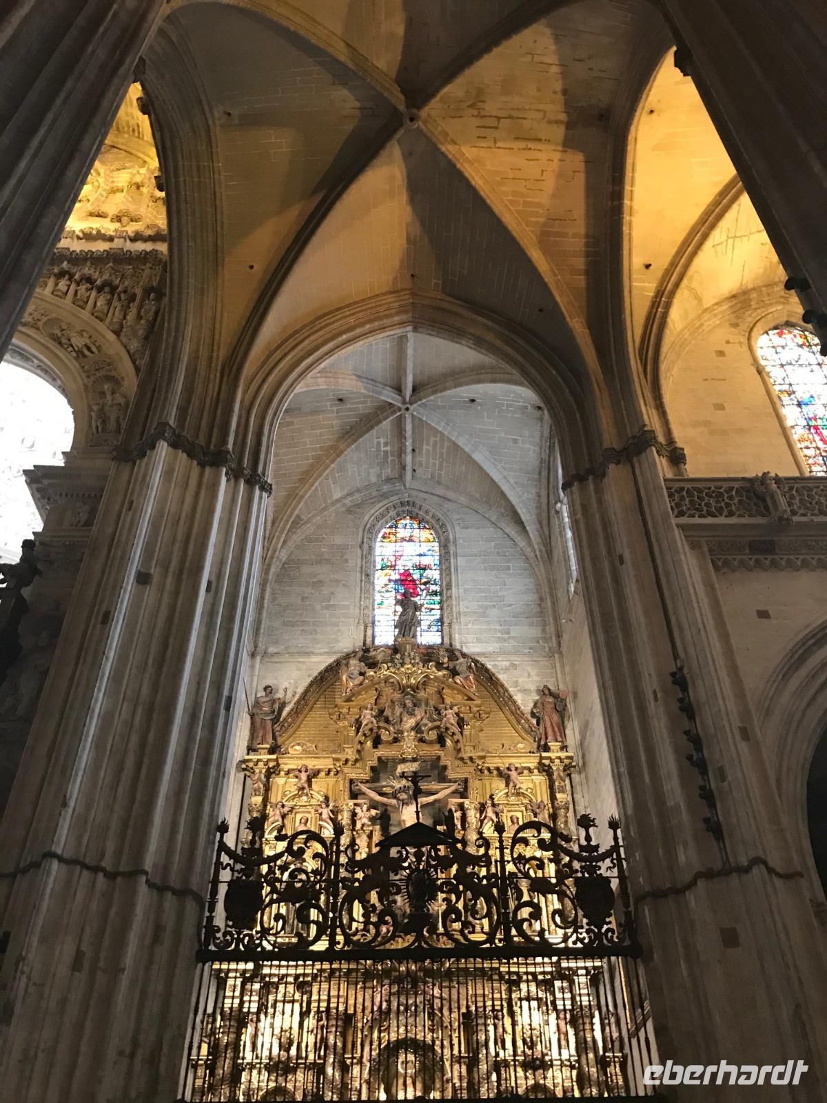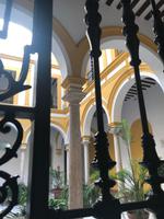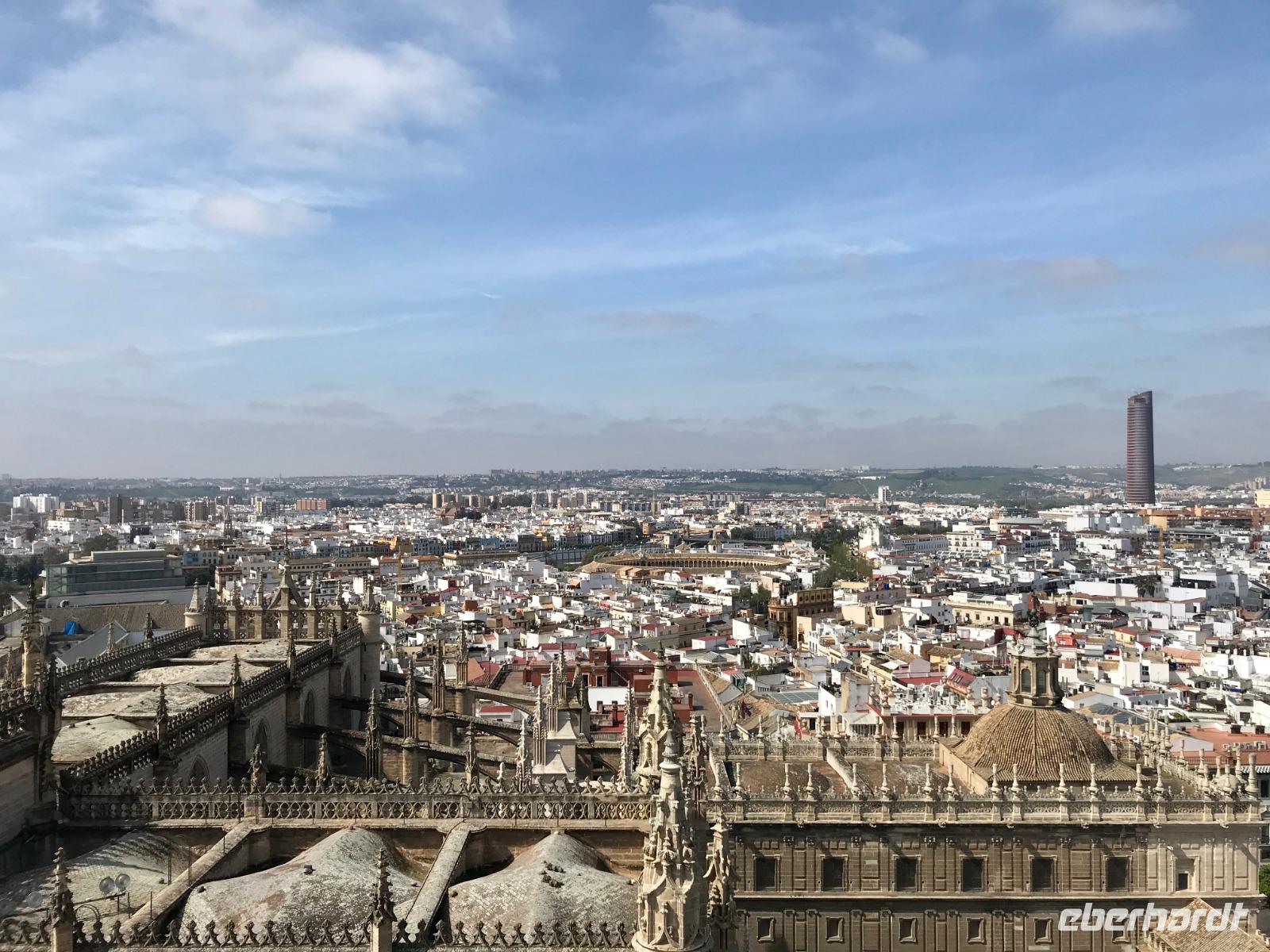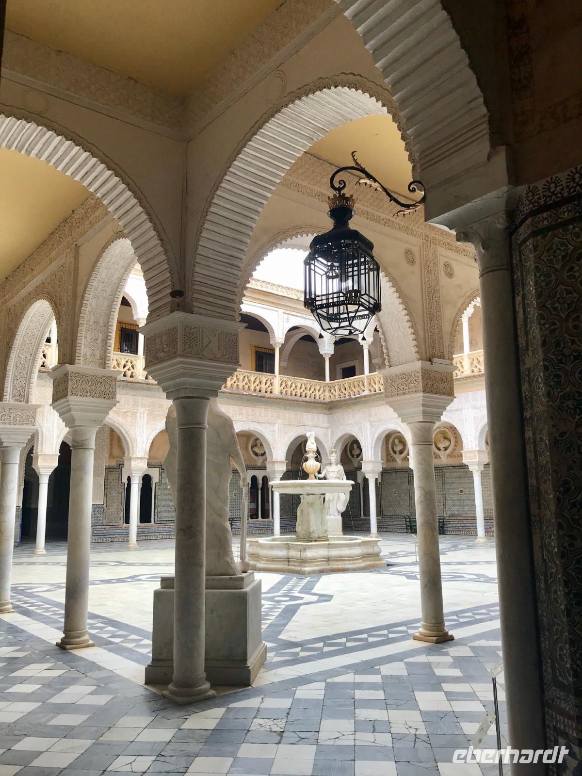 Gut erholt lassen wir uns ein leckeres Frühstück im Hotel schmecken und stärken uns für die heutige Stadtführung. Im Anschluss werden wir von unserer örtlichen Reiseleiterin Pilar abgeholt, die uns heute die wichtigsten Sehenswürdigkeiten ihrer Stadt zeigen möchte. Doch zunächst erfahren wir, dass der königliche Palast El Alcazar wegen der COVID-19-Ausbreitung geschlossen bleibt. Glücklicherweise hat Pilar die tolle Idee, alternativ das Casa de Pilatos zu besichtigen. Unsere Eberhardt-Gruppe bestaunt den andalusischen Adelspalast aus dem 16. Jahrhundert, der einen italienischen Renaissance-Stil und arabischen Mudéjar-Stil eindrucksvoll vereint. Anschließend führt uns Pilar durch die Altstadt Sevillas und bringt uns die reiche Geschichte der Stadt näher. Wir besichtigen sodann die Kathedrale, die zu den größten gotischen Bauwerken in Spanien zählt. Außerdem befindet sich dort der Sarkophag des Christopher Kolumbus. Wer danach noch Lust hat, einen atemberaubenden Überblick über Sevilla zu erhalten, besteigt mit der Reisebegleitung Carina den Turm Giralda. Als sich langsam der Hunger bemerkbar macht, kehren wir in eine Tapasbar ein und lassen uns Tortilla, Jamón ibérico (Schinken) und Kroketten schmecken.