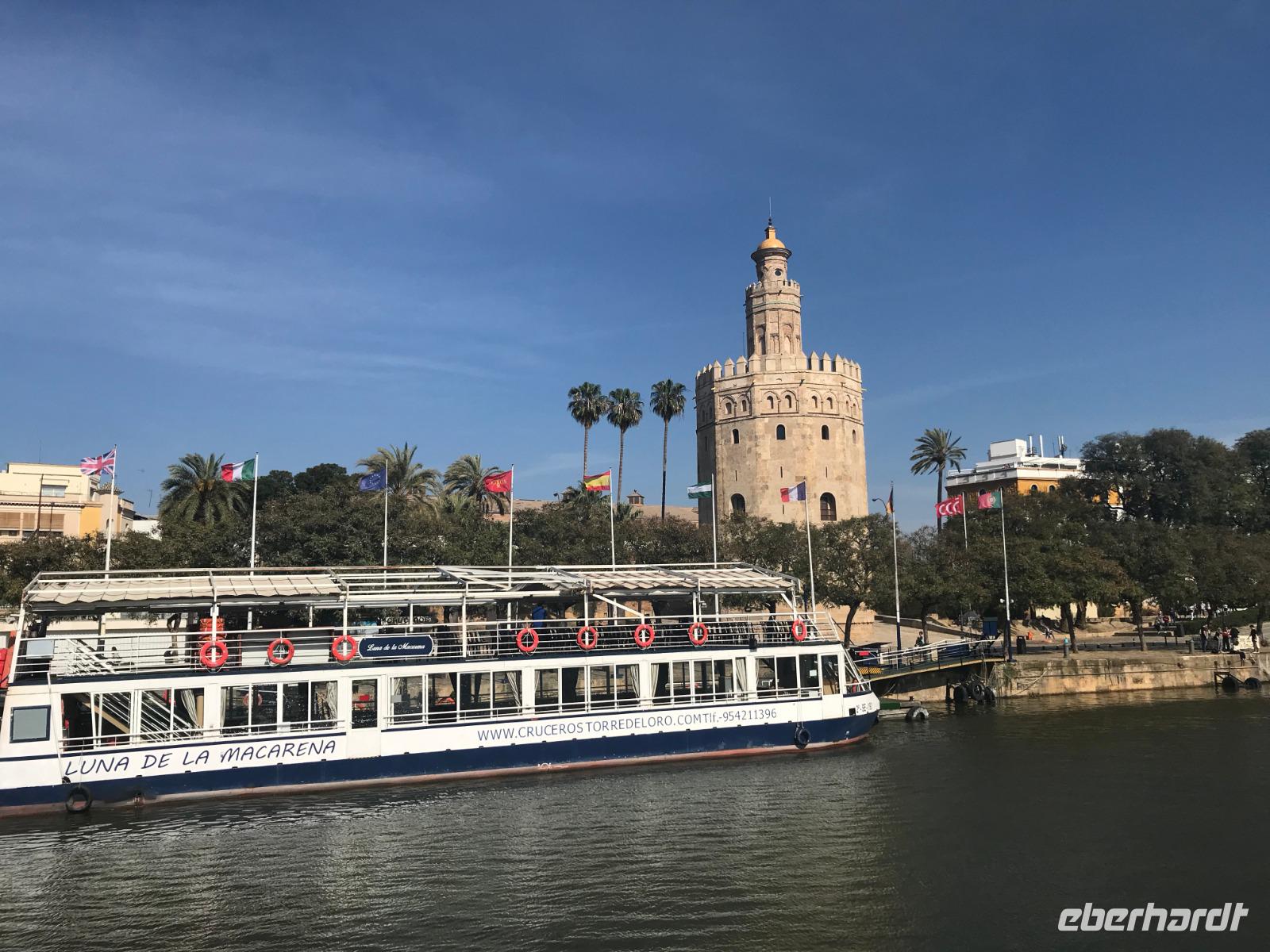 Gut gestärkt führen wir mit unserem Nachmittagsprogramm fort. Einige von uns schließen sich einem Spaziergang zum Plaza de España an, der zu den bekanntesten und schönsten Plätzen der Stadt zählt. Anschließend passieren wir die Kathedrale und brechen zu einer Schifffahrt auf, die am Festungsturm Torre de Oro beginnt. Bei Sonnenschein schippern wir über den Fluss Guadalquivir und sehen weitere Sehenswürdigkeiten, die am Ufer gelegen sind. Durch die Altstadt und ihre kleinen verwinkelten Gässchen führt es uns zurück ins Hotel, wo wir uns auf eine kleine Verschnaufpause freuen. Am Abend erwartet einige unserer Eberhardt-Gruppe noch ein Höhepunkt in unserem Programm: eine typisch andalusische Flamenco-Show. Mit dem Taxi erreichen wir den Tablao Flamenco El Arenal, wo uns eine faszinierende und intensive Vorführung des Flamenco geboten wird. Tanz, Gesang und muskalische Begleitung sind beeindruckend komponiert und berühren auch uns emotional. Am späten Abend kehren wir begeistert zurück und nehmen im Hotel unser reichliches Abendessen ein, wo wir auf die anderen unserer Gruppe treffen, die sich das Essen bereits früher haben schmecken lassen. Nach diesem erlebnisreichen und langen Tag freuen wir uns auf unser Bett und einen erholsamen Schlaf.