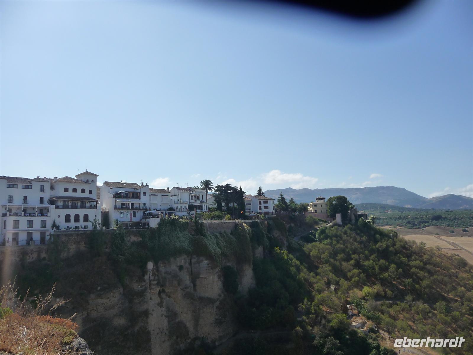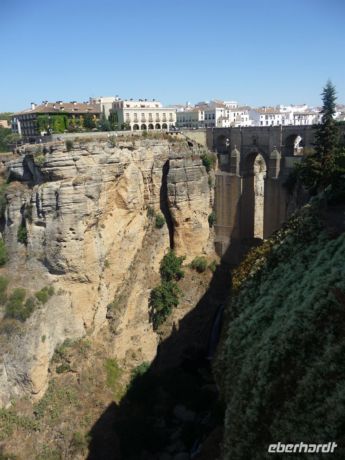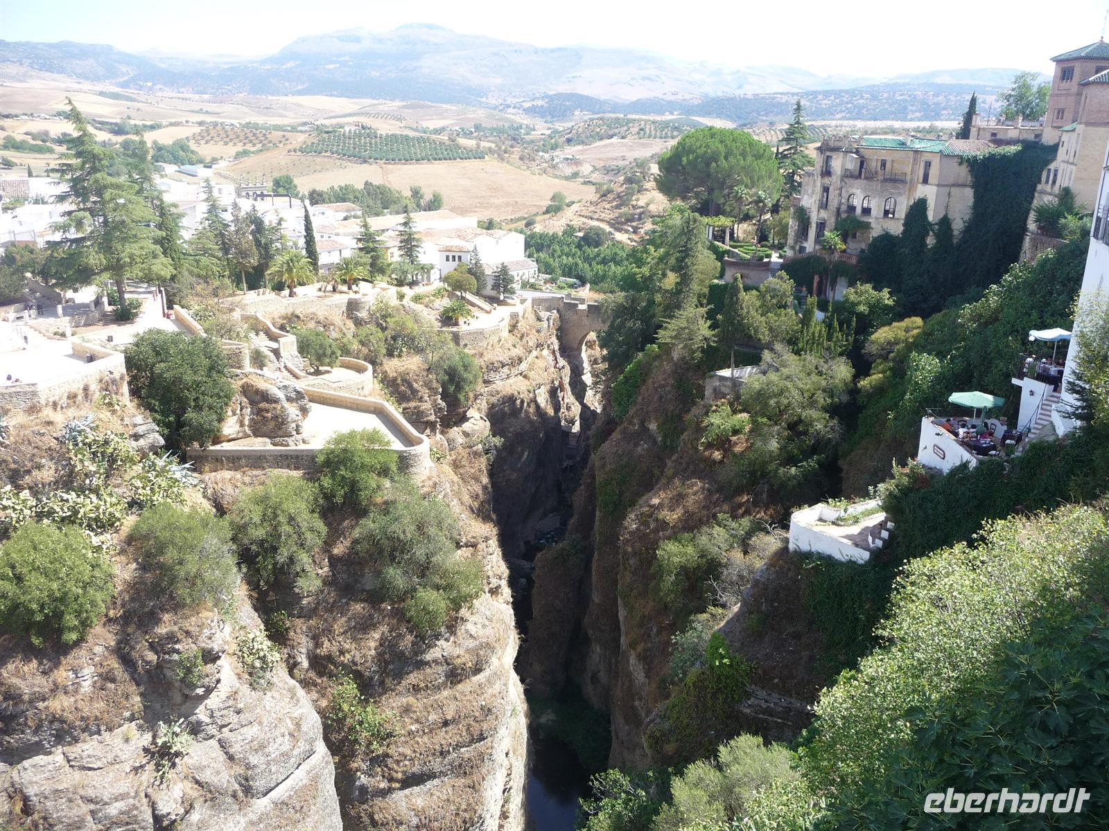 Unser eigentlicher lokaler Führer ist zu der Zeit noch mit einer anderen Touristengruppe unterwegs, die verspätet die Führung begann. Damit wir nicht warten müssen und unseren Zeitplan einhalten können, entschloss sich Kay die Stadtführung zu übernehmen. Wir überquerten die Puento Nuevo (Neue Brücke), von der wir einen atemberaubenden Blick auf die 160 Meter tiefe Schlucht El Tajo haben. Die aus dem 18. Jahrhundert stammende Brücke spannt sich in einer Höhe von knapp 100 Metern über den Tajo-Fluss und ähnelt ein römisches Aquädukt. Begeistert von der spektakulären Lage Rondas laufen wir in die Altstadt „La Ciudad“. Gleich als erstes statten wir dem Haus „El Bosco“ einen Besuch ab, herrliches Anwesen mit lieblichem Patio (Innenhof), gigantischem Panoramablick und wunderschöner Gartenanlage.