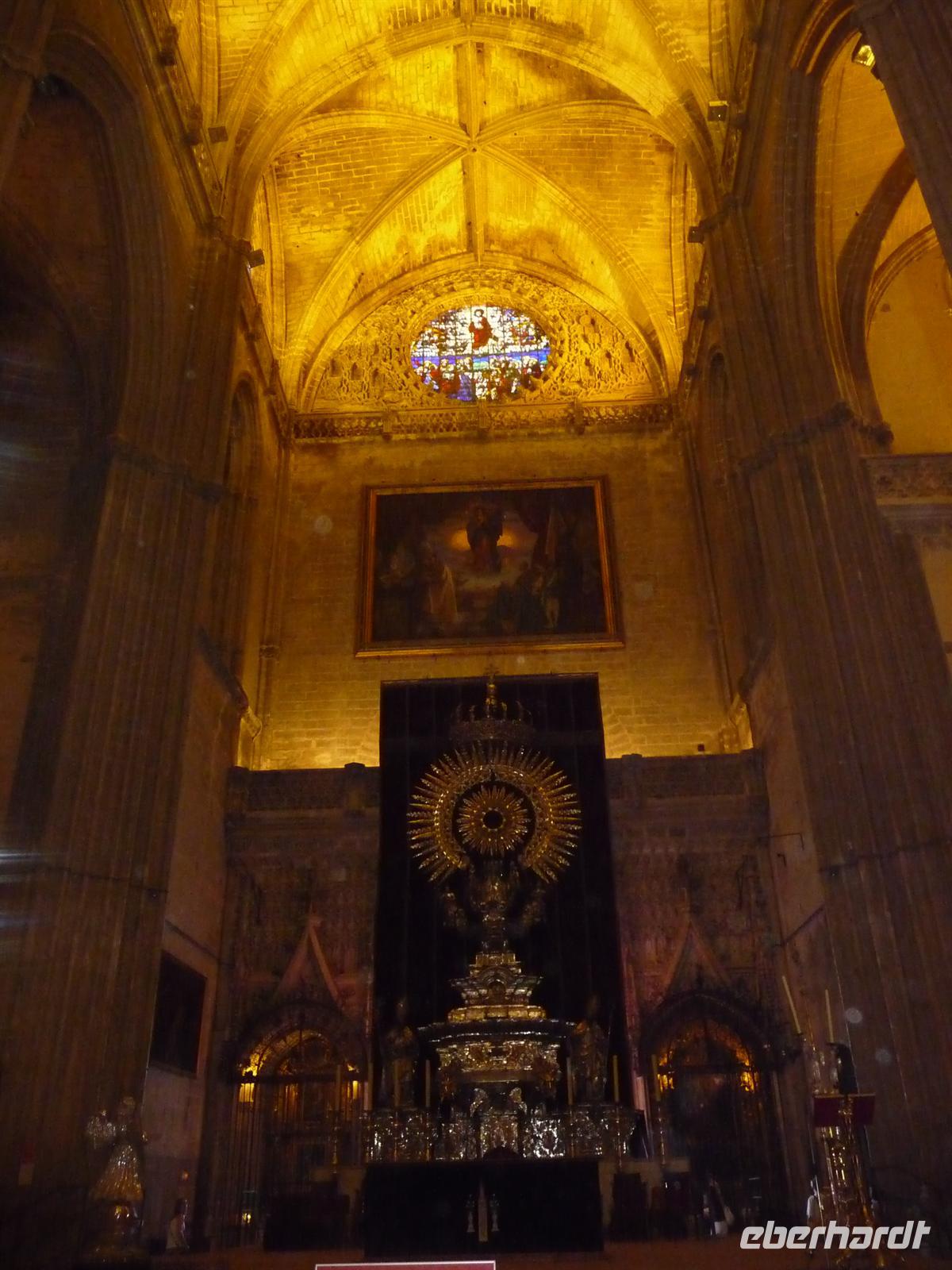 Wir gingen im Anschluss Mittagessen und verköstigten wieder kleine Häppchen in den Tapas-Bars. Wir probierten die empfohlenen bodenständigen Gerichte wie Salmorejo (kalte Tomatensuppe) und Flamenquin (gerollter Um 13 Uhr begann unsere Führung mit Julia durch die schönen Gärtenanlagen und volkstümliche Viertel zur Kathedrale Santa Maria de la Sede und dem königlichen Palast. Die Kathedrale von Sevilla ist die größte gothische Kathedrale der Welt und beherbergt den höchsten Blattgold-Altar. In ihr befindet sich auch der Sarkophag, welches die Gebeine von Christoph Kolumbus beinhalten sollen. Das Grabmal wird von vier männlichen Gestalten getragen, welche die Königreiche Navarra, León, Aragón und Kastilien symbolisieren.