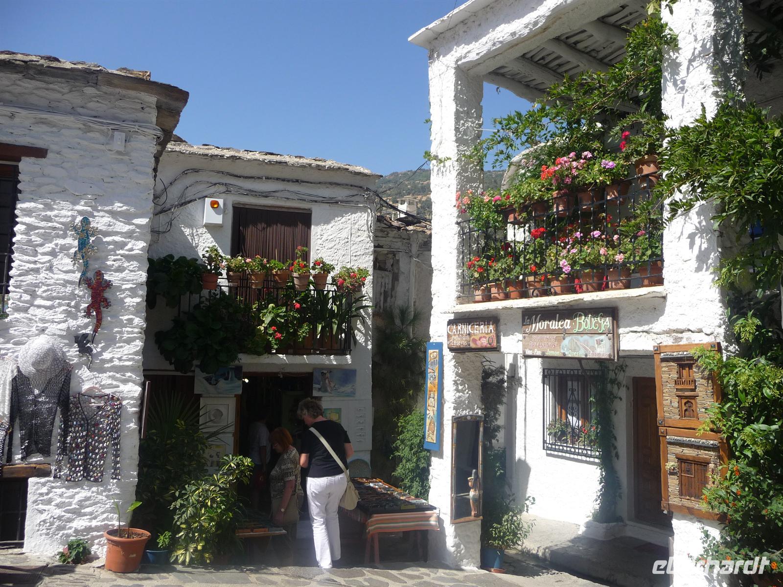 Wir begeben uns im Anschluss nach Pampaneira, einem reizenden kleinen Dorf, welcher zur Ortschaft „El Barranco de Poqueira“ gehört. Die weißgetünchten Häuschen mit bunten blumenbepflanzten Balkonen, flachen Dächer und die fast unberührte Natur der Berglandschaft verschaffen eine unglaublich idyllische und ruhige Atmosphäre. Wir spüren sofort den kunsthandwerklichen Reichtum des Dörfchens. Die engen Gassen, zahlreichen Teppich- und Schmuckläden sowie die Künstler, die an ihren Straßenständen ihre Geschicklichkeit bei der Herstellung von kleinen Figuren zeigen, laden zum Verweilen ein.