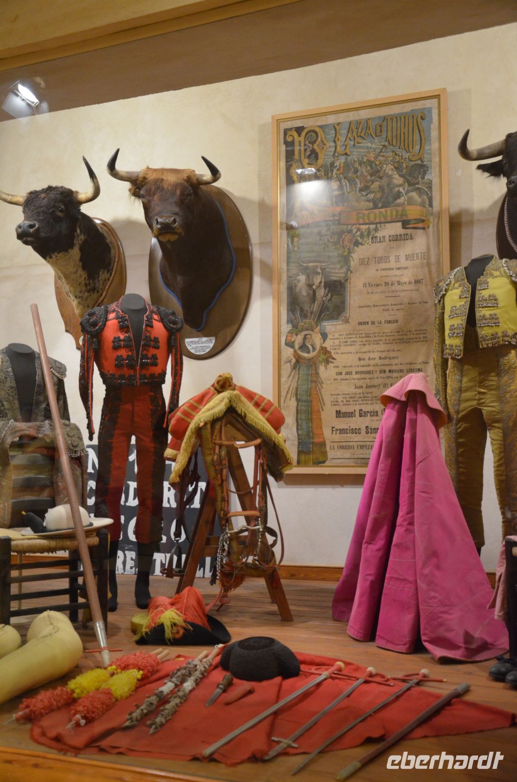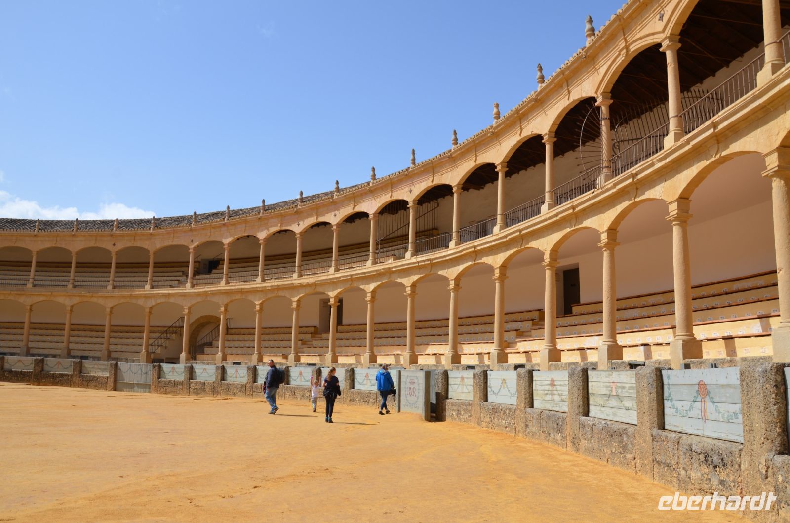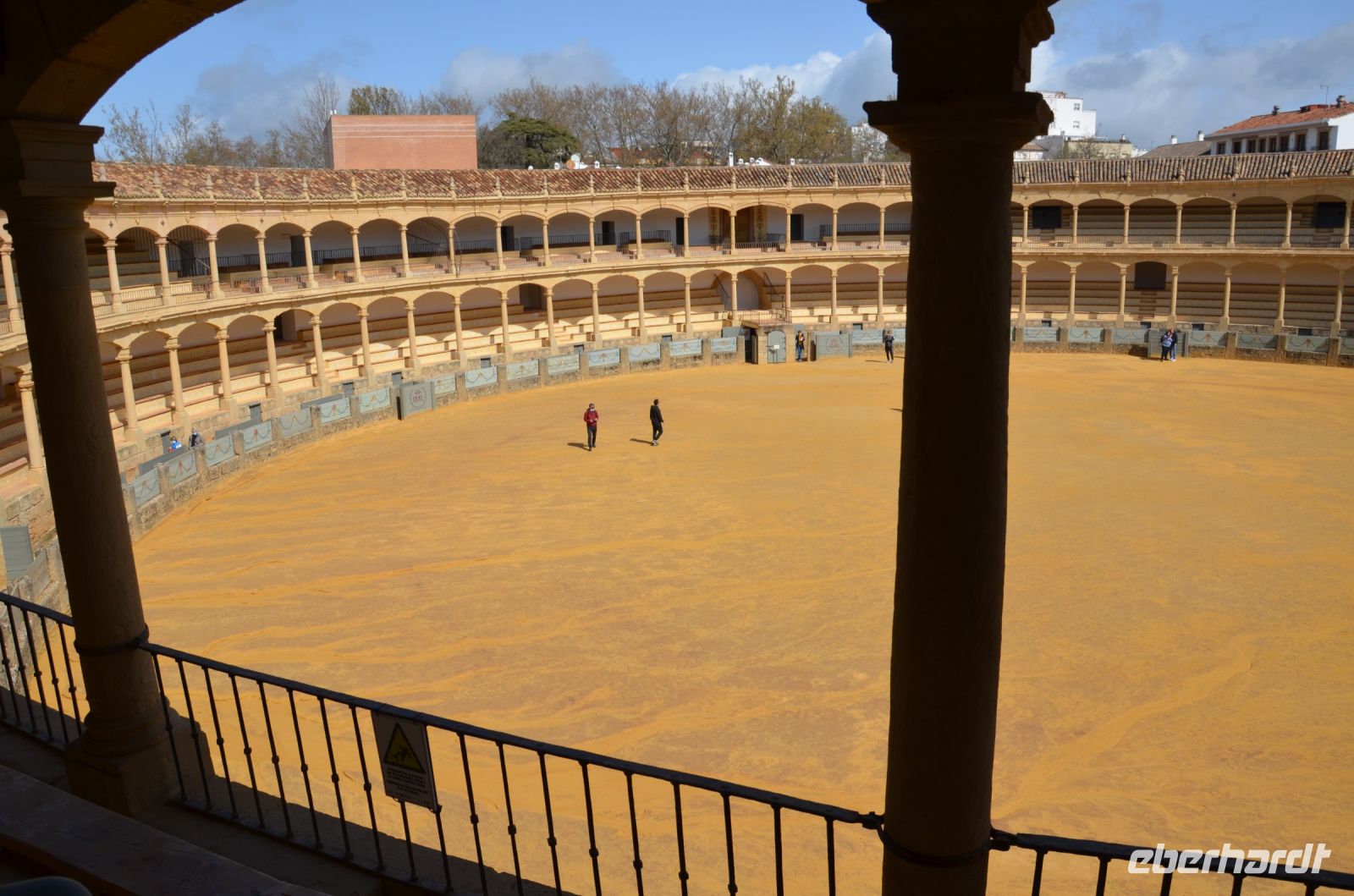 Als eine der ältesten Städte Spaniens, thront Ronda gebührend auf einem mächtigen Felsplateau und steht als Beispiel für die bekannten „weißen Dörfer“. Alleinstellungsmerkmal ist hier die mit Kalkwasser weißgetünchte Fassade, die besonders in den heißen Sommermonaten vor zu großer Hitze schützen soll. Genau dieser Anblick und dessen Zauber ließ schon einige Literaten wie Rilke oder Hemingway länger in Ronda verweilen. Nun aber, meine Damen und Herren, zum Herzstück der Königin der weißen Dörfer. Ein weiterer Titel den Ronda trägt, ist die Wiege des Stierkampfes. Hierzu begeben wir uns in eine der ältesten Stierkampfarenen des Landes – die Plaza de Toros de Ronda. Erbaut von José Martin de Aldehuela mit dem Baubeginn von 1783 bietet sie 6.000 Zuschauern Platz und beherbergt zudem die älteste Hofreitschule Europas. Nach der Besichtigung des Museums sitzen wir auf den Rängen der Arena und lauschen gespannt Herrn Stachels Ausführungen. Derartig viele Fragen und somit derartiges Interesse zu den einzelnen Aspekten des Stierkampfes gab es vorher noch nicht. Auch, wenn die Meinungen über diese Tradition weit auseinander gehen, ist es doch ein sehr faszinierendes Thema! Wer hätte gedacht, dass ein schwarzer Stier preislich bei 25.000 Euro startet, sein Fleisch tatsächlich nach dem Kampf verwertet wird und die Tracht eines Toreros ein wahres Vermögen kostet?! Zum Abschluss schreiten wir in die Arena und machen zumindest ein friedliches Gruppenfoto. Anschließend begeben wir uns auf den Hemingway Spaziergang Richtung Altstadt. Immer mit Blick auf die Schlucht „El Tajo“ und den darin fließenden Fluss „Río Guadalevín“. Dazu überqueren wir die „Puente Nuevo“, eine von drei Brücken, die über die Schlucht führen. Als Wahrzeichen der Stadt, ist sie die prächtigste der drei Brücken, erbaut vom gleichen Architekten wie die Stierkampfarena in rund 50 Jahren Bauzeit.