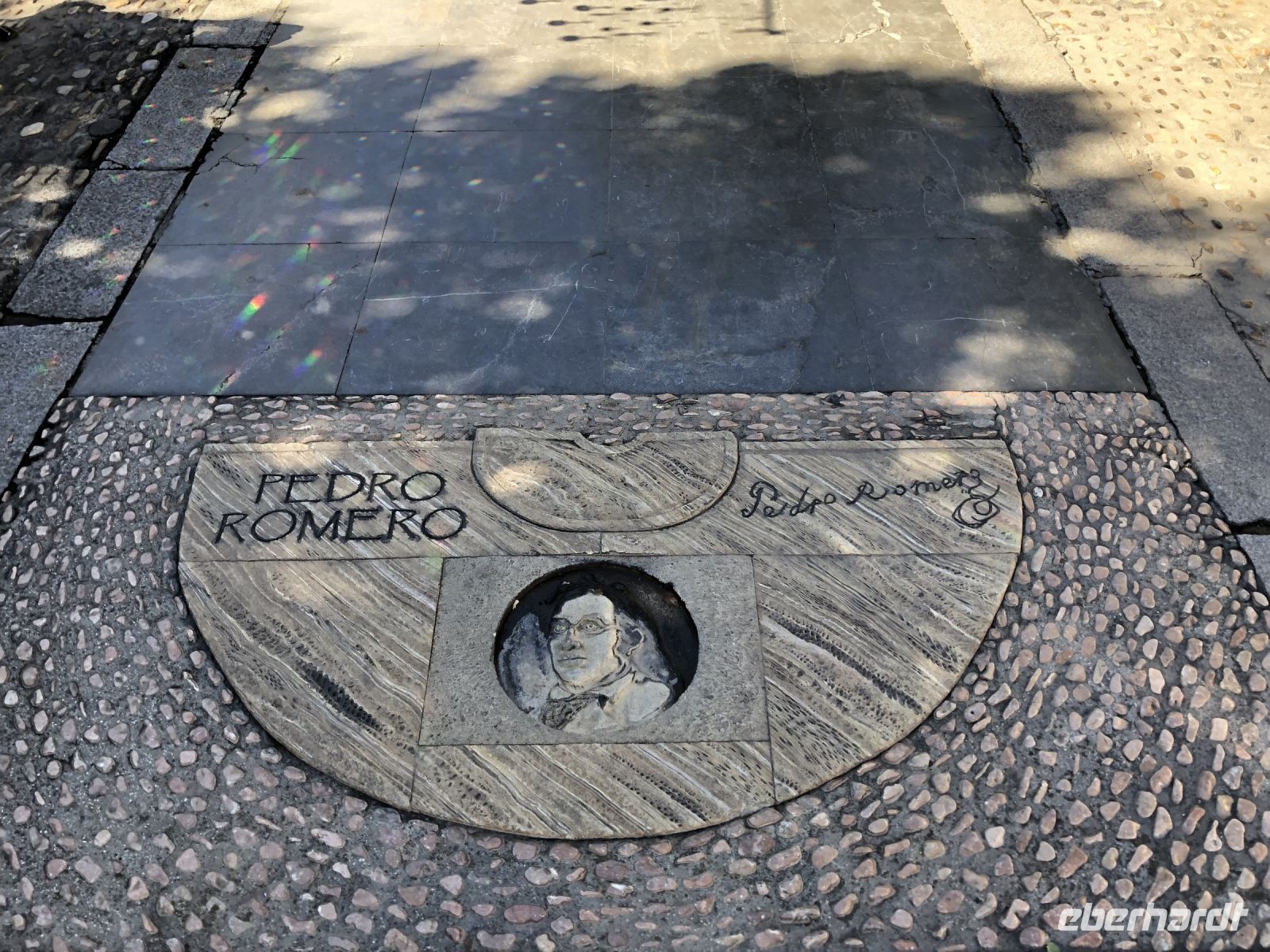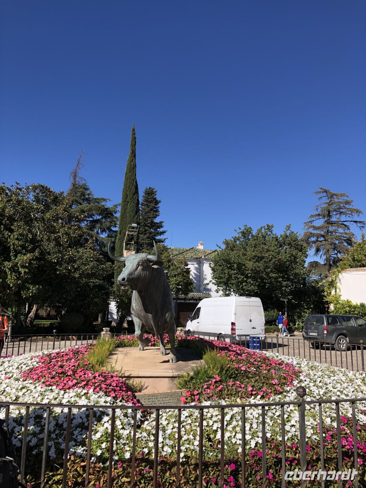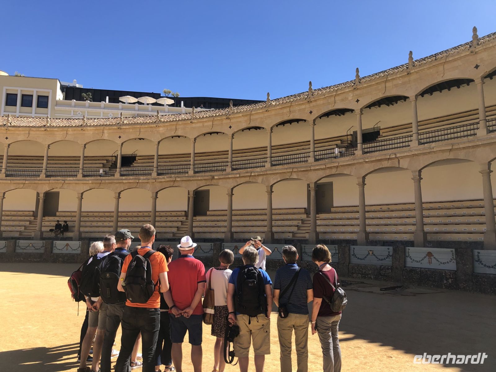 In der Stierkampfarena legten wir wie immer eine Verschnaufpause ein. Wir schauten auf den Platz mit dem leuchtend gelben Sand, wo vor ein paar Tagen noch ein Goyesca-Stierkampf stattfand, den 1954 die Familie Ordóñez anlässlich des zweiten Jahrestages der Geburt von Pedro Romero einführte. Dieser Stierkampf wird mit der Dekoration, den Kostümen und den Geräten aus der Zeit von Francisco de Goya vorgeführt. Wir saßen auf den schattigen Rängen und lauschten den Worten Daniels, der uns den Ablauf des Stierkampfes erläutert, und uns teilhaben ließ an den Überlegungen, welche für aber natürlich auch gegen den Stierkampf sprechen.