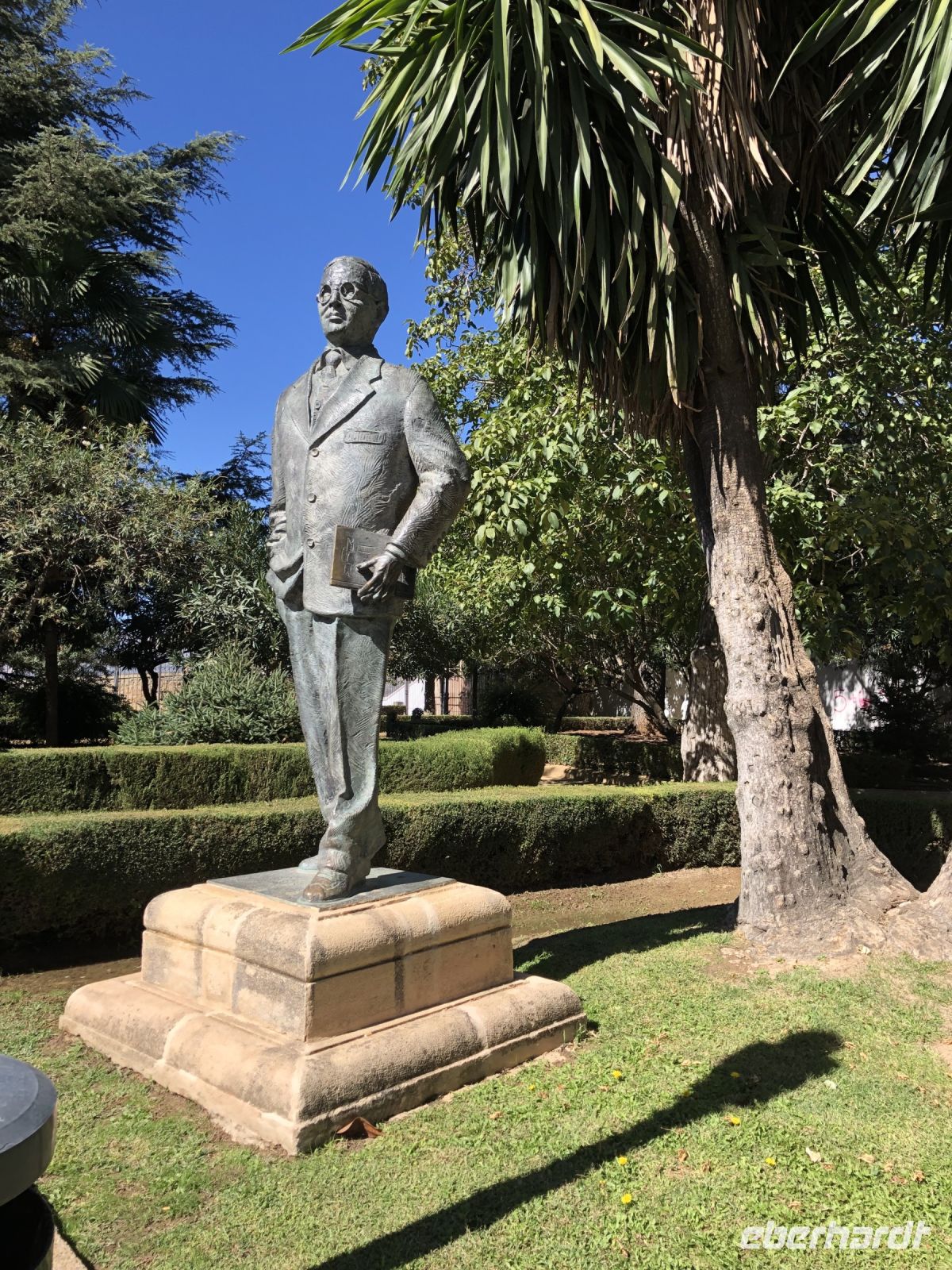Nur ein paar Schritte sind es von hier zum Plaza España. Groß, beeindruckend und weit sollte die halbrund angelegte Säulenhalle vor uns liegen. Oft wird der Spanische Platz mit einer riesigen Umarmung beschrieben, die ganz Spanien umfasst und sich zum Fluss Guadalquivir hin öffnet – offen in Richtung Amerika. Diese grandiose Idee stammte von dem Architekten Aníbal Gonzalez, der ganz Sevilla mit seinem regionalistischen Stil prägen sollte. Doch plötzlich stehen wir vor verschlossenen Gittern. Der Platz ist den ganzen September Kulisse für Konzerte und Kulturveranstaltungen. Wundervoll, nur wir kamen nun nicht in den Genuss, zum halbkreisförmigen Kanal zu schlendern oder uns auf eine der Bänke, auf denen die 48 spanischen Provinzen in Kacheln abgebildet sind, zu setzen. Auf die Zwillingstürme (Puerta de Aragón und Puerta de Navarra) schauten wir nur von weitem und auch die Bronzestatue des herausragenden Architekten Aníbal Gonzalez erblickten wir nur kurz. Wir nutzten den Schatten der Bäume, flanierten noch ein wenig durch den Parque de Maria Luisa und bestaunten die riesigen Ficusbäume (mit dem bezeichnenden deutschen Namen „Würgefeige“).