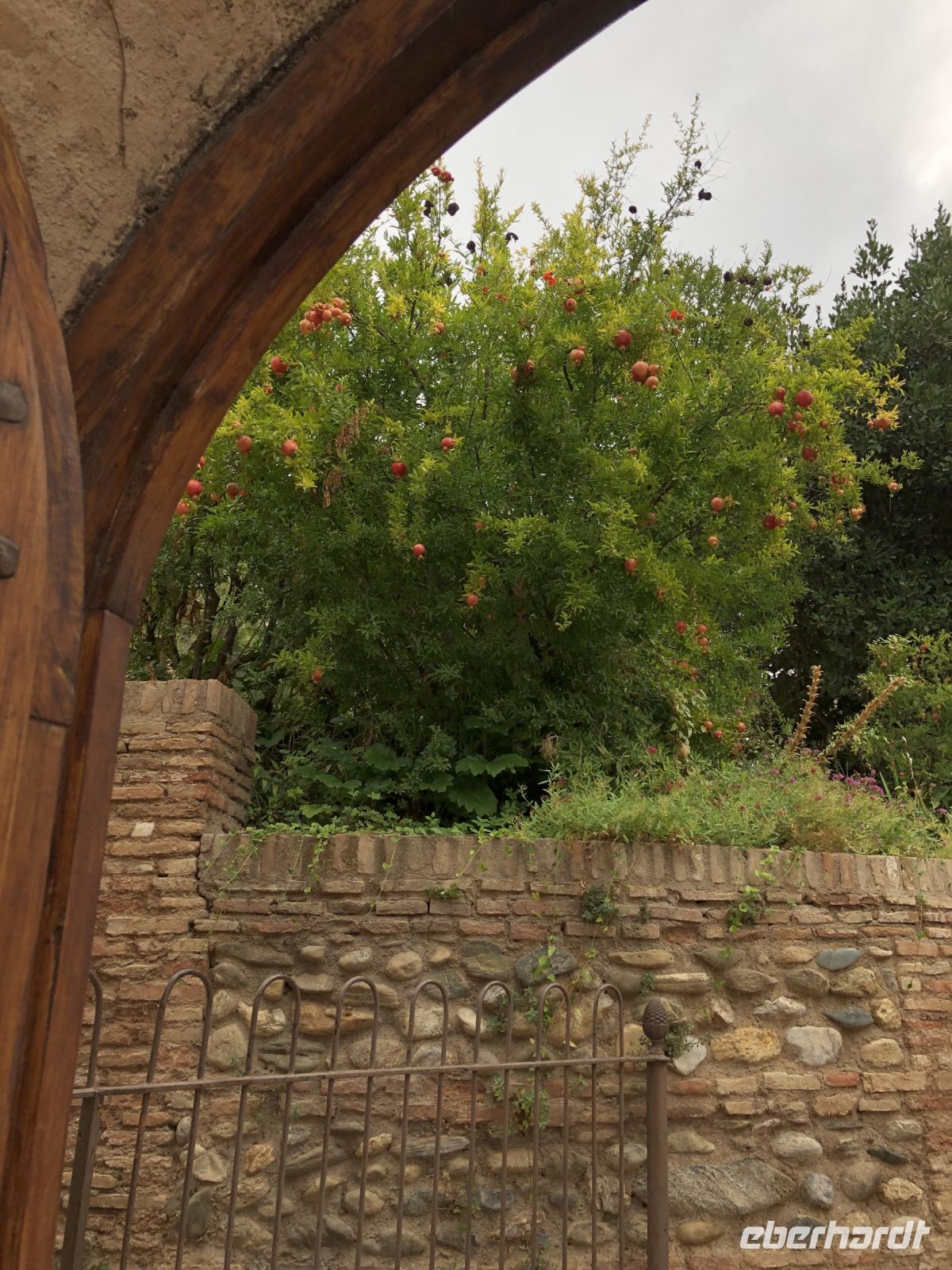 Am Eingang der „Roten Burg“ – der Kala al hambra auf dem Sabikah-Hügel gelegen, erwartete uns unser charmanter Guide Pedro. Wer konnte, zog noch schnell seine Jacke über, es war in den Bergen doch kühler als wir vermutet hatten. Dann folgten wir Pedro durch das Gedränge, vorbei an wartenden Menschen, die hofften, noch eine der begehrten Eintrittskarten zu ergattern. Wie durch ein Wunder standen wir schließlich an einem ruhigen Ort, schauten auf die märchenhafte Palastburg und erfreuten uns zugleich am ersten Granatapfelbaum mit seinen übergroßen Früchten, denen einer der vielen Legenden zufolge, die Stadt vielleicht auch ihren Namen Granada verdankt.
