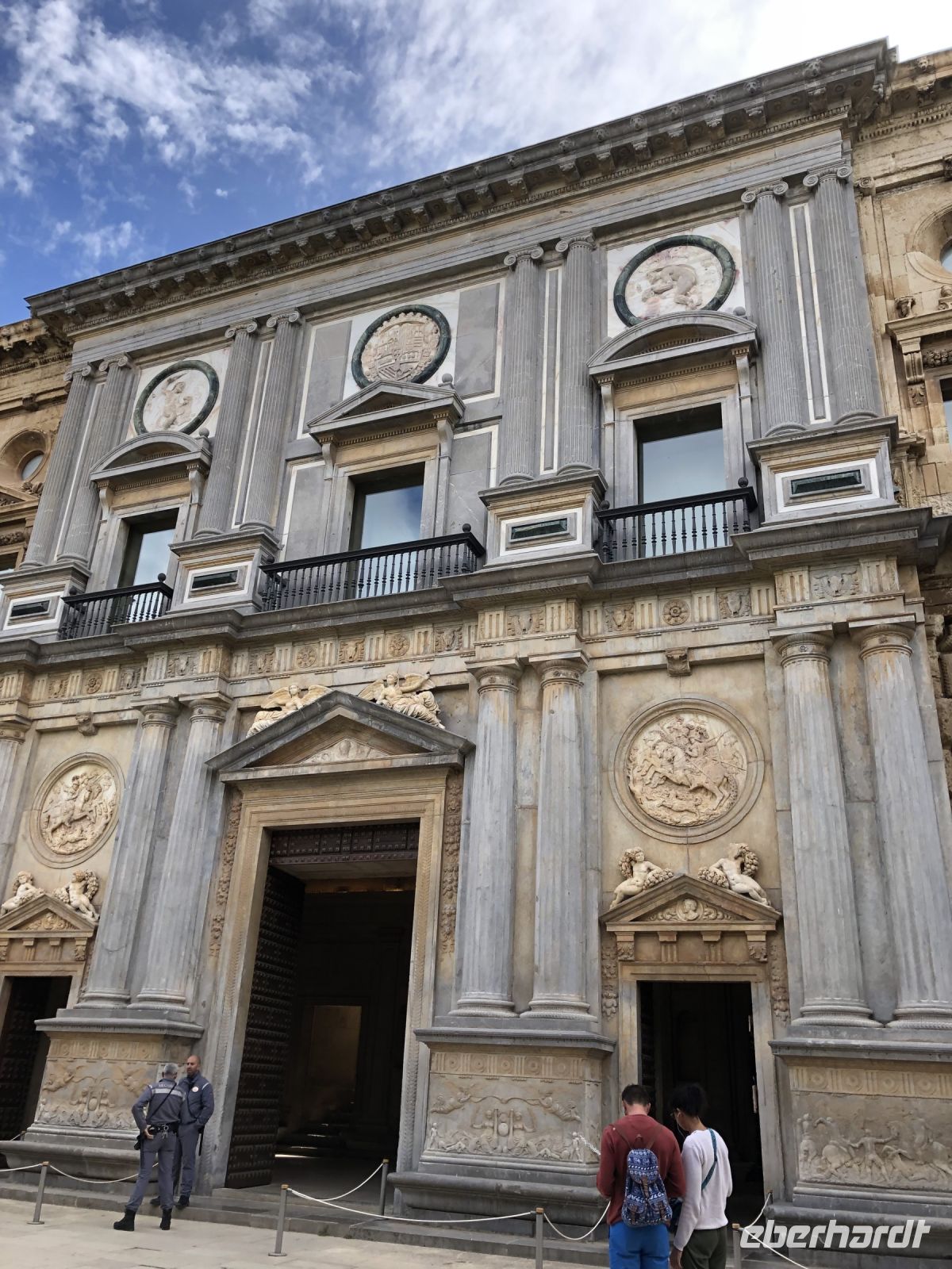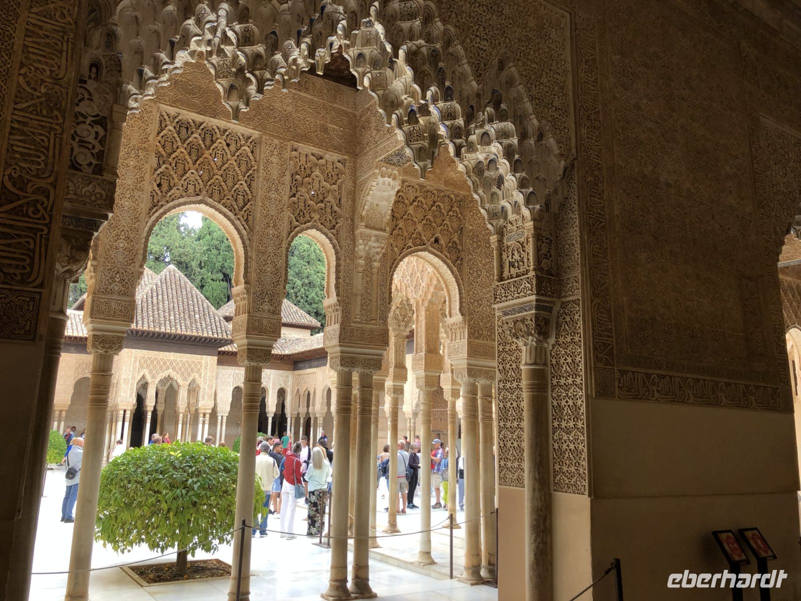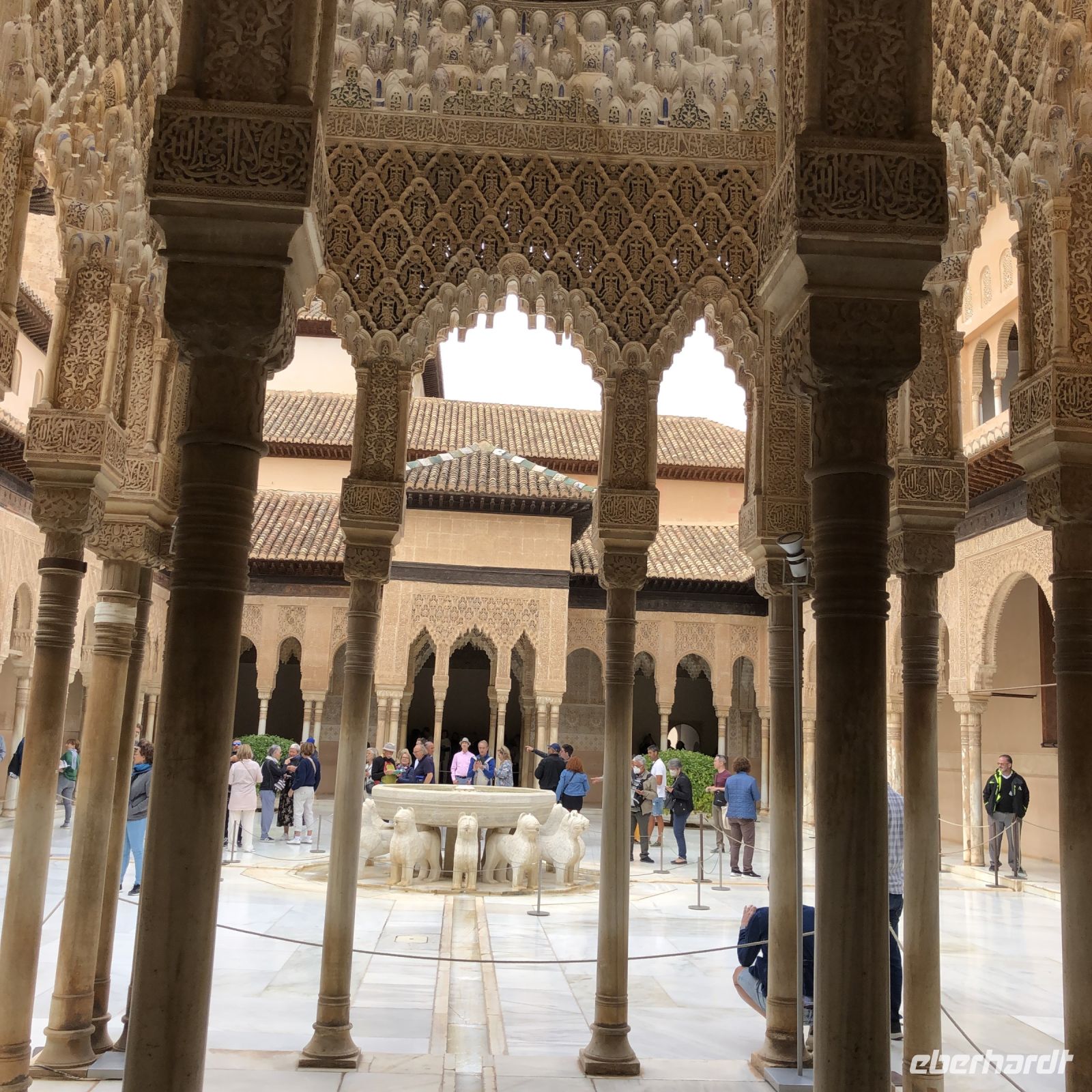 Wir warfen einen kurzen Blick in den Palast von Karl V., den ersten großen Königspalast der spanischen Monarchen und eines der schönsten Werke der Renaissance außerhalb Italiens. Nur den Sommer 1526 verbrachte Kaiser Karl V. in der Alhambra und verlegte seinen Hof in die königlichen Paläste, wo dann, der uns nur zu verständliche Wunsch des Kaisers entstand, Granada zu einem seiner Wohnsitze zu machen, was jedoch nie passierte. Der Plan des neuen Palastes sah größeren Komfort und mehr Platz als der maurische vor, war aber mit diesem verbunden, denn so konnte er ihn weiterhin genießen. Auch wir erfreuten uns an all den kleinen und großen Details, an der Anlage, in der sich eigentlich noch mehr Paläste verbergen: z.B. El Mexuar, der Palast von Comares oder von Yusuf I. und den Palast der Löwen oder von Mohammed V. Verbunden sind die einzelnen Trakte durch den Myrten- und Löwenhof mit schlanken Säulen und mit einem Brunnen in seiner Mitte, welcher immerwährendes Fotomotiv ist. Stalaktitenkuppeln, hauchfeine Ornamente und Deckenfresken zeigten uns die Raffinesse der islamischen Baukunst. Wie viele Arbeiter arbeiteten wohl an diesem grandiosen Bauwerk?
