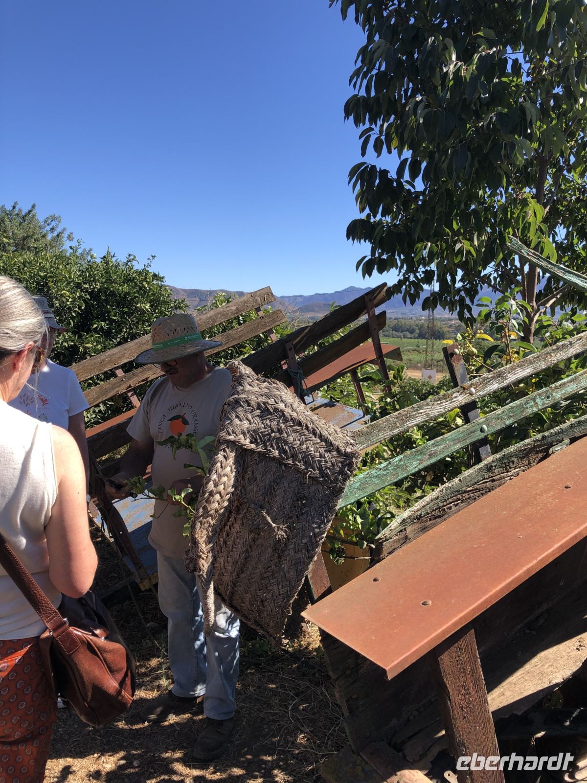 Scherzend und gut gelaunt erwartete uns am Nachmittag Juanito Orange, der eigentlich Juan Moreno Navarro heißt und einige Jahre in Deutschland gelebt hat. Mit viel Humor lernten wir die Vielfalt der Zitrusfrüchte kennen. - Nicht nur theoretisch, sondern auch praktisch mit Verkostungen von Kumquat bis Kaviarlimette, von Mandarine bis hin zu den unterschiedlichsten Orangen war alles dabei. „Follow me“ war immer wieder von ihm zu hören und das die alten Früchte für die englische Gruppe aufgehoben werden müssten. Der erste entstandene Sonnenbrand wurde mit frischer Aloe Vera „behandelt“ und zwischendurch zeigte er uns das Nest einer Gottesanbeterin, die als natürliche Plagenkontrolle, als biologische Schädlingsbekämpfer eingesetzt wird. Über Vitamin C – Mangel konnte sich unser Körper an diesem Tag bestimmt nicht beklagen. Auf der Terrasse endete die Tour mit einem Glas frischgepressten Orangensaftes und viele Gäste kauften im Hofladen Fruchtaufstriche, Honig oder Aloe Vera aus eigener Herstellung. Auf Verjüngung durch die Produkte hoffend, stiegen wir lachend in den Bus, der uns sicher zum Hotel brachte, wo der Abend gemütlich ausklang.