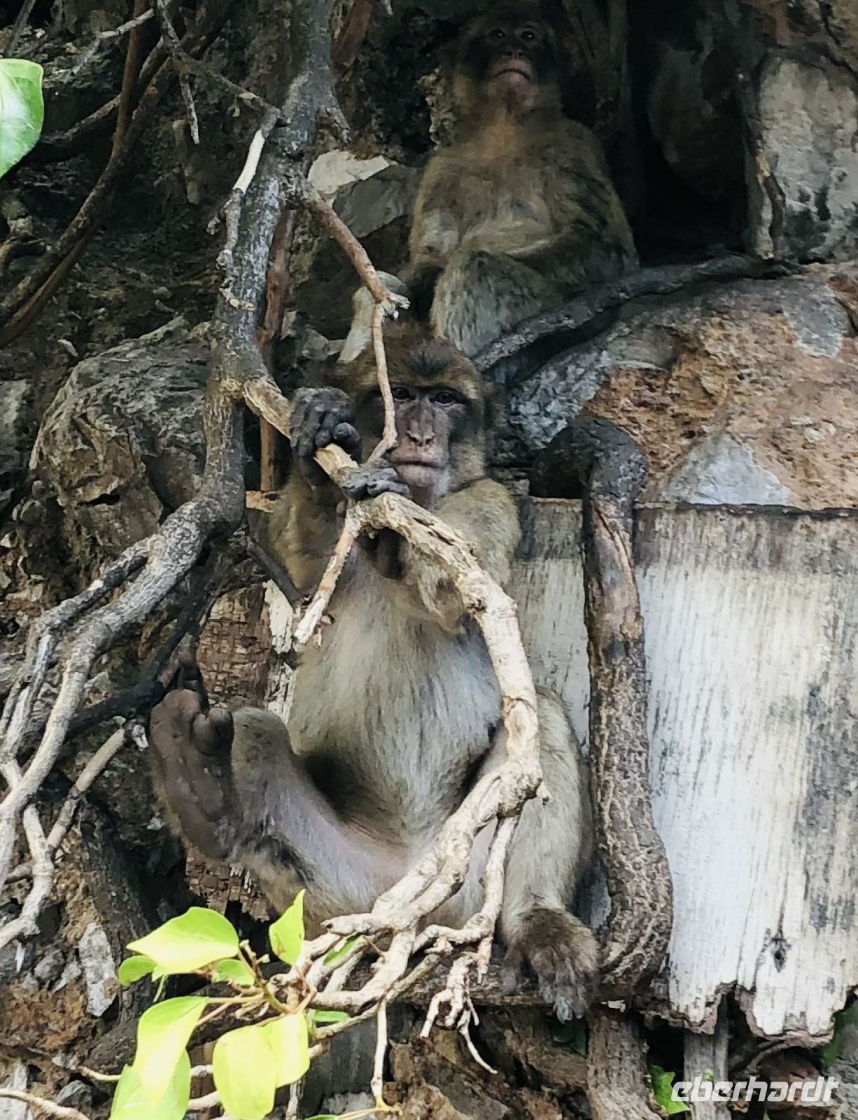 Auf kleinen engen Straßen ging es in zügigem Tempo hinauf zur St. Michaels Cave. Die ersten Berberaffen warteten schon darauf als Fotomodell für die Touristen zu posieren. Doch die Höhle des Heiligen Michael wartete… Fundstelle von Schädeln älter als der des Neandertalers, Picknickplatz im 19. Jhd., Lazarett während der Kriege und lange Zeit glaubte man zudem, sie sei bodenlos. Deshalb entstand wahrscheinlich die Geschichte, dass der Felsen von Gibraltar durch einen unterirdischen Gang mit Afrika verbunden war und so auch die berühmten Makaken nach Gibraltar gekommen sein sollten.