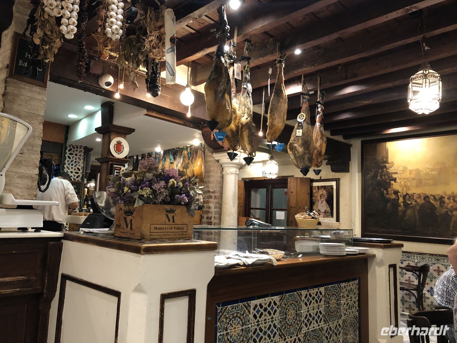 Die Nächte sind lang ins Sevilla, das Abendessen dementsprechend spät. Am Abend bekamen wir bei unserem Spaziergang durch das Barrio de Doña Elvira, benannt nach der Tochter des Kanzlers López de Ayala und Ehefrau von Alvar Pérez de Guzmán zum Restaurant „Casa Romana“ einen Vorgeschmack auf die kleinen, engen Gassen, die so typisch in Andalusien sind. Im rustikalen Ambiente mit mehreren Iberischen Schinken an der Decke hängend, ließen wir uns die vielen Tapas-Gänge munden. Mit großer Neugierde probierten Alle auch das ein oder andere unbekannte Gericht.