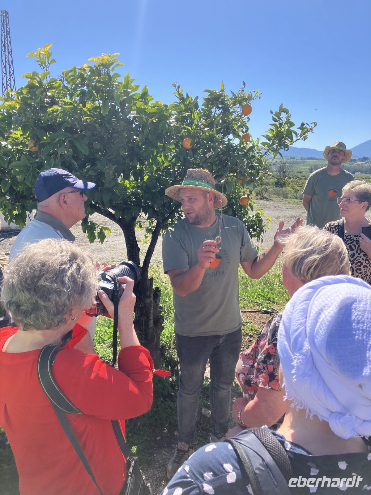 Am Nachmittag erwartete uns ein ganz besonderes Erlebnis: der Besuch der Orangenplantage von Juanito Orange. Inmitten von duftenden Orangenhainen empfingen uns die jungen, enthusiastischen Guides Rubén und David, die uns mit viel Humor und Leidenschaft durch die Welt der Zitrusfrüchte führten. Wir durften verschiedene Sorten direkt vom Baum gepflückt verkosten – von saftig-süßen Orangen bis hin zu exotischem Zitronenkaviar, einer Frucht, die beim Zerbeißen kleine, perlenartige Zitrusperlen freisetzt. Diese kleine Geschmacksexplosion begeisterte uns alle!