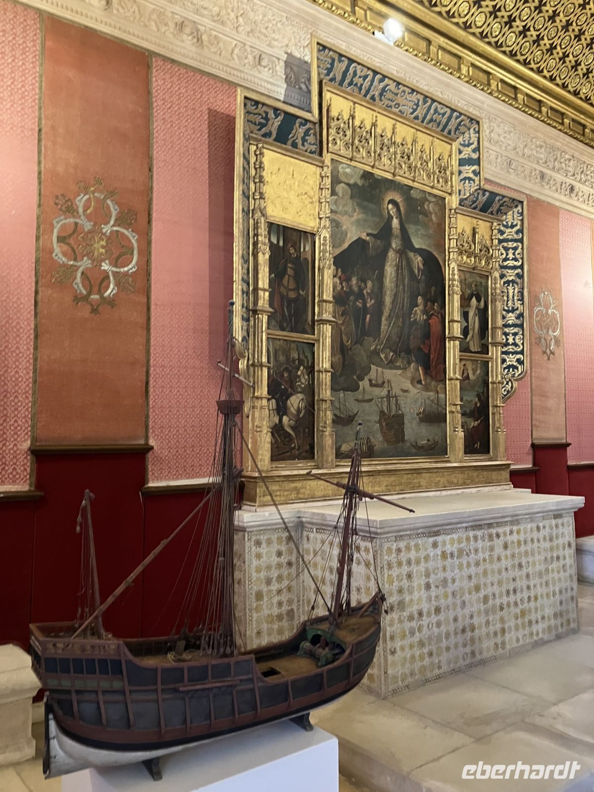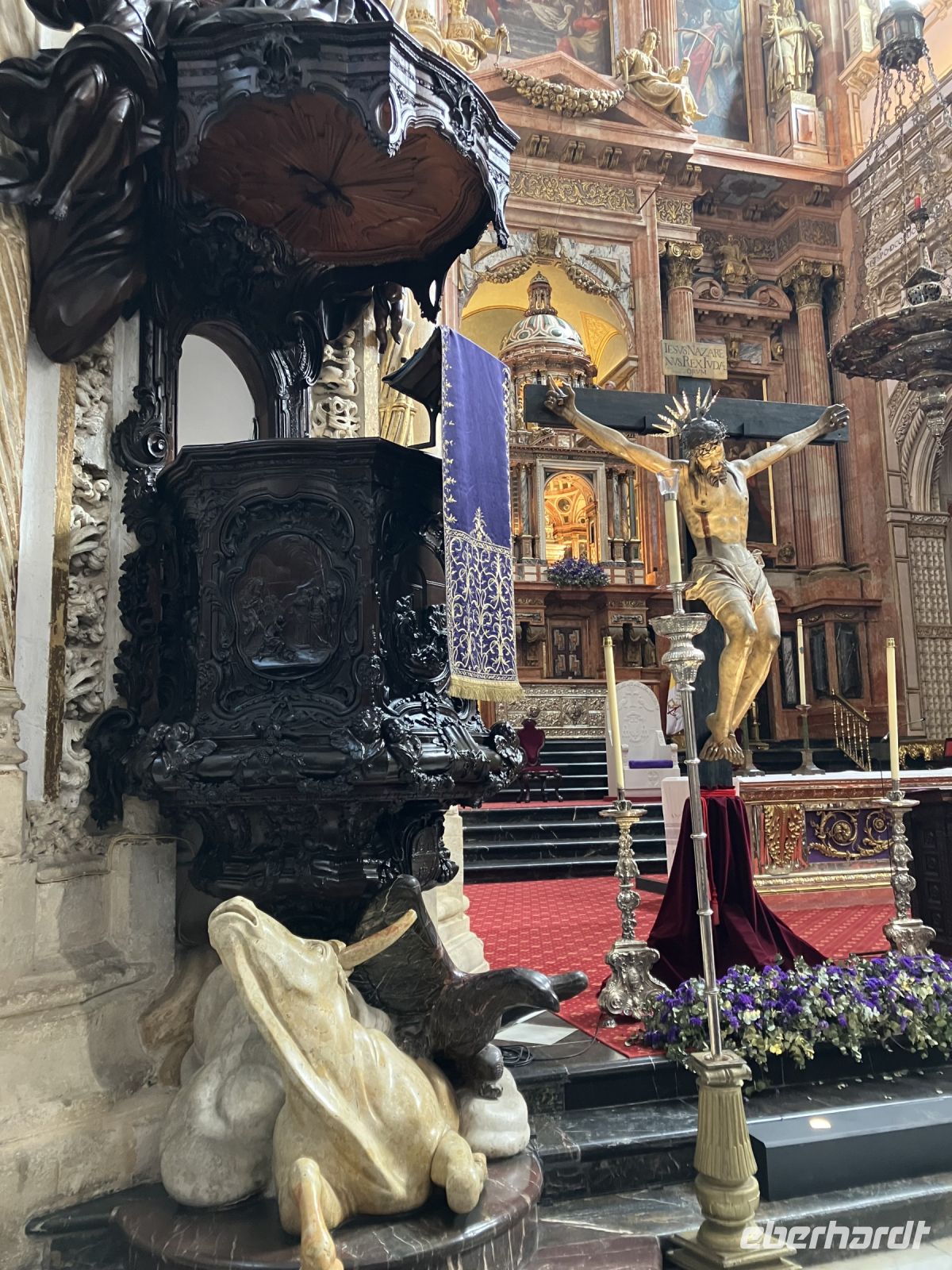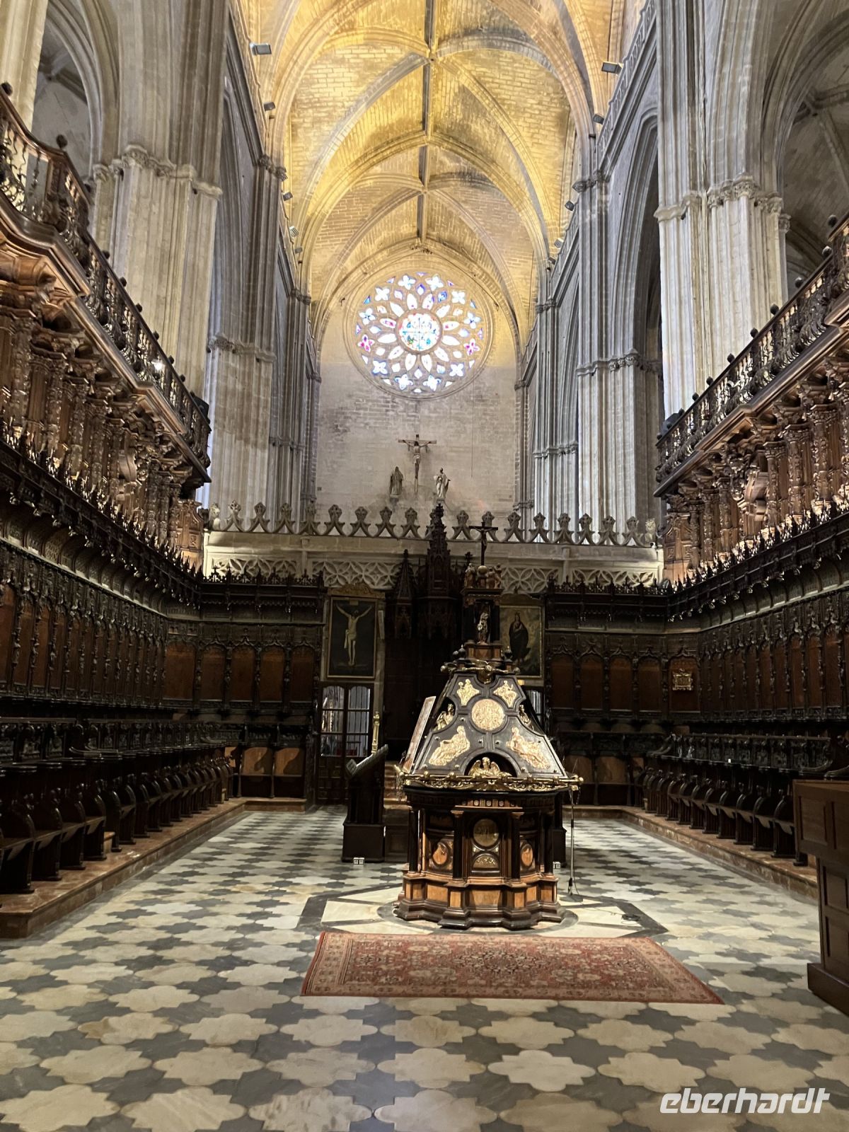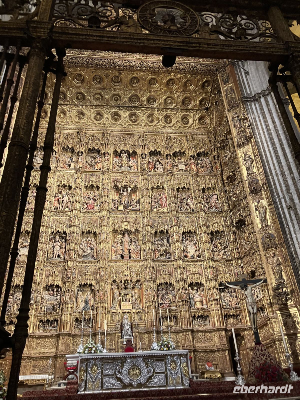 Gleich nebenan erhob sich ein weiteres Meisterwerk: die majestätische Kathedrale von Sevilla, eine der größten und eindrucksvollsten Kirchen der Welt. Beim Betreten des gigantischen Kirchenschiffs verschlug es uns fast die Sprache – die gewaltigen Säulen, das goldene Retabel des Hochaltars und die eindrucksvollen Glasfenster zeugten von der unermesslichen Pracht dieser gotischen Kathedrale. Wolfgang führte uns zu einem der berühmtesten Grabmäler: der Sarkophag Christoph Kolumbus’, der von vier überlebensgroßen Trägerfiguren bewacht wird.