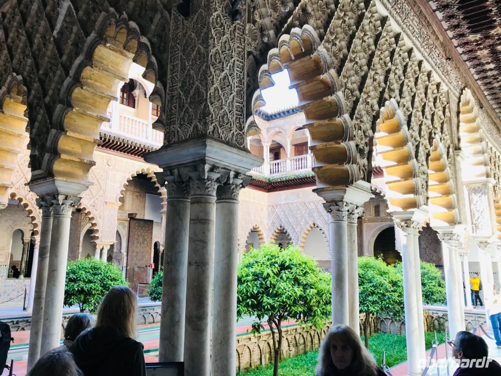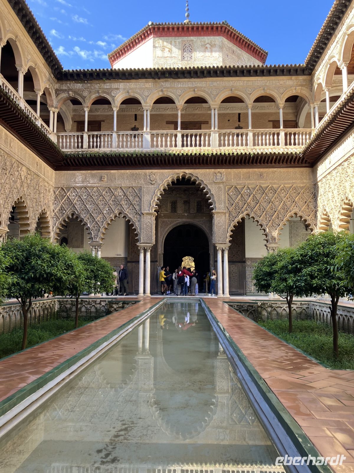 Unser erster Halt war ein wahres Juwel maurischer Architektur: der prächtige Alcázar von Sevilla. Schon beim Betreten des Palastes fühlten wir uns wie in eine andere Zeit versetzt. Die kunstvollen Hufeisenbögen, filigranen Stuckarbeiten und farbenprächtigen Azulejos (keramische Kacheln) erzählten von der ruhmreichen Epoche der islamischen Herrscher. Besonders beeindruckend war der Patio de las Doncellas, der mit seinem spiegelnden Wasserbecken und den grazilen Arkaden wie ein orientalisches Märchen anmutete. Auch die verwunschenen Gärten des Alcázar waren ein Erlebnis für sich – Palmen, duftender Jasmin und sanft plätschernde Brunnen luden zum Träumen ein. Kein Wunder, dass dieser Ort schon oft als Filmkulisse diente, unter anderem für die berühmte Serie Game of Thrones.