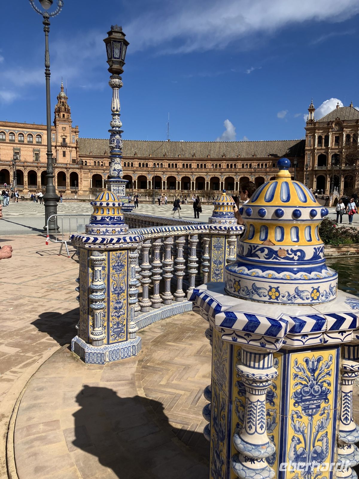 Nach einer erholsamen Mittagspause in den kleinen Restaurant, wo wir uns mit köstlichen Tapas stärkten, führte uns Sabine dann am Nachmittag zu einem der schönsten Plätze Europas: dem Plaza de España. Schon beim ersten Anblick waren wir sprachlos. Die halbkreisförmige Anlage, die von einem breiten Wasserkanal umgeben ist, strahlte eine unglaubliche Eleganz aus. Die kunstvoll verzierten Brücken, die prächtigen Säulenarkaden und die farbenfrohen Kachelbänke, die jede spanische Provinz darstellen, machten diesen Ort zu einem Meisterwerk architektonischer Harmonie. In der warmen goldenen Abendsonne wirkte der Platz fast surreal – wie eine romantische Filmszene aus einer anderen Epoche. Tatsächlich diente er bereits als Kulisse für große Hollywood-Produktionen, unter anderem für Star Wars: Angriff der Klonkrieger.