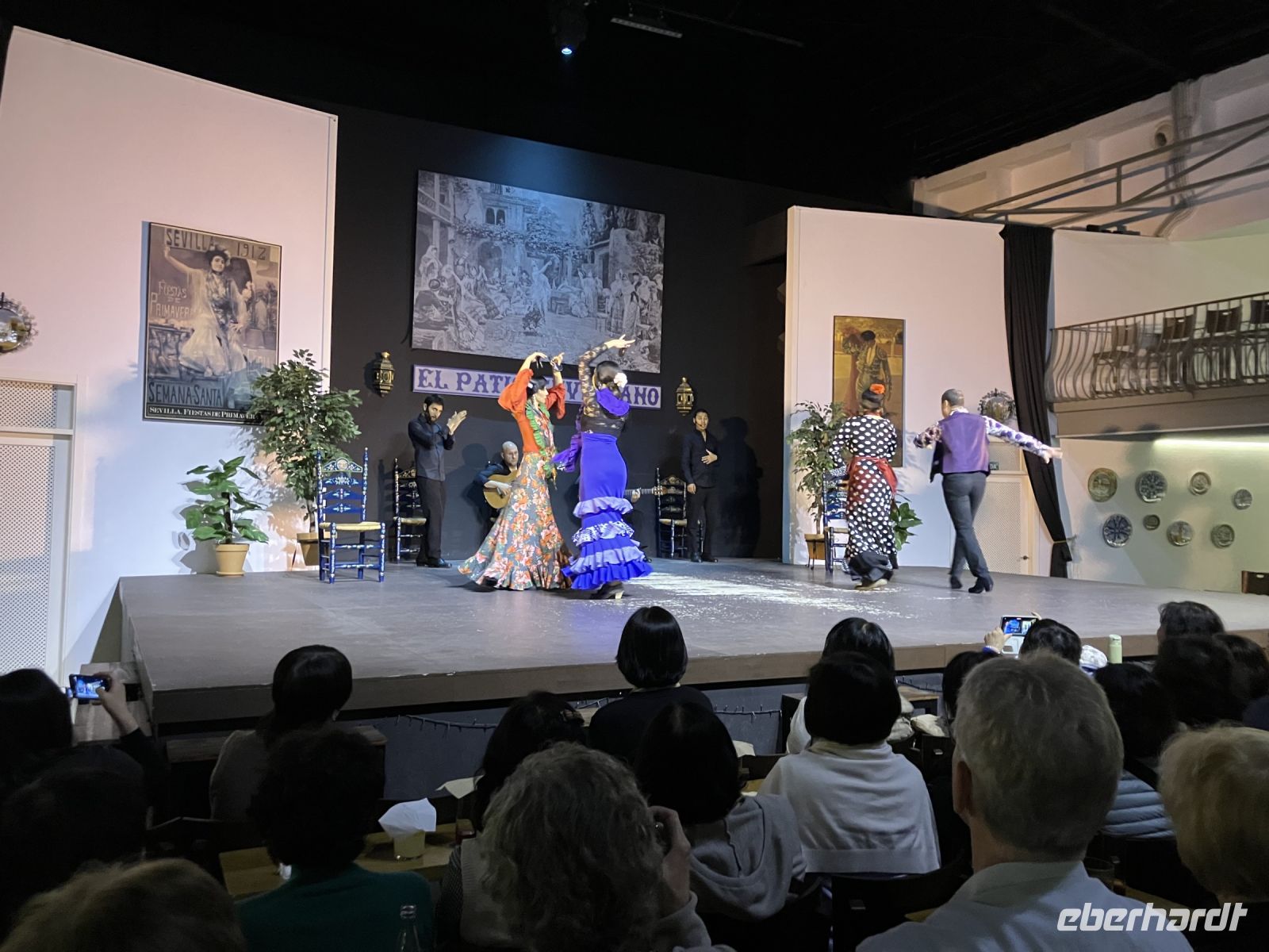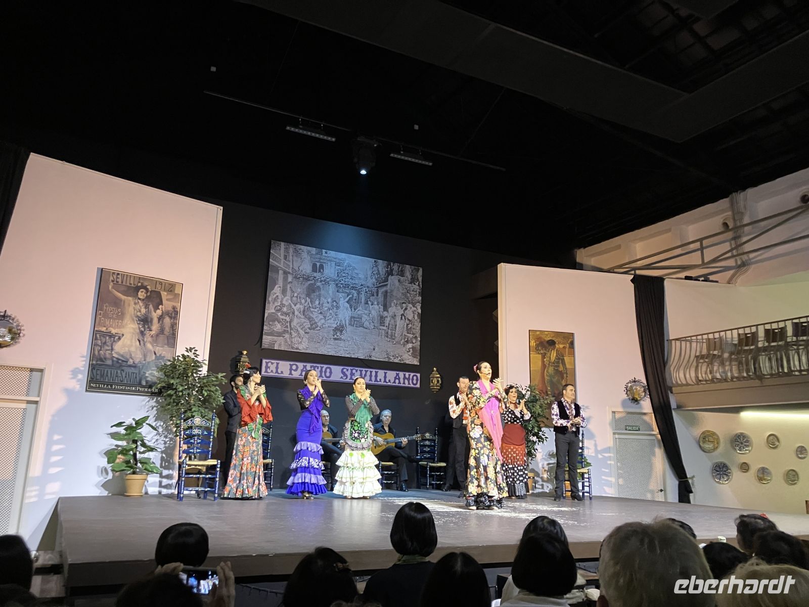 Doch noch ein Höhepunkt dieses ereignisreichen Tages wartete am Abend auf uns: eine traditionelle Flamenco-Show. In dem Tablao El Patio Sevillano, versammelten wir uns gespannt und warteten auf den Beginn der Darbietung. Als die ersten Gitarrenklänge erklangen, liessen uns erst die Tänzer und dann die Sänger mit ihren einprägsamen Stimmen in die Welt des Flamenco eintauchen. Dann betraten die Tänzerinnen die Bühne – mit kraftvollen Schritten, stolzer Haltung und einem Blick, der vor Leidenschaft brannte. Ihre Röcke wirbelten durch die Luft, während ihre Füße mit atemberaubender Geschwindigkeit auf das Holz schlugen. Die Intensität der Musik, die feurigen Rhythmen und die tiefen Emotionen, die in jedem einzelnen Schritt lagen, hinterließen uns sprachlos. Man musste diesen Moment nicht verstehen – man konnte ihn fühlen.
