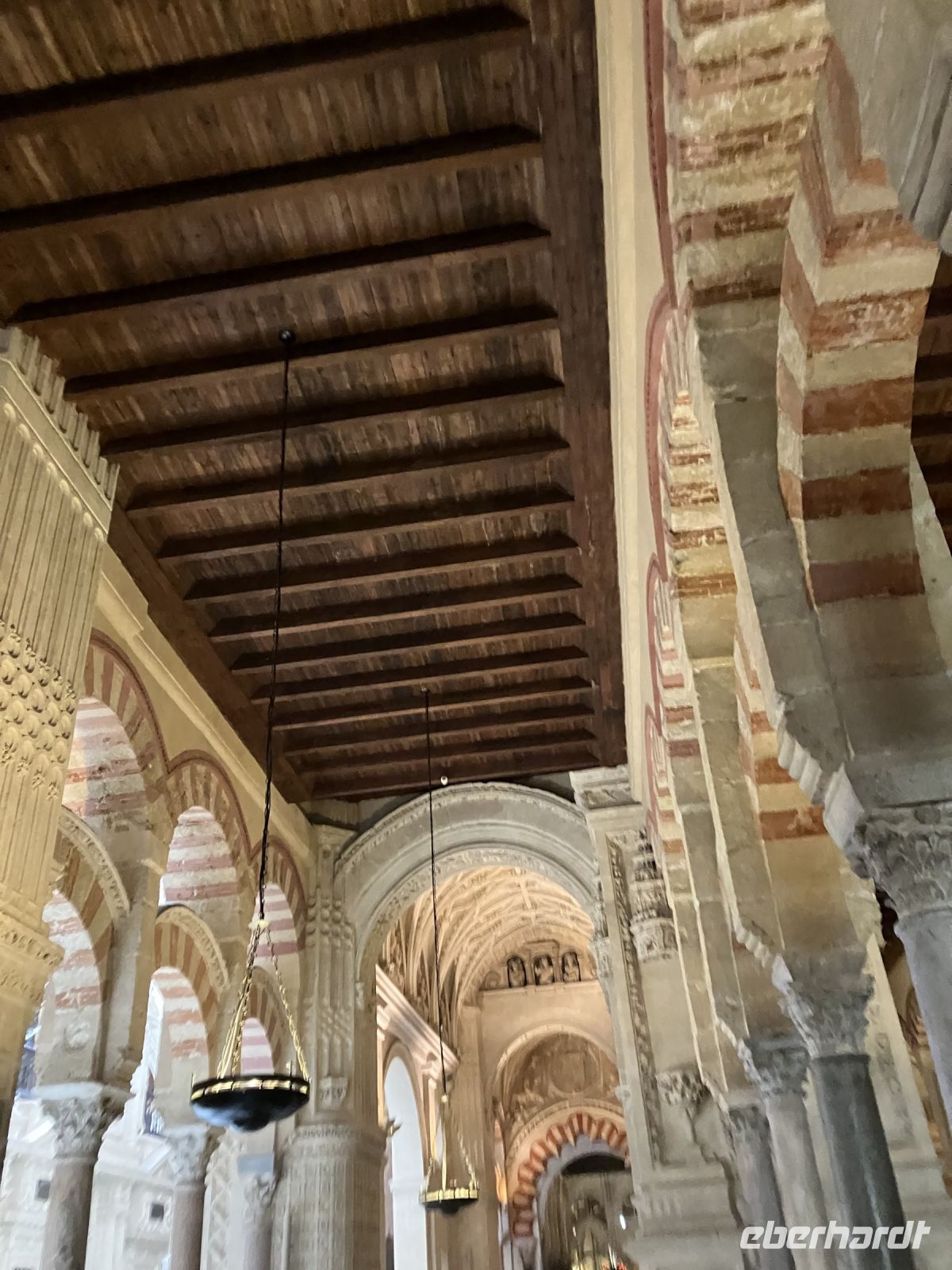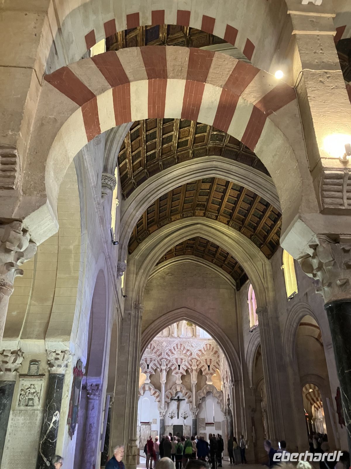 Vor uns erstreckte sich ein endlos erscheinender Wald aus Säulen, die in gleichmäßigen Reihen angeordnet waren. Die berühmten Hufeisenbögen mit ihren rot-weißen Ziegeln schufen eine hypnotische Symmetrie, die den Raum fast unwirklich wirken ließ. Jeder Schritt hallte in der Stille wider, während das warme Licht durch kunstvoll verzierte Fenster fiel und die Atmosphäre in ein sanftes, goldenes Schimmern tauchte.