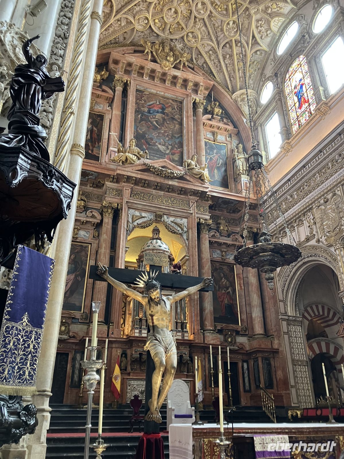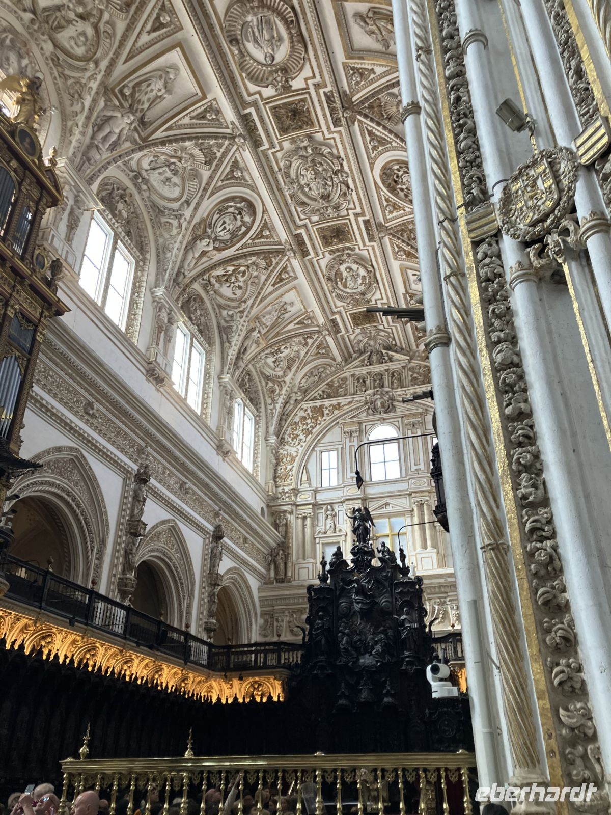 Unser lokaler Reiseführer Miguel erklärte uns, dass dieses monumentale Bauwerk einst als Moschee errichtet wurde – eine der prächtigsten des islamischen Spaniens. Doch als die Christen Córdoba im 13. Jahrhundert zurückeroberten, wurde inmitten dieses beeindruckenden Gebäudes eine gotische Kathedrale errichtet. Die Mischung aus islamischer und christlicher Architektur war faszinierend: Während sich die maurischen Arkaden in endlosen Reihen erstreckten, erhob sich plötzlich das majestätische Kirchenschiff der Kathedrale mit seinen hohen Gewölben und kunstvollen Altären. Ein Symbol für die wechselvolle Geschichte Andalusiens – und für das friedliche Nebeneinander zweier Kulturen, das hier in Stein gemeißelt war.