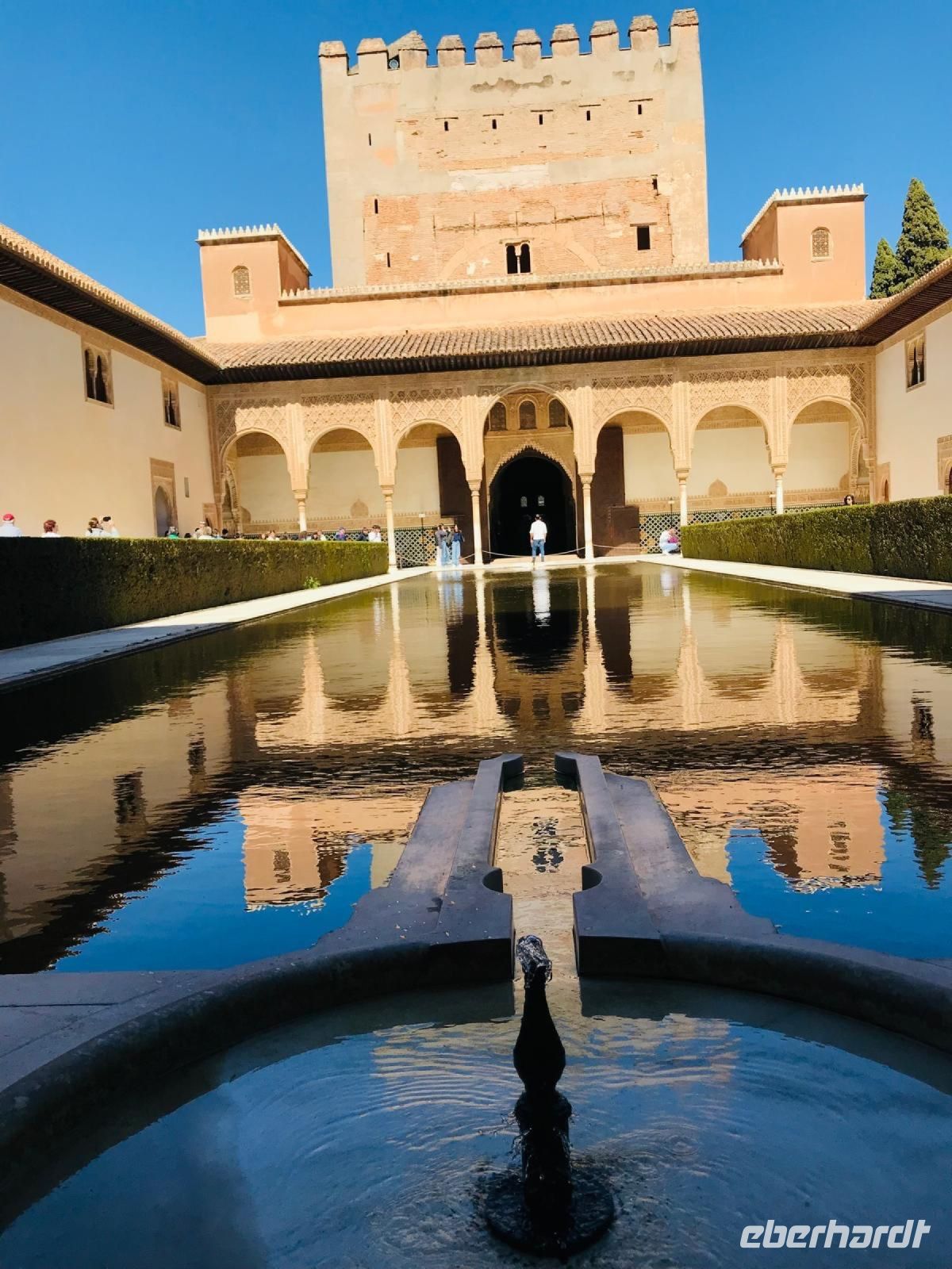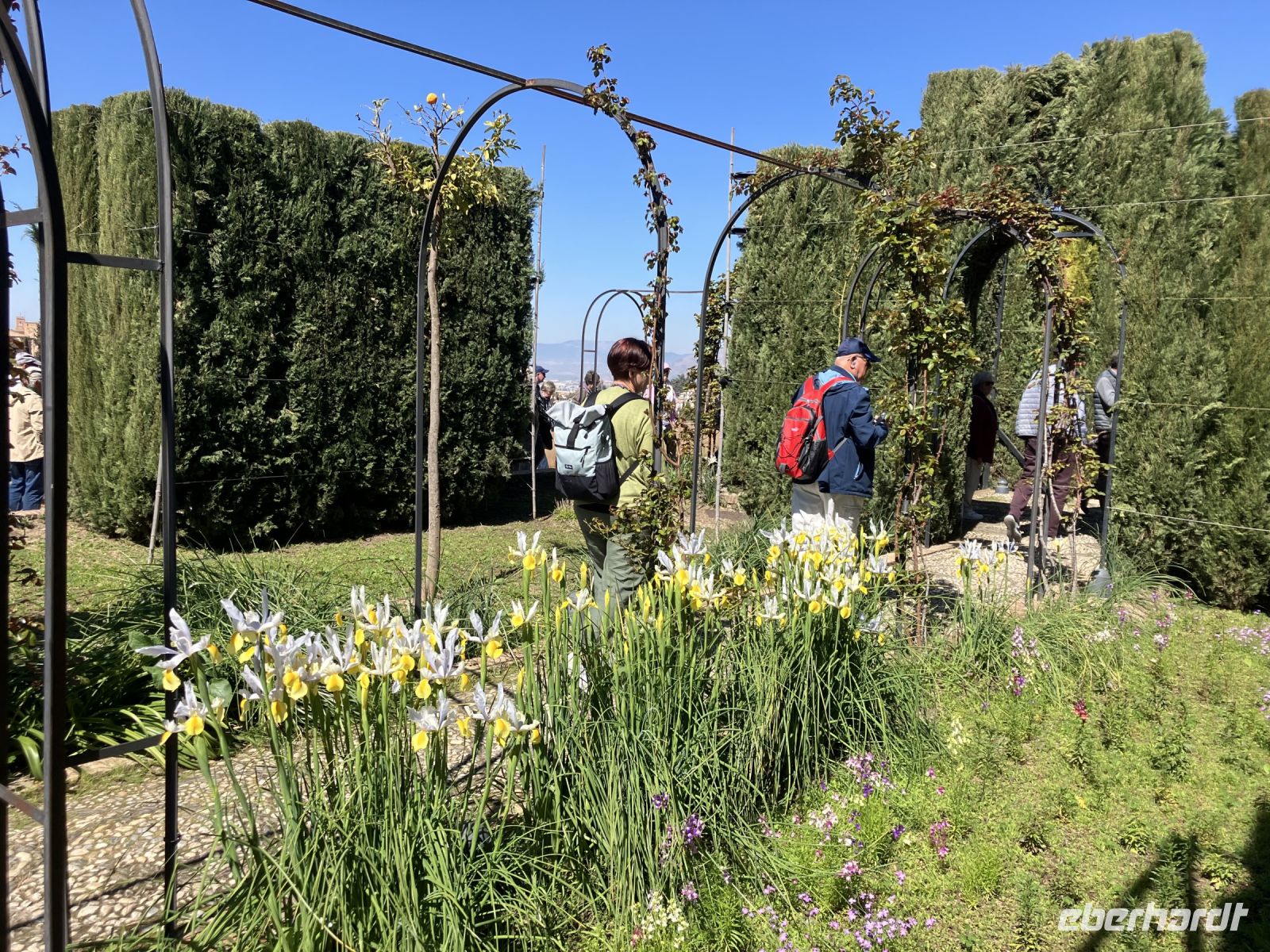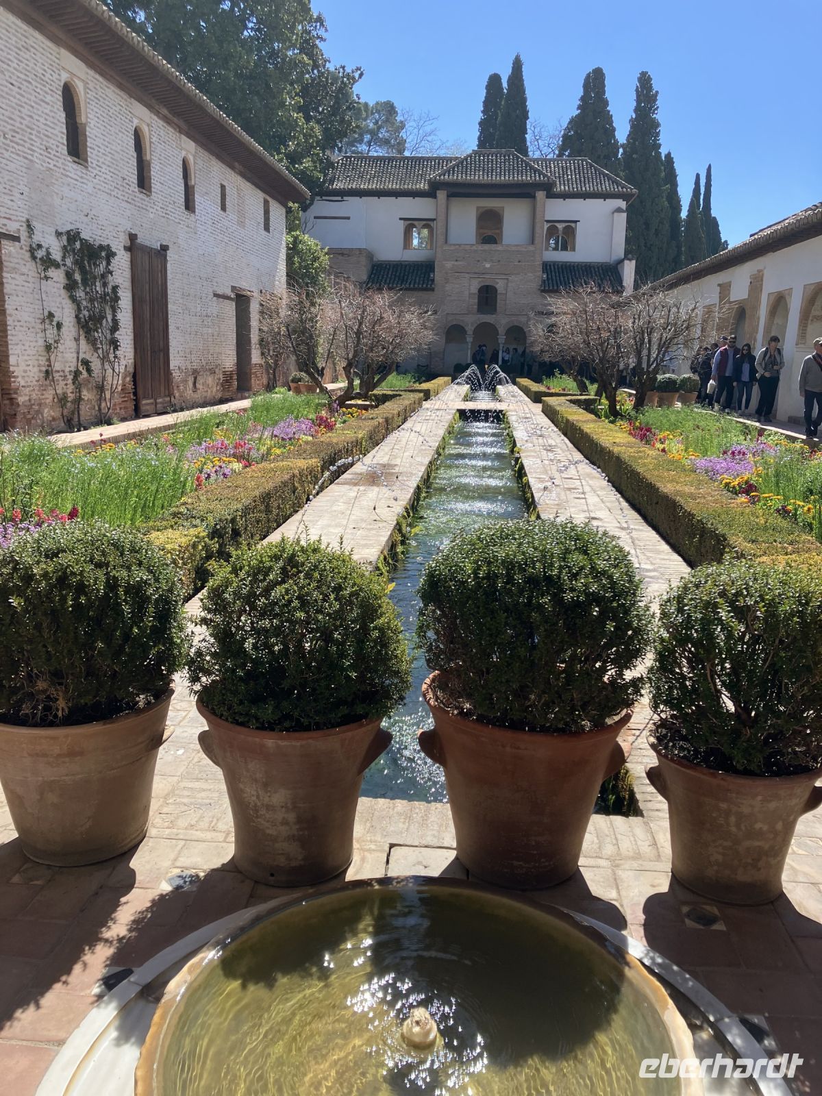 Unsere Führung mit Reiseführer Pedro und uns, seiner kleinen 27-köpfigen Familie begann in den traumhaften Gärten des Generalife, einem ehemaligen Sommersitz der Nasridenherrscher. Hier schufen plätschernde Brunnen, kunstvoll angelegte Wasserbecken und schattige Laubengänge eine Atmosphäre purer Harmonie. Überall duftete es nach blühenden Jasminsträuchern und Orangenblüten, während sich das sanfte Rauschen des Wassers mit dem Zwitschern der Vögel vermischte. Beim Blick von den kunstvoll gestalteten Terrassen aus bot sich uns ein spektakuläres Panorama über Granada – ein perfekter Einstieg in die Welt der maurischen Gartenkunst, die Schönheit und Funktionalität meisterhaft vereint. Und Pedro wusste immer, wo für unsere Fotografen das beste Foto aufzunehmen war.
