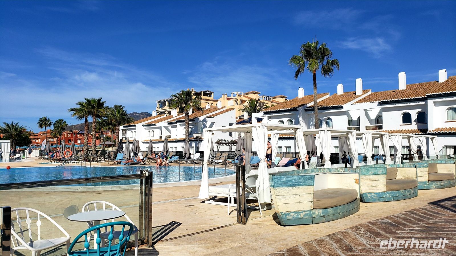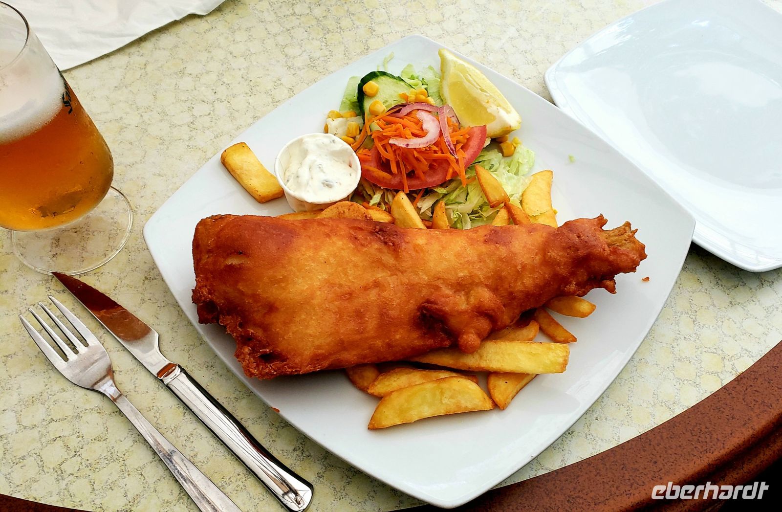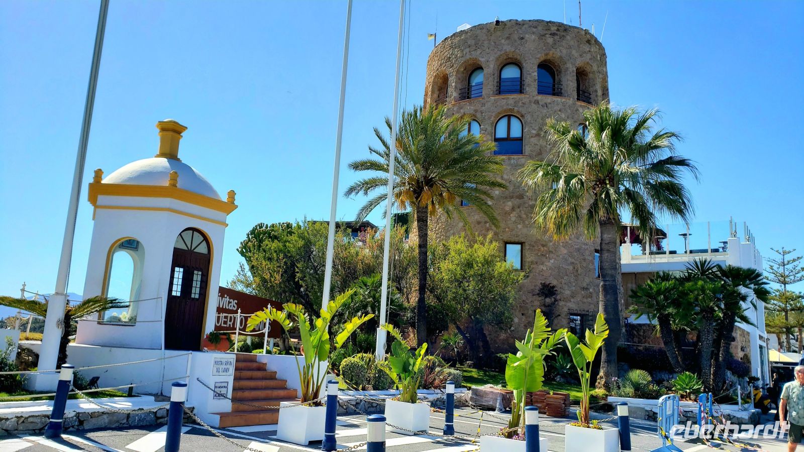 Jetzt haben wir noch eine Stunde Freizeit, ein Teil der Gruppe kommt mit mir in das Restaurant "The Royal Calpe", eine Empfehlung für Fish & Chips. Wir sitzen sehr schön im Biergarten und die Portion Fish & Chips lässt sich gut zu zweit teilen, immerhin kostet es auch 19 Euro, was wir für Pommes und Backfisch nicht gerade günstig finden. Nach dem Essen spazieren wir noch etwas die Fußgängerzone „Main Street“ entlang, aber da es Sonntag ist und fast alle Geschäfte geschlossen haben, zudem ein kühler Wind weht, fahren wir bald wieder zurück nach Spanien und zu unserem tollen Abendbuffet ins Hotel. Vorher machen wir noch einen kurzen Abstecher nach Marbella, um uns den Luxus-Yachthafen anzuschauen, der die meisten Gäste allerdings nicht sonderlich beeindruckt.