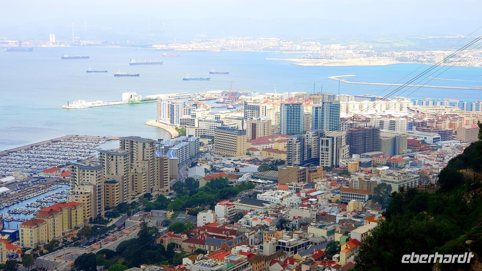 Gleich hinter der Grenze wartet ein Midi-Bus auf uns und wir starten eine Rundfahrt über die Halbinsel. Unser "Stadtführer" ist heute ein "USB Stick“, zu den Orten, wo wir langsam vorbeifahren, kommen die entsprechenden Informationen auf Deutsch vom Band, sehr gut verständlich. Unser freundlicher Busfahrer zeigt zusätzlich mit dem Arm auf das, was gerade erklärt wird. Zunächst fahren wir an der Ostküste entlang, da gibt es ein malerisches Fischerdorf mit bunten Häusern zu sehen. Dann geht es durch einen naturbelassenen Tunnel durch den Berg, das sieht sehr abenteuerlich aus. Nächste Station ist der "Europa Punkt", wo der Leuchtturm ein schickes Fotomotiv abgibt und gegenüber eine hübsche Moschee steht. In der Bucht von Gibraltar liegen viele Frachter. Die Straße von Gibraltar sowie die nur 20 km entfernte Küste von Marokko können wir leider nicht sehn, da es etwas diesig ist. Weiter geht es den Felsen von Gibraltar rauf mit dem Bus. Nächste Station ist "St. Michael's Cave", eine sehr imposante Tropfsteinhöhle, farbige Lichter und mystische Musik geben beim Durchgehen eine besondere Atmosphäre. Vor der Höhle haben wir schon die ersten Berberaffen gesehen, entgegen vorherigen Warnungen sind sie gar nicht frech und räuberisch, sie sitzen eher gelangweilt herum und lassen sich fotografieren. Wir fahren noch ein Stück höher mit dem Bus und steigen aus, um die schöne Aussicht auf die Bucht von Gibraltar zu genießen. Auch hier „posen“ einige Berberaffen für unsere Fotos. Dann geht es mit dem Bus wieder den Berg runter, der USB Stick erzählt uns noch, dass John Lennon und Yoko Ono hier geheiratet haben und auch Sean Connery. Dann ist unsere sehr informative Tour zu Ende, der freundliche Busfahrer bekommt etwas Trinkgeld, dem USB Stick können wir ja nichts geben...