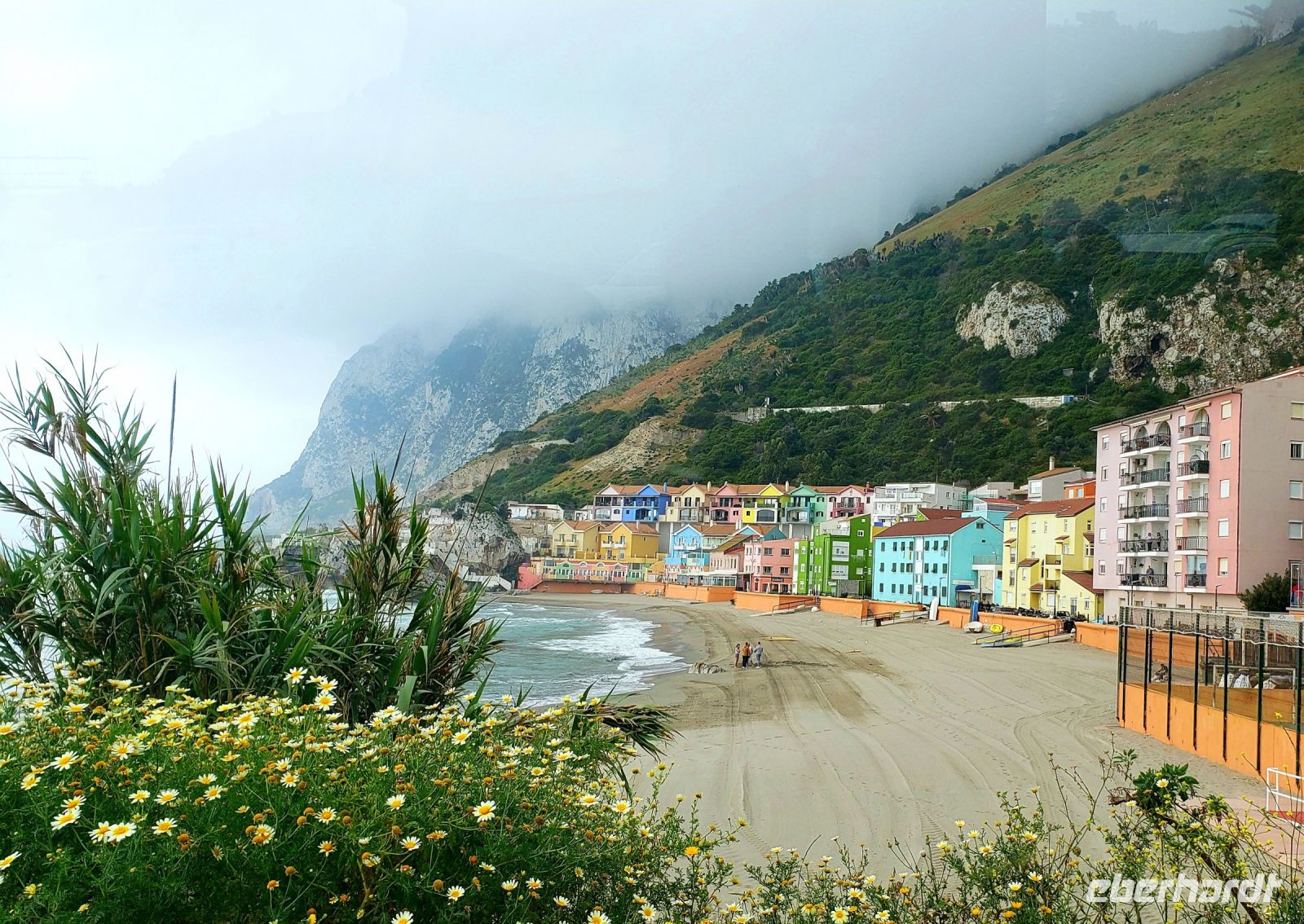 Nach einem super Frühstück geht es auf einen fakultativen Ausflug nach Gibraltar, also mal eben nach Großbritannien... Bis auf sechs Gäste, die lieber einen Strandtag machen oder nochmal nach Malaga wollen, kommen alle mit. Als wir in La Lìnea de Concepción ankommen, müssen wir zu Fuß über die Grenze zur Ausweiskontrolle.