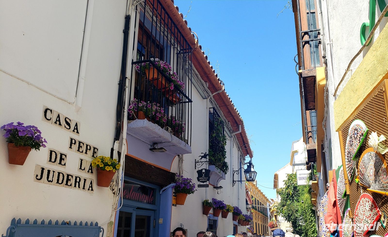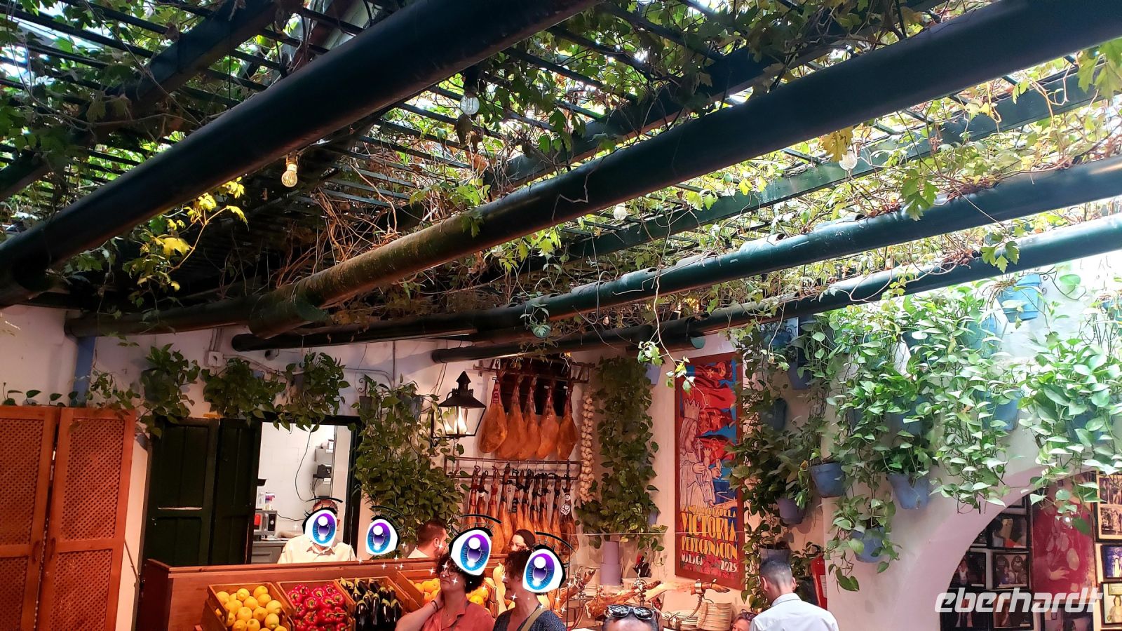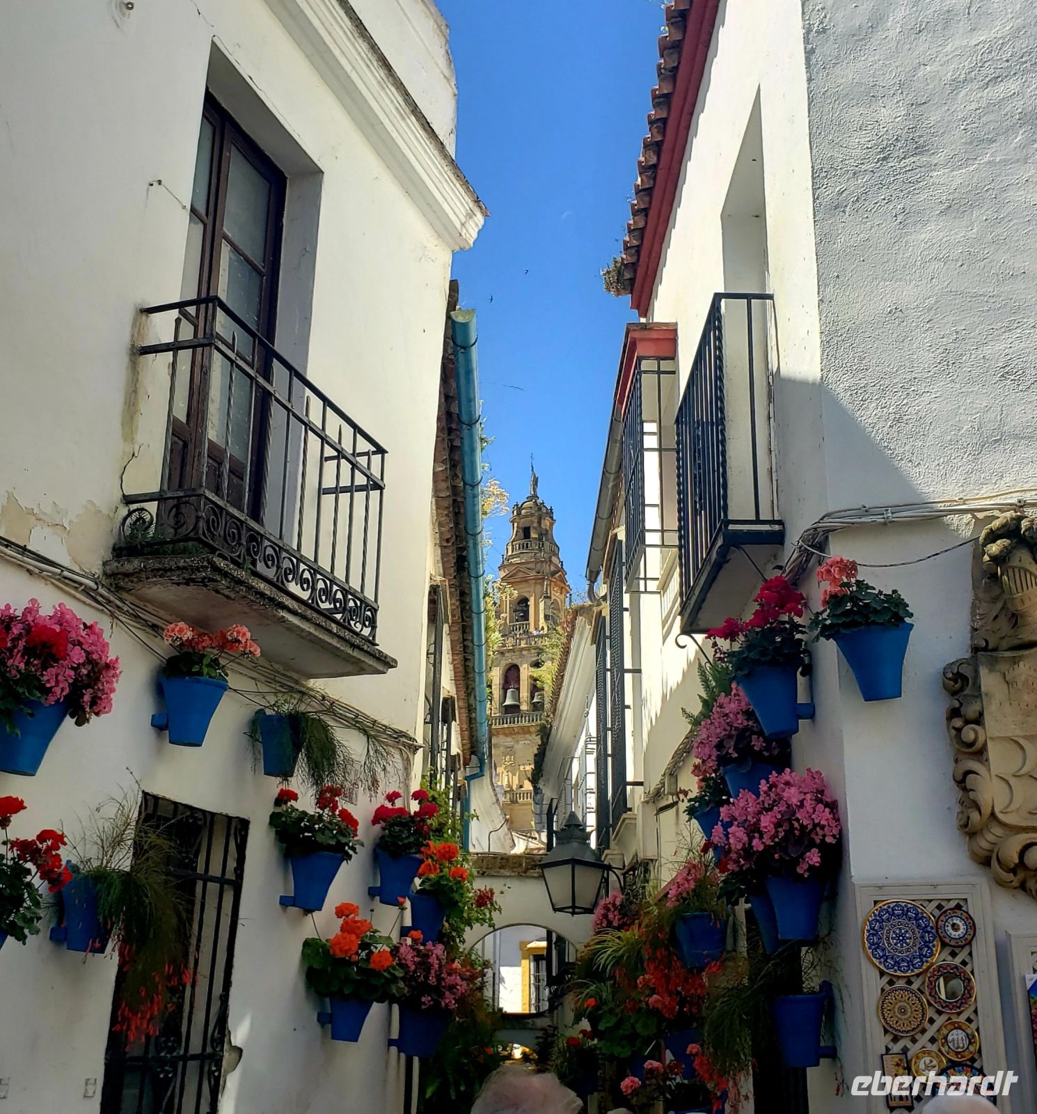 Nachdem wir alles ausgiebig bewundert haben, führt uns Inés durch die engen Altstadtgassen. Viele Häuser haben ihre Balkone und Innenhöfe liebevoll mit Blumen geschmückt, es gibt sogar eine "Blumengasse". Wir würden gerne noch weiter bummeln, aber der leere Magen macht sich bemerkbar, rechtzeitig zu unserer Reservierungszeit 13 Uhr in dem gemütlichen Tapas-Restaurant "Bodegas Mezquita Corregidor". Es gibt 6 verschiedene Tapas und 1 Dessert, alles sehr lecker und die Bedienung ist sehr freundlich. Anschließend bleibt noch etwas Zeit zum individuellen Bummeln und um 16.45 Uhr treffen wir uns wieder an der Tourist Information. Gemeinsam spazieren wir voller Eindrücke über die Puente Romano zurück zum Bus.