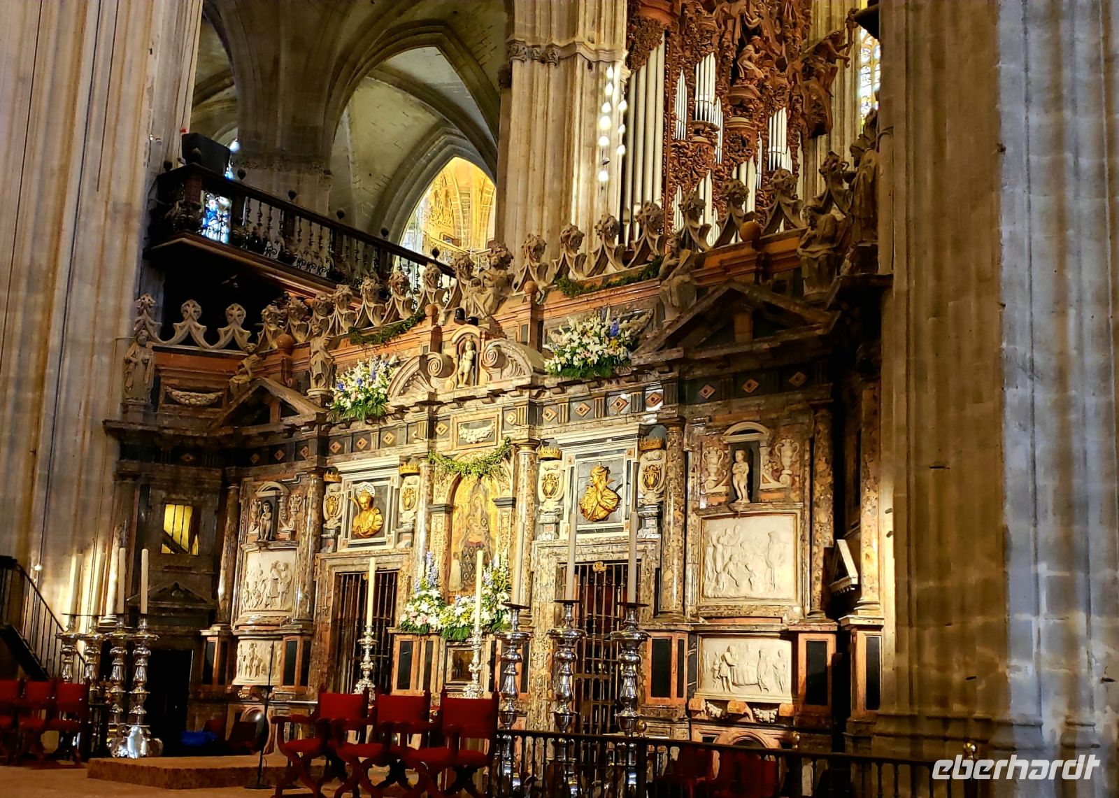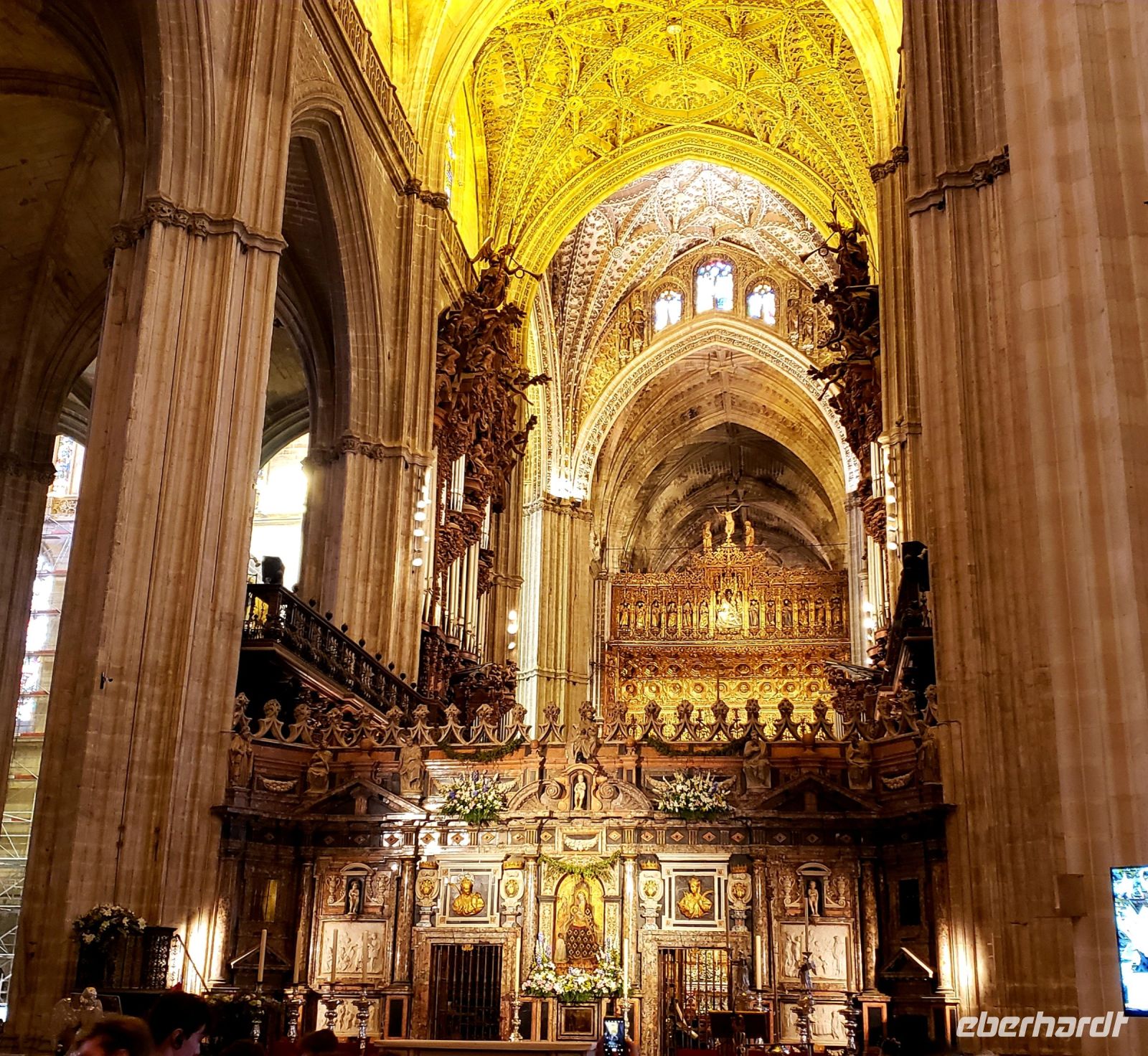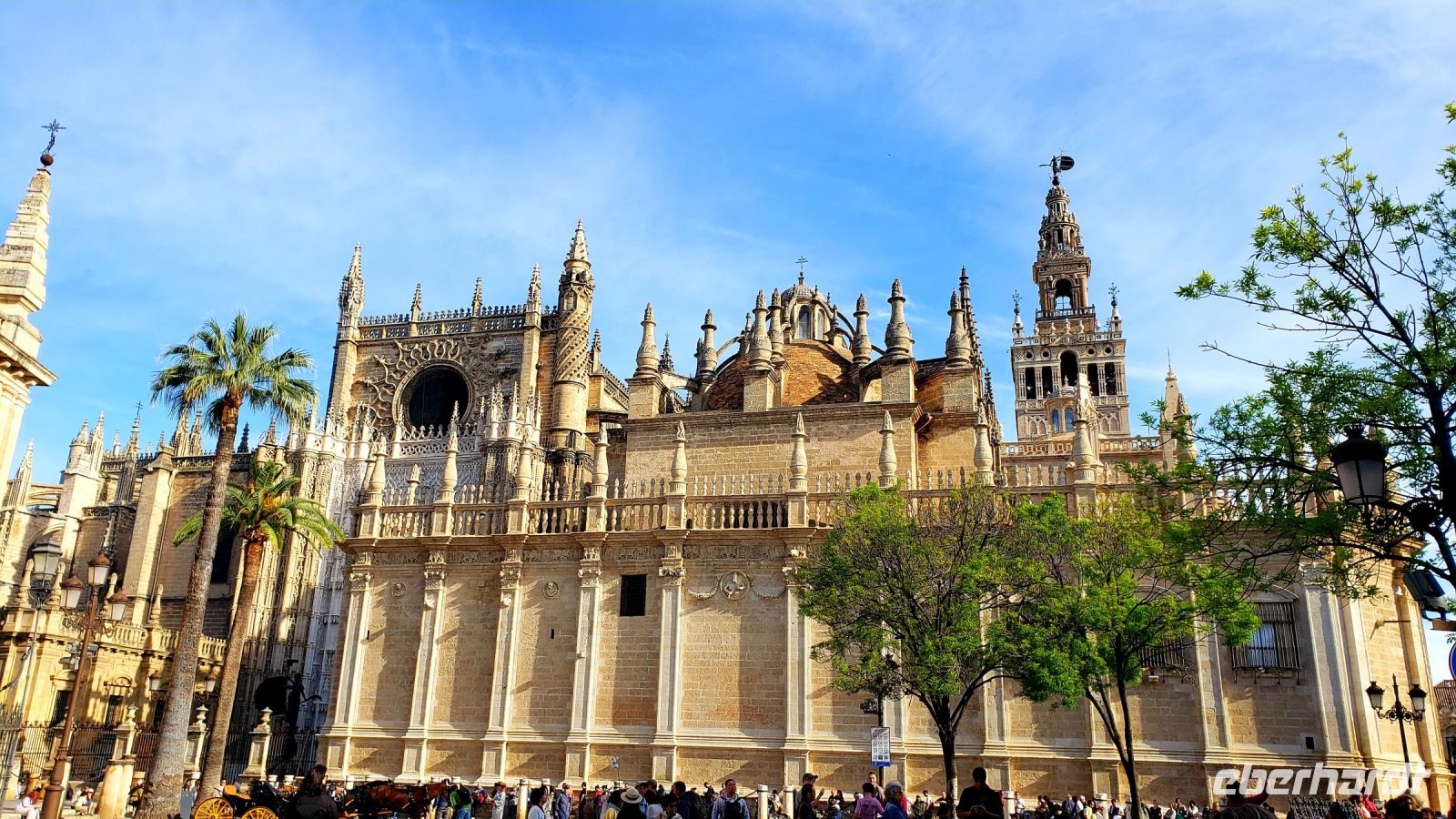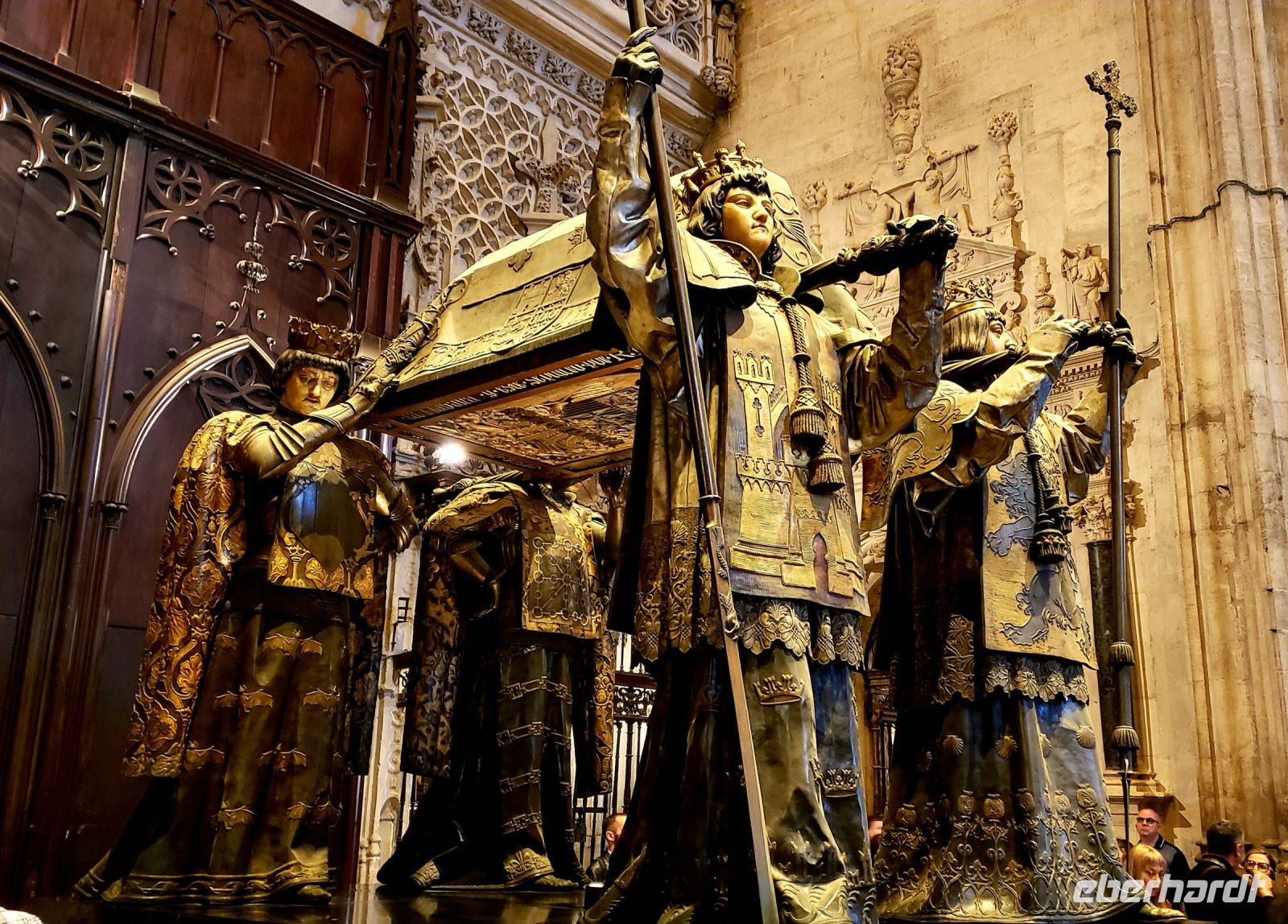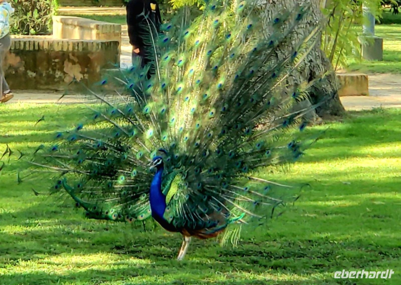 Nach einem Bummel mit Erklärungen durch das historische jüdische Viertel geht es in den Palast "Reales Alcazares". Alle sind überwältigt von der architektonischen Schönheit der Räume. Pilar liefert uns viele Informationen dazu und zum Schluss gibt es in der Cafeteria des wunderschönen Palastgartens eine Entspannungspause. Hier spazieren Pfauen herum und einer schlägt sogar ein Rad für uns! Zügig geht es dann weiter in die Kathedrale gleich nebenan. Wieder sind wir von der Innenausstattung und der Architektur fasziniert. Hier befindet sich das Grab von Christoph Columbus, oder vielmehr, was von seinen Gebeinen noch übrig ist. Seine sterblichen Überreste befinden sich in einem Sarg, der von vier Männerfiguren getragen wird. Columbus wollte nicht in der Erde Spaniens bestattet werden, also liegt er etwas erhöht.