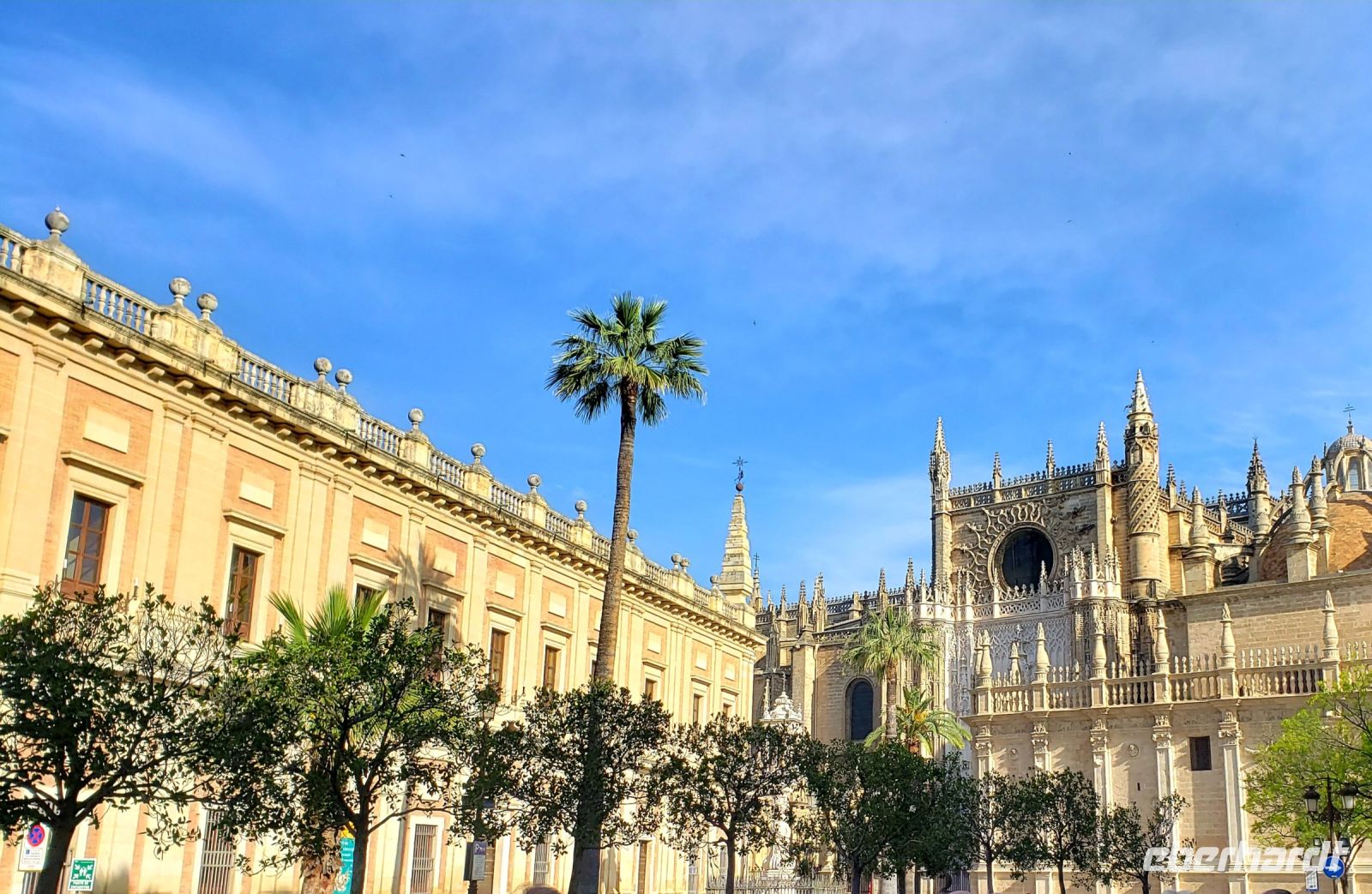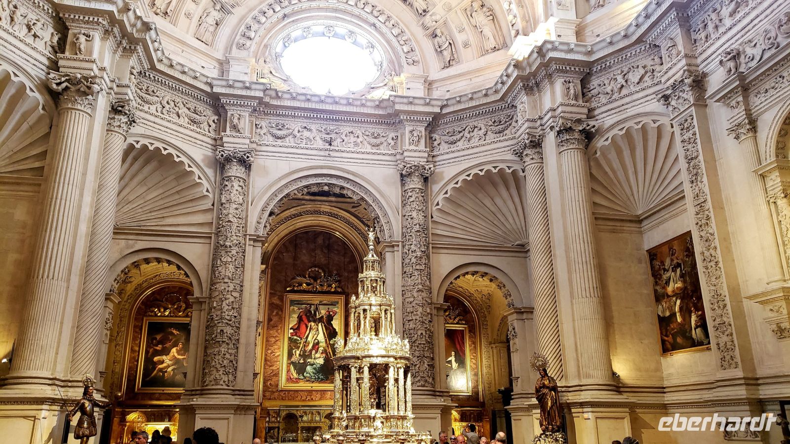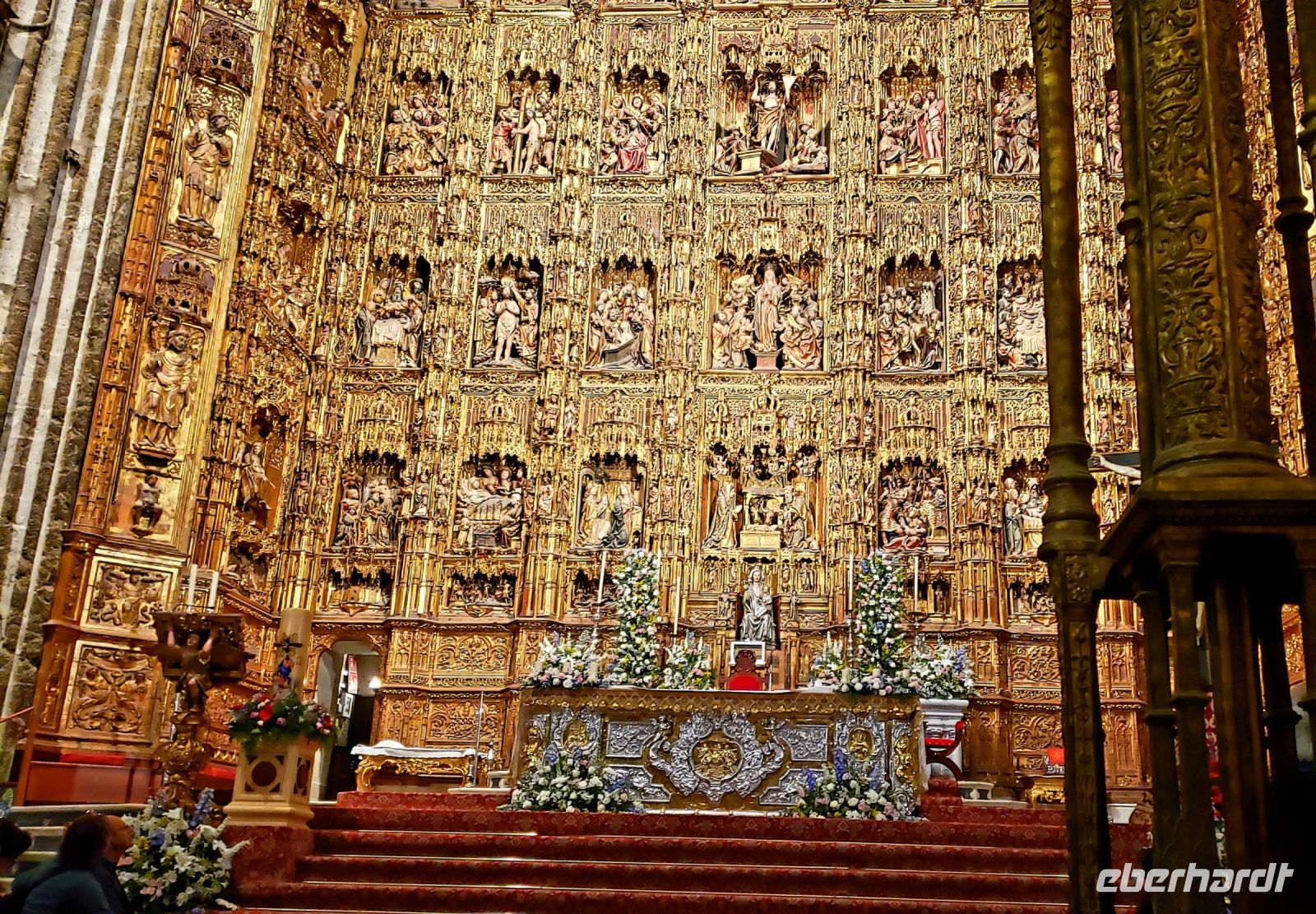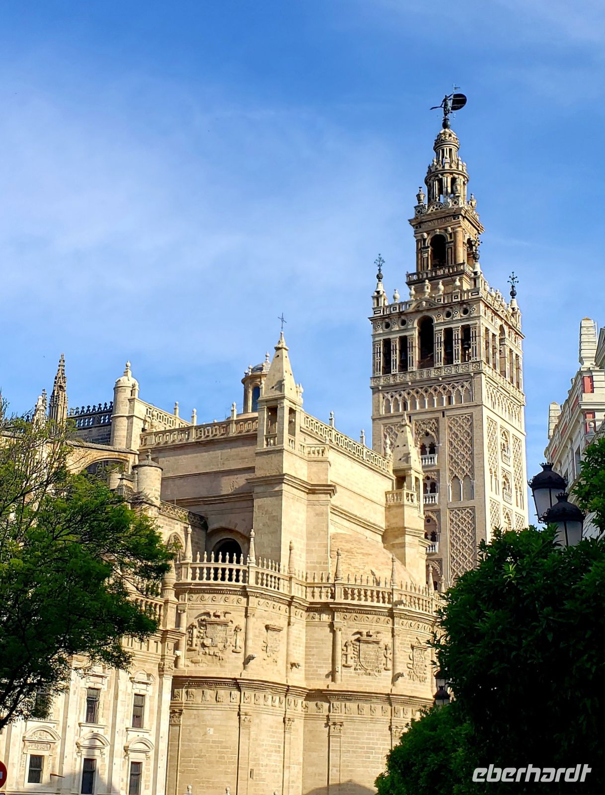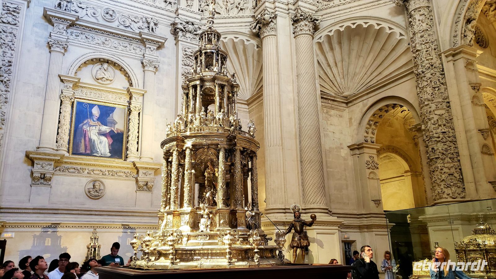 Nach einem Bummel mit Erklärungen durch das historische jüdische Viertel geht es in den Palast "Reales Alcazares". Alle sind überwältigt von der architektonischen Schönheit der Räume. Pilar liefert uns viele Informationen dazu und zum Schluss gibt es in der Cafeteria des wunderschönen Palastgartens eine Entspannungspause. Hier spazieren Pfauen herum und einer schlägt sogar ein Rad für uns! Zügig geht es dann weiter in die Kathedrale gleich nebenan. Wieder sind wir von der Innenausstattung und der Architektur fasziniert. Hier befindet sich das Grab von Christoph Columbus, oder vielmehr, was von seinen Gebeinen noch übrig ist. Seine sterblichen Überreste befinden sich in einem Sarg, der von vier Männerfiguren getragen wird. Columbus wollte nicht in der Erde Spaniens bestattet werden, also liegt er etwas erhöht.