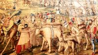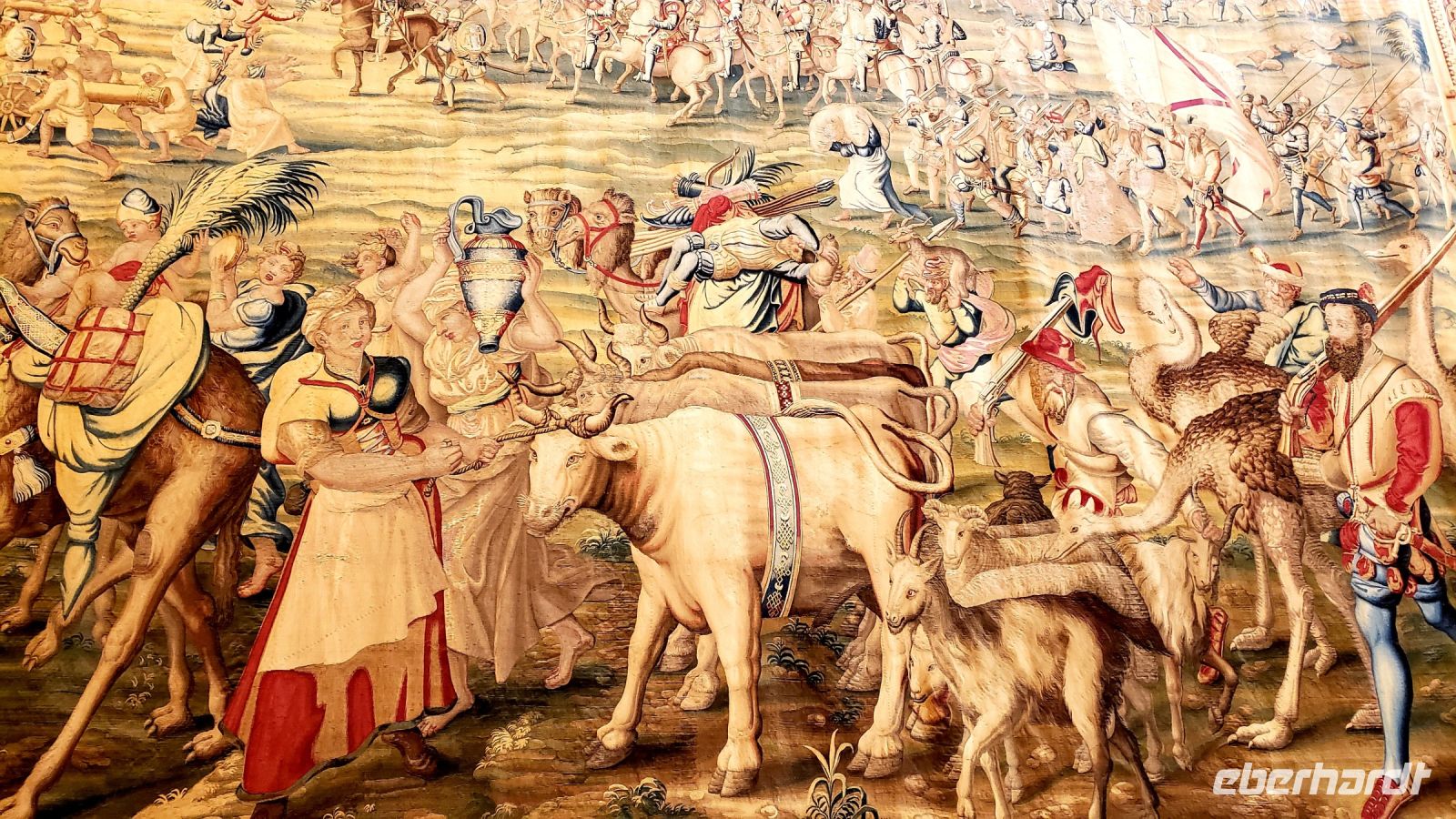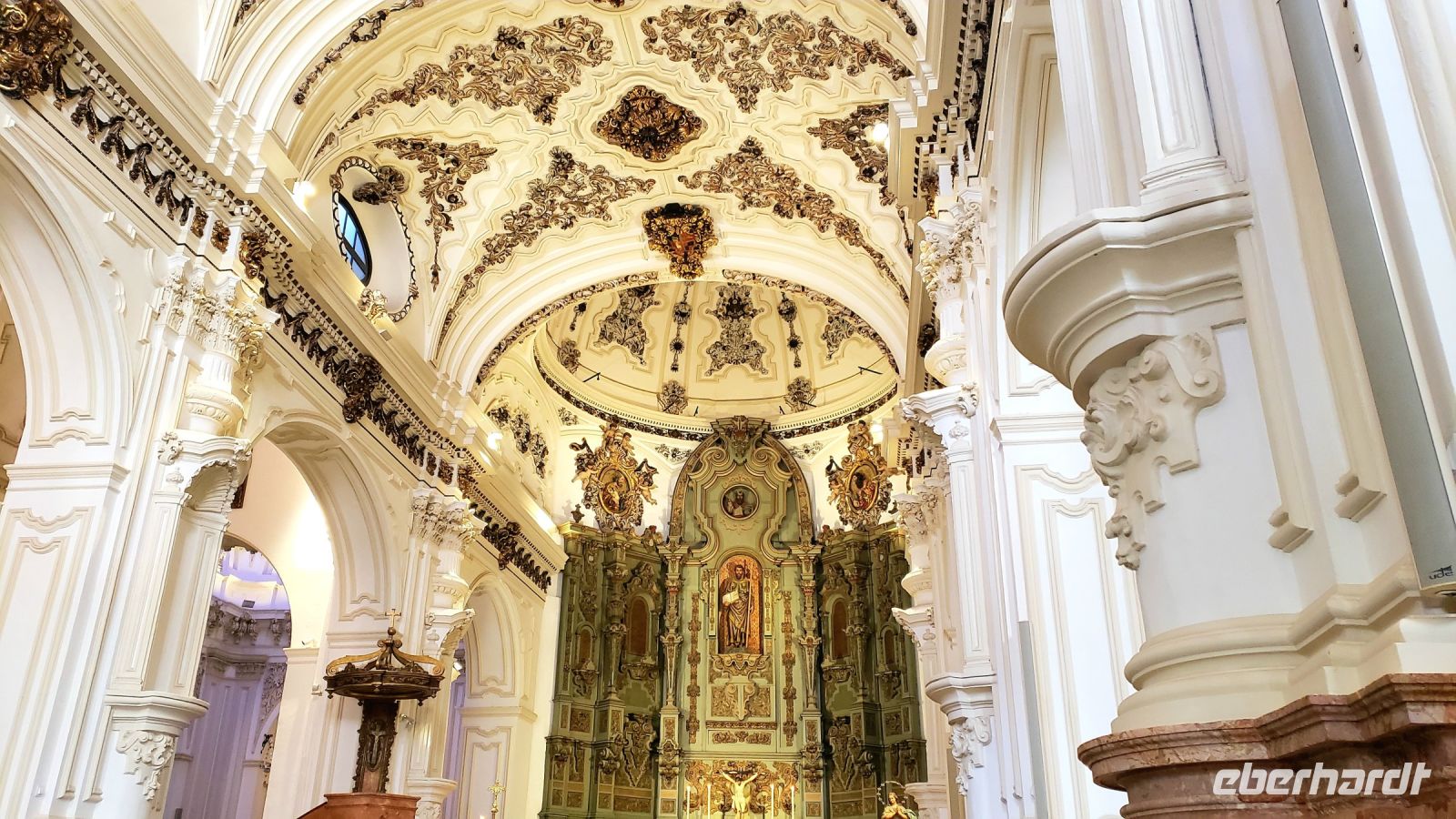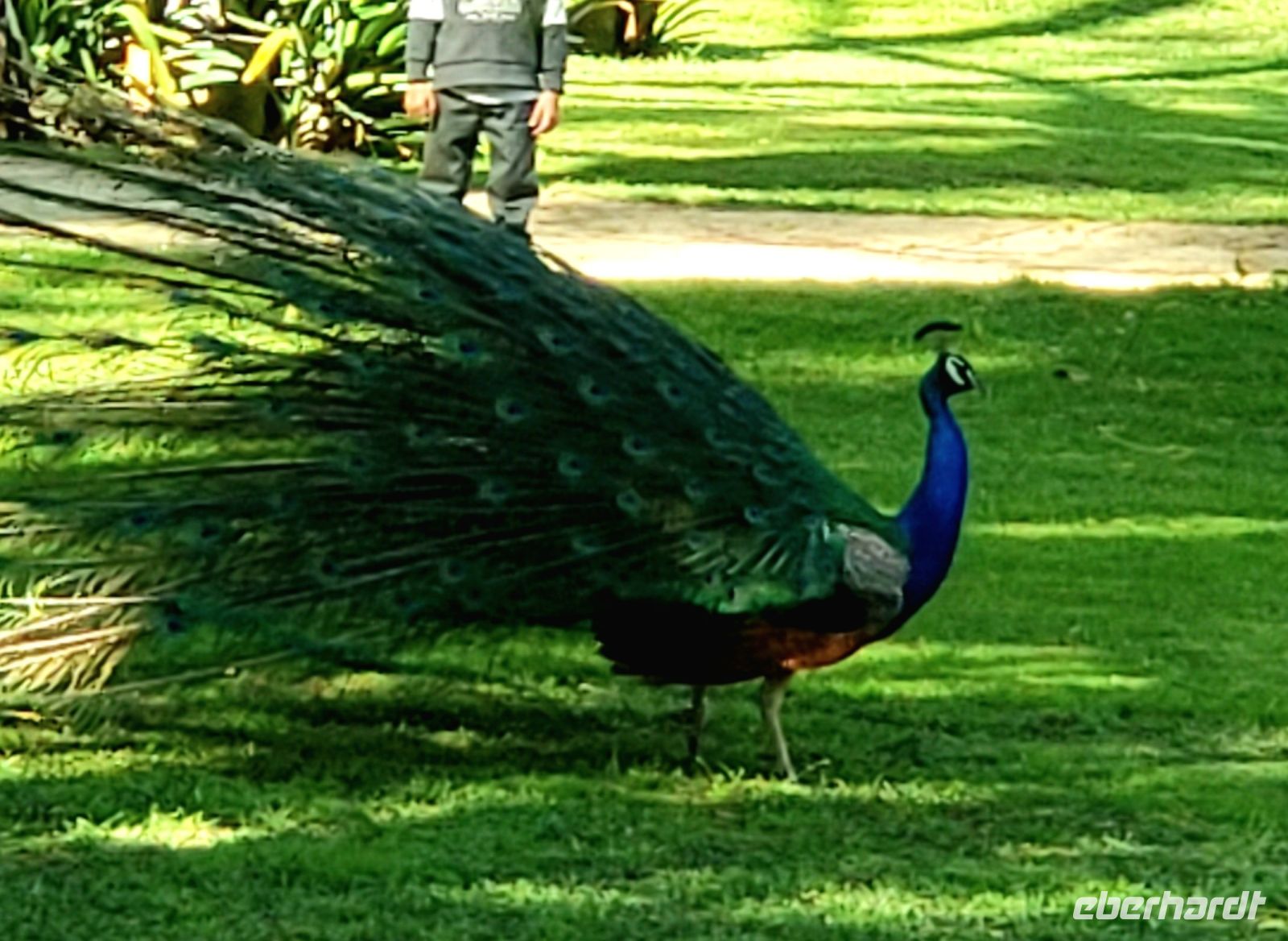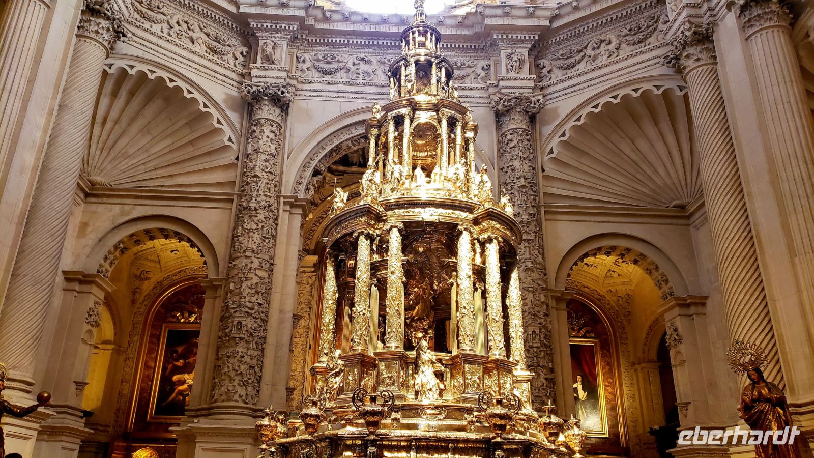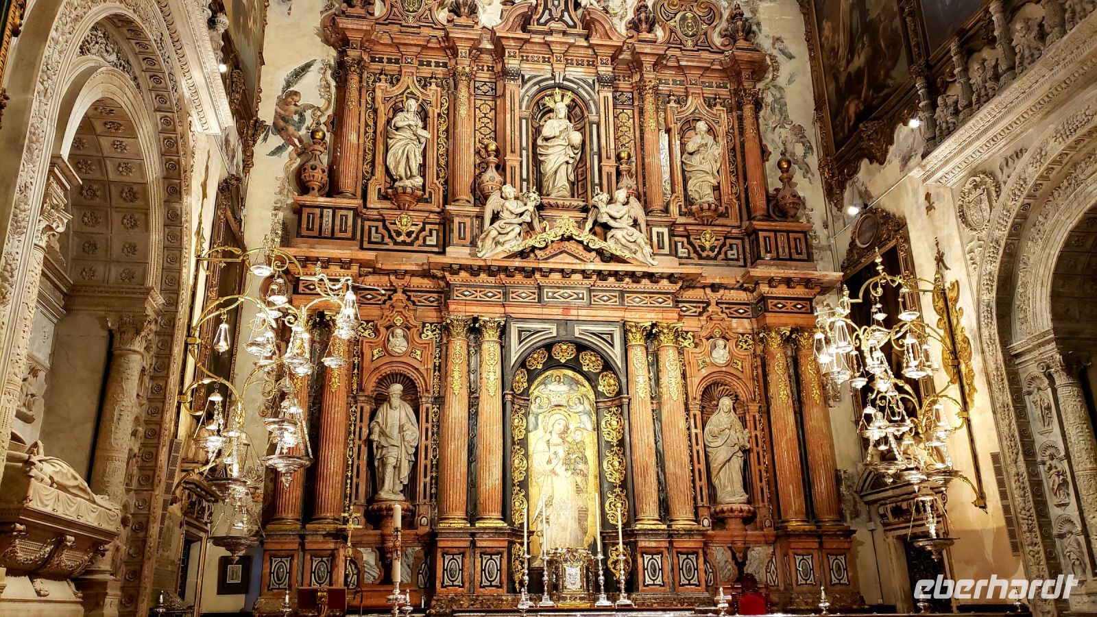 Nach einem Bummel mit Erklärungen durch das historische jüdische Viertel geht es in den Palast "Reales Alcazares". Alle sind überwältigt von der architektonischen Schönheit der Räume. Pilar liefert uns viele Informationen dazu und zum Schluss gibt es in der Cafeteria des wunderschönen Palastgartens eine Entspannungspause. Hier spazieren Pfauen herum und einer schlägt sogar ein Rad für uns! Zügig geht es dann weiter in die Kathedrale gleich nebenan. Wieder sind wir von der Innenausstattung und der Architektur fasziniert. Hier befindet sich das Grab von Christoph Columbus, oder vielmehr, was von seinen Gebeinen noch übrig ist. Seine sterblichen Überreste befinden sich in einem Sarg, der von vier Männerfiguren getragen wird. Columbus wollte nicht in der Erde Spaniens bestattet werden, also liegt er etwas erhöht.