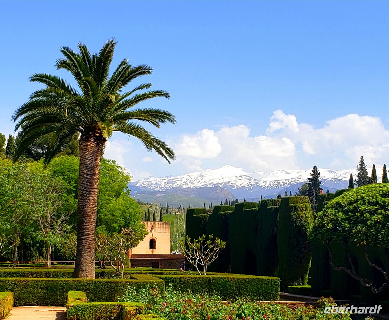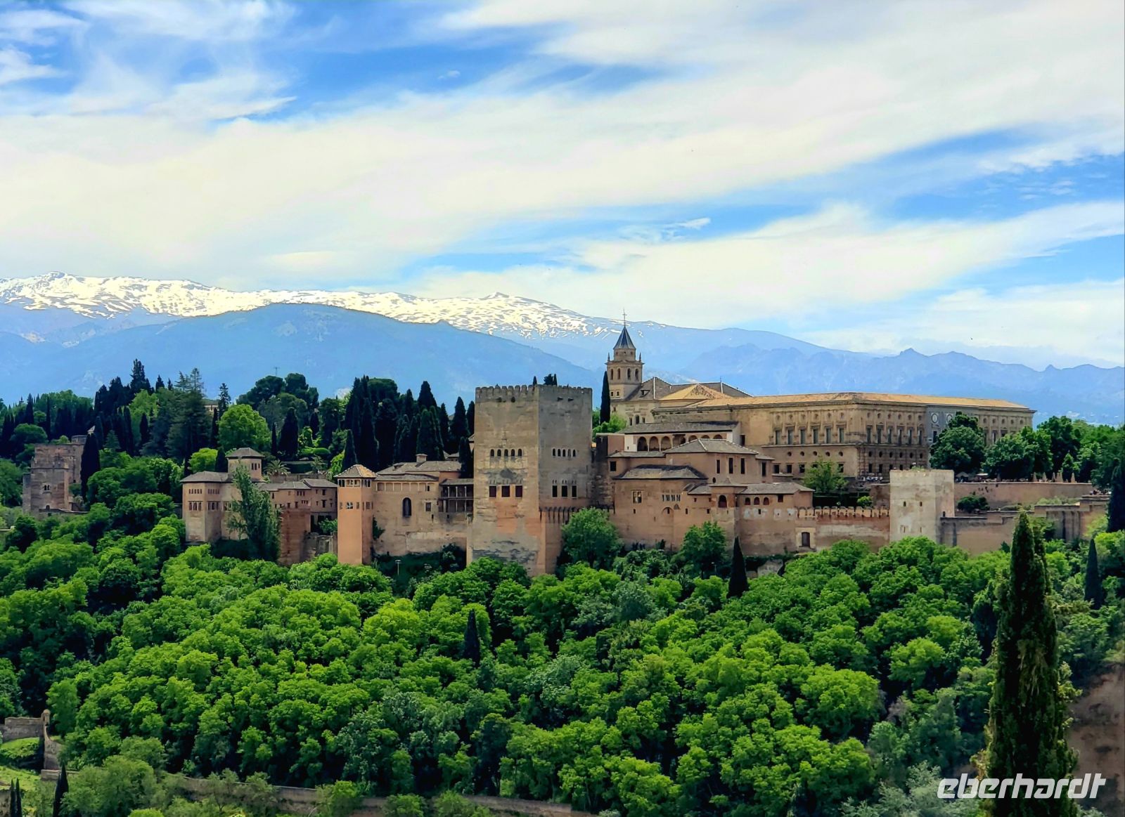 Der nächste Ausflug unserer Reise führt uns nach Granada. Im Hintergrund taucht die Sierra Nevada auf, die noch malerische Schneekuppen trägt, im Mai wird der Schnee dann irgendwann verschwunden sein.