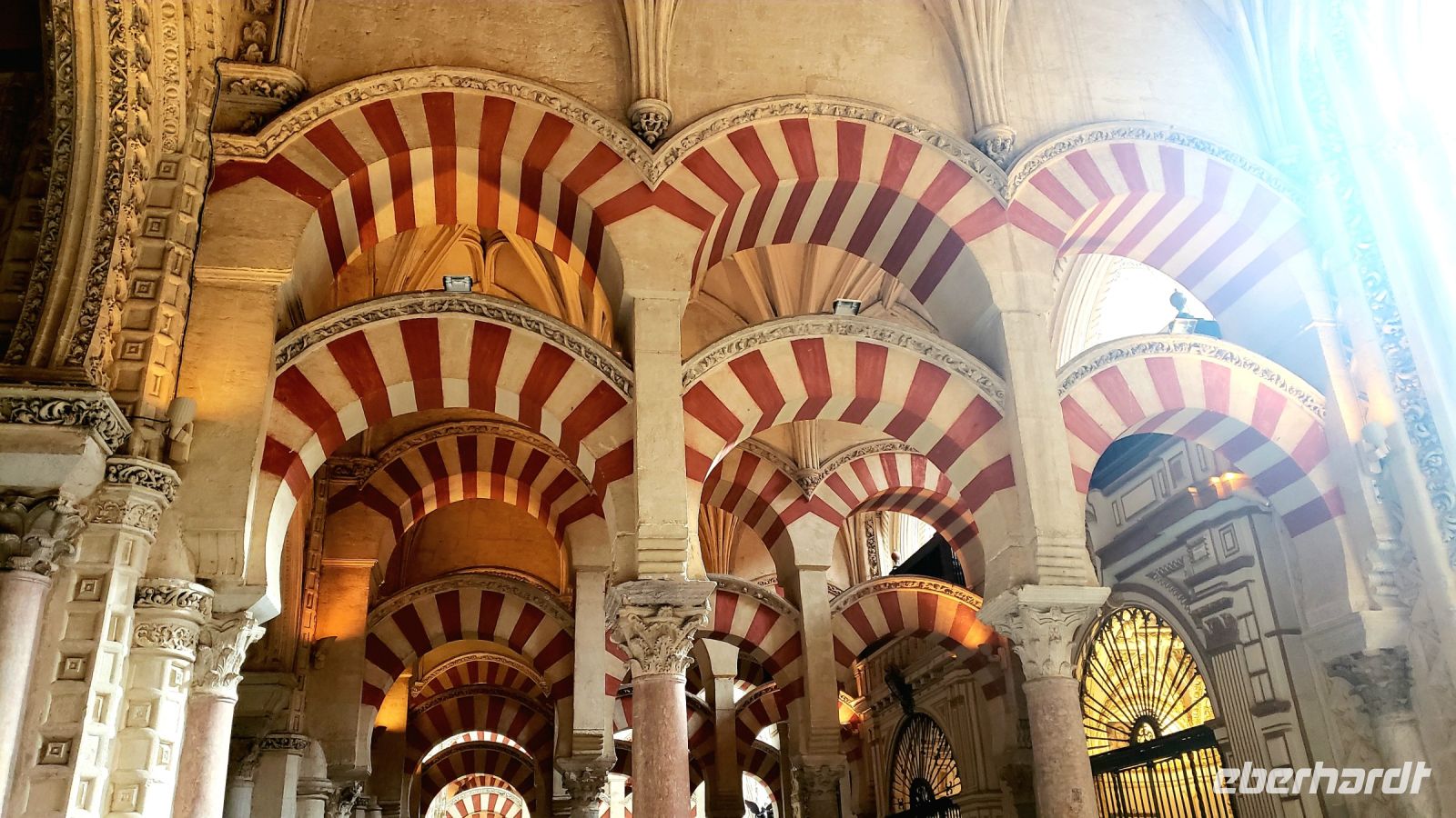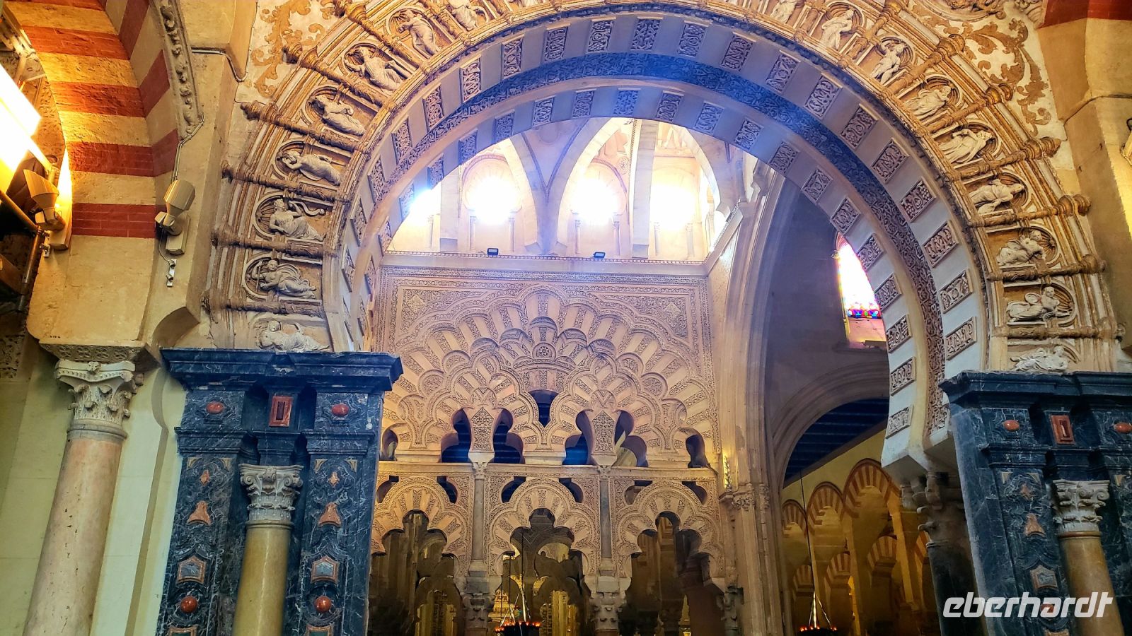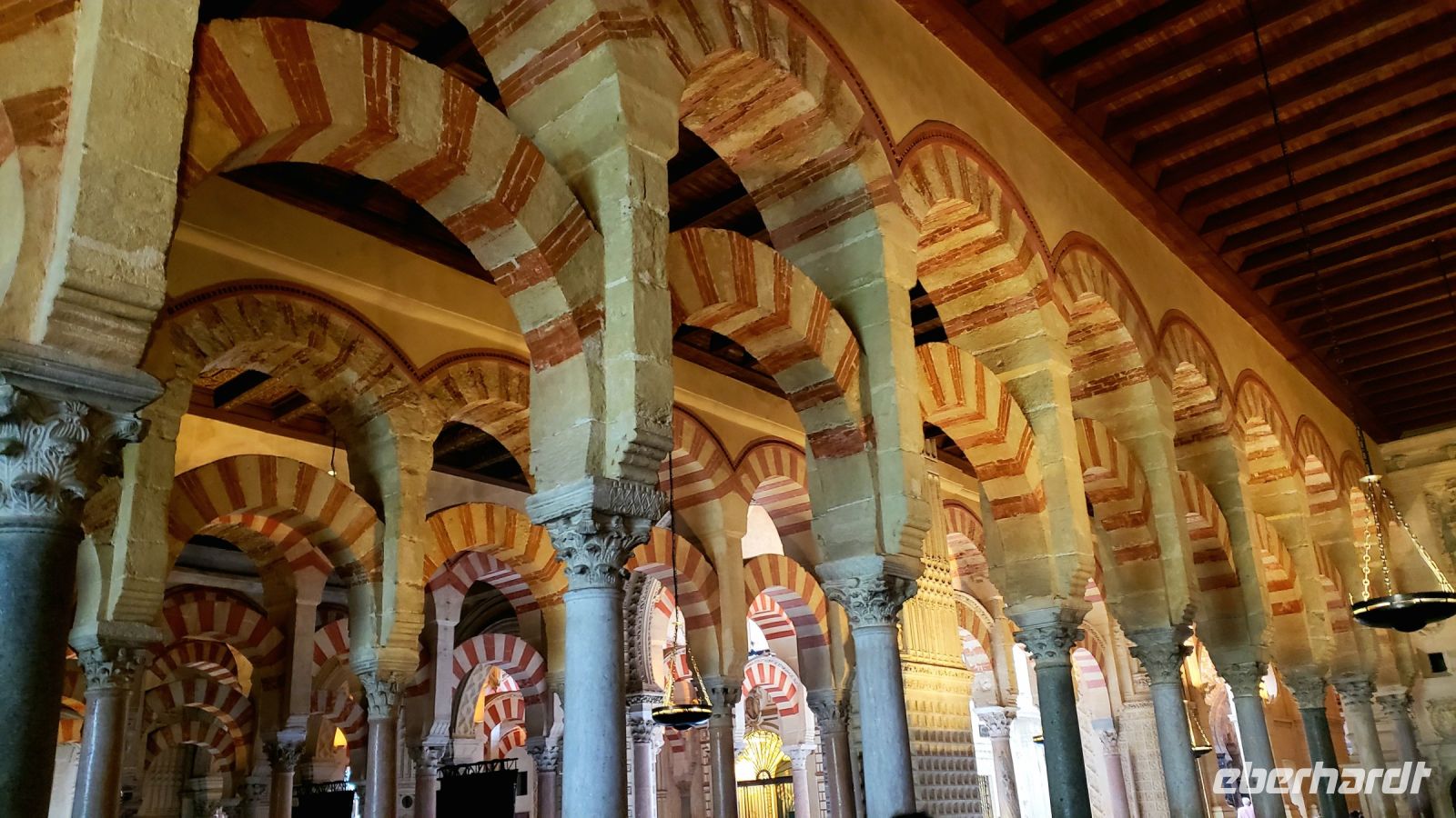 In Córdoba hält der Bus am Rande der Altstadt und wir spazieren ein kleines Stück am Guadalquivir entlang über die imposante Brücke "Puente Romano". Gleich gegenüber gibt es eine Tourist Information, welche im Untergeschoss Toiletten hat. Ein nicht unwichtiger Punkt, wenn man auf Reisen ist! An dem Eingang zur Moschee "Mezquita" wartet schon unsere Stadtführerin Inés auf uns. Die Mezquita mit ihren 856 Säulen, die aus Jaspis, Granit, Onyx und Marmor gebaut sind, beeindruckt uns mit ihrer Einzigartigkeit und wir wissen gar nicht, was wir zuerst fotografieren sollen.