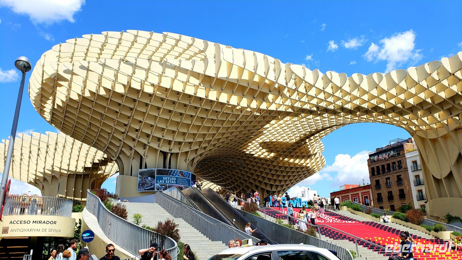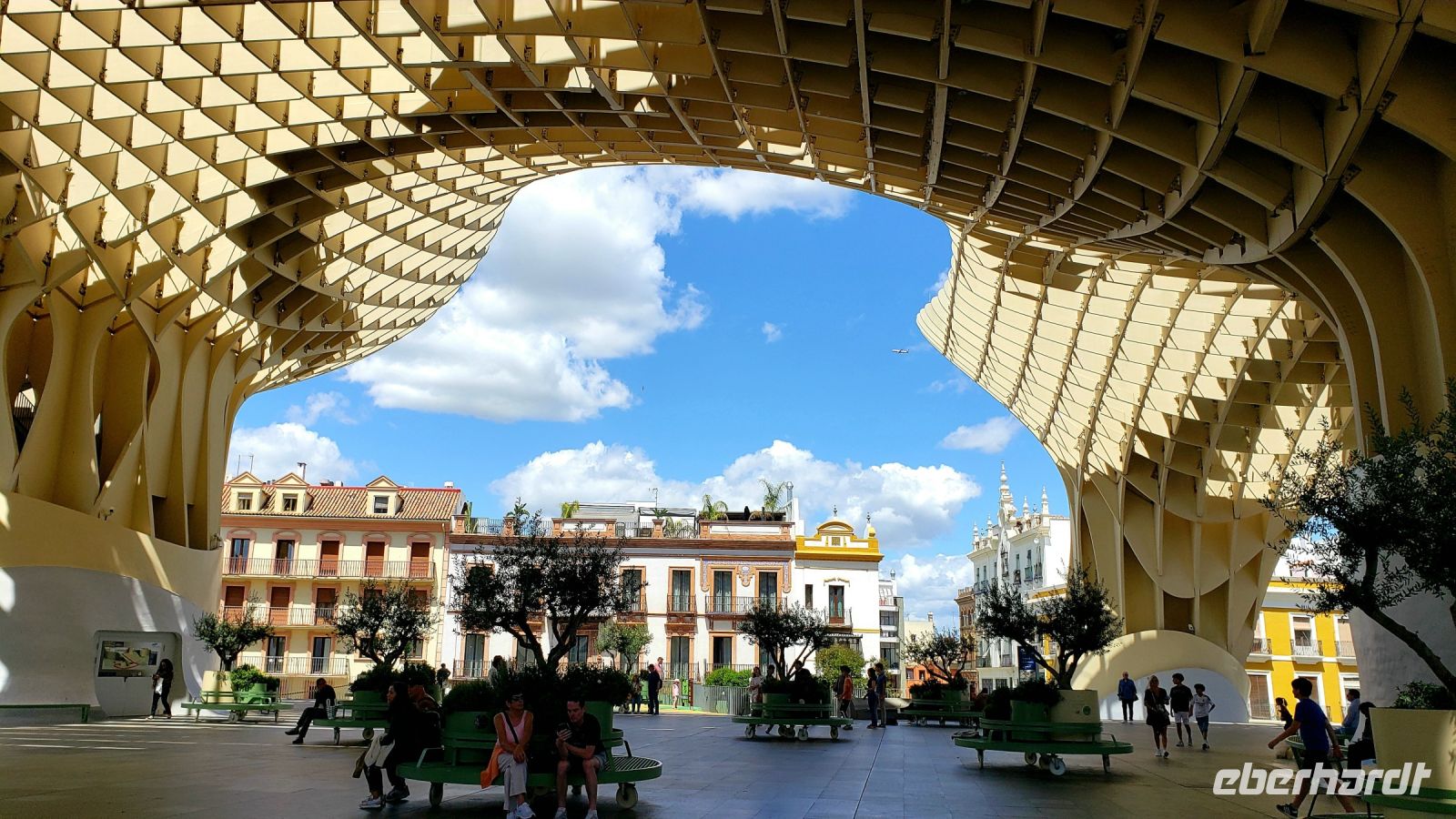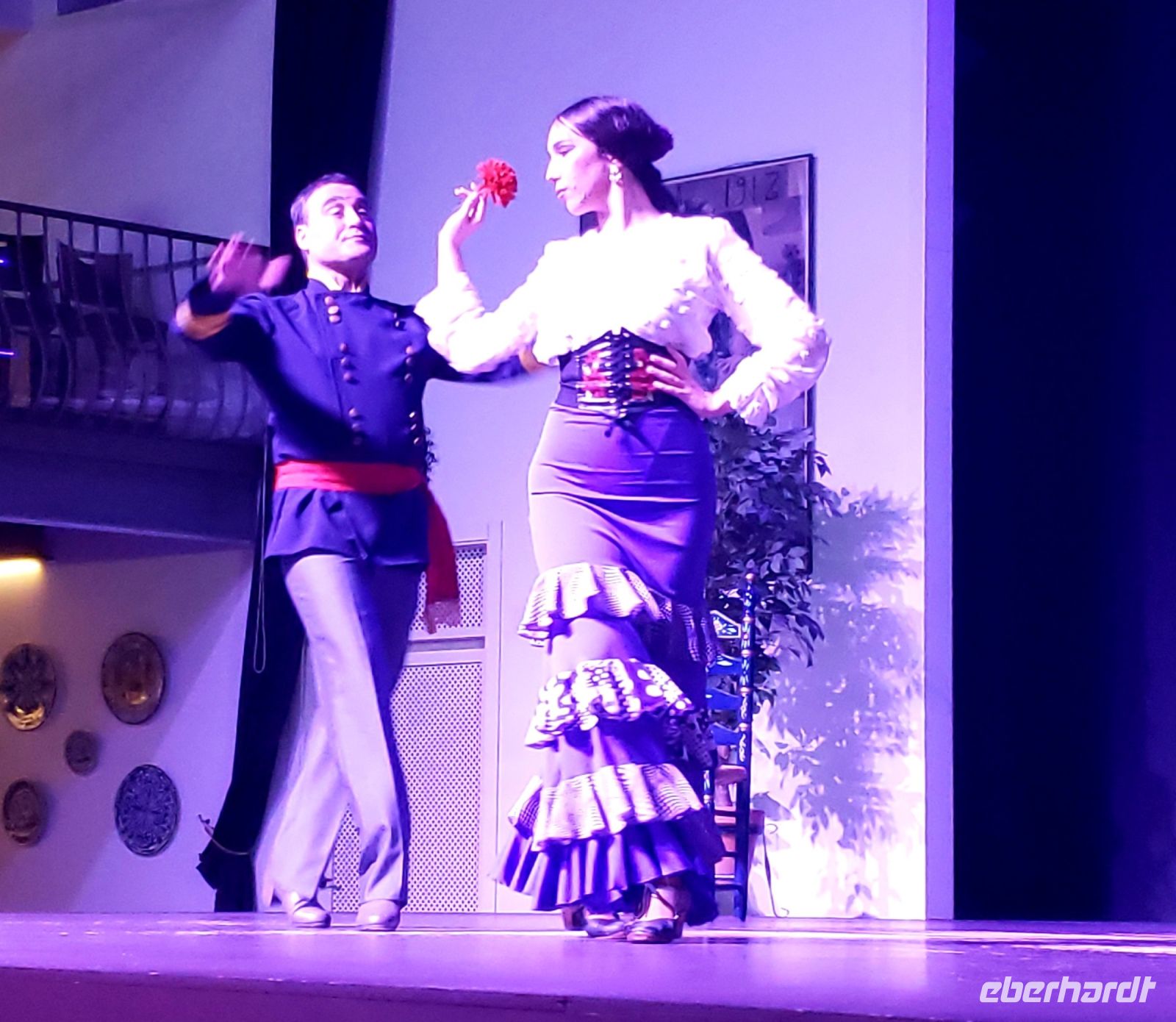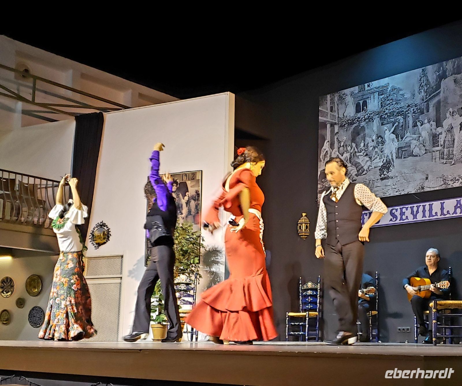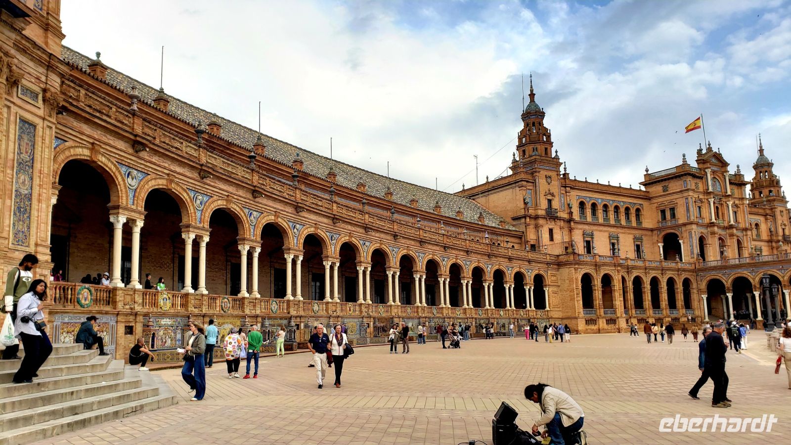 Nachdem Pilar uns auch hier alles detailliert erklärt hat, sind wir bereit für die Mittagspause und gehen in die nahegelegene "Bodega El Patio", wo es verschiedene leckere kleine Gerichte zur Auswahl gibt. Ein Teil der Gruppe hat tatsächlich noch Energie und besteigt den Turm der "Giralda", der zwar keine Stufen hat, aber 34 Rampen, die umlaufend nach oben führen. Es gibt jetzt Freizeit für alle, ein Teil der Gäste kommt mit mir zu den "Setas", das ist eine riesige Holzkonstruktion, die wie Pilze oder Schirme aussieht. Nachdem wir diverse Fotos gemacht haben, schlendern wir zum Hotel zurück. Das wird auch Zeit, denn um 18 Uhr werden die meisten Gäste mit mir schon zur Flamenco Show abgeholt. Die Busfahrt dauert ca. 20 Minuten, die Fahrt geht vorbei an diversen wunderschönen Gebäuden, die allesamt 1929 zur iberoamerikanischen Expo entstanden sind und seitdem teilweise als Konsulate dienen. Alle befinden sich im Umkreis der Plaza España. Dann gehen wir in das Flamenco Lokal "El Patio Sevillano", wo die ersten drei Reihen rechts vor der Bühne für uns reserviert sind. Ein Getränk ist inklusive, unter anderem gibt es Sangría. Die professionelle Show begeistert uns alle, die Tänzer und Tänzerinnen geben alles und die Bewegungen werden mit jedem Tanz schneller. Am Ende bekommen sie tosenden Applaus. Völlig beseelt gehen wir raus und unser Bus wartet schon rechts vom Eingang. Glücklich und müde erreichen wir um 21 Uhr unser Hotel. Jetzt gibt es noch ein spätes Abendessen vom Buffet im Hotel. Was für ein wundervoller Tag in Sevilla!