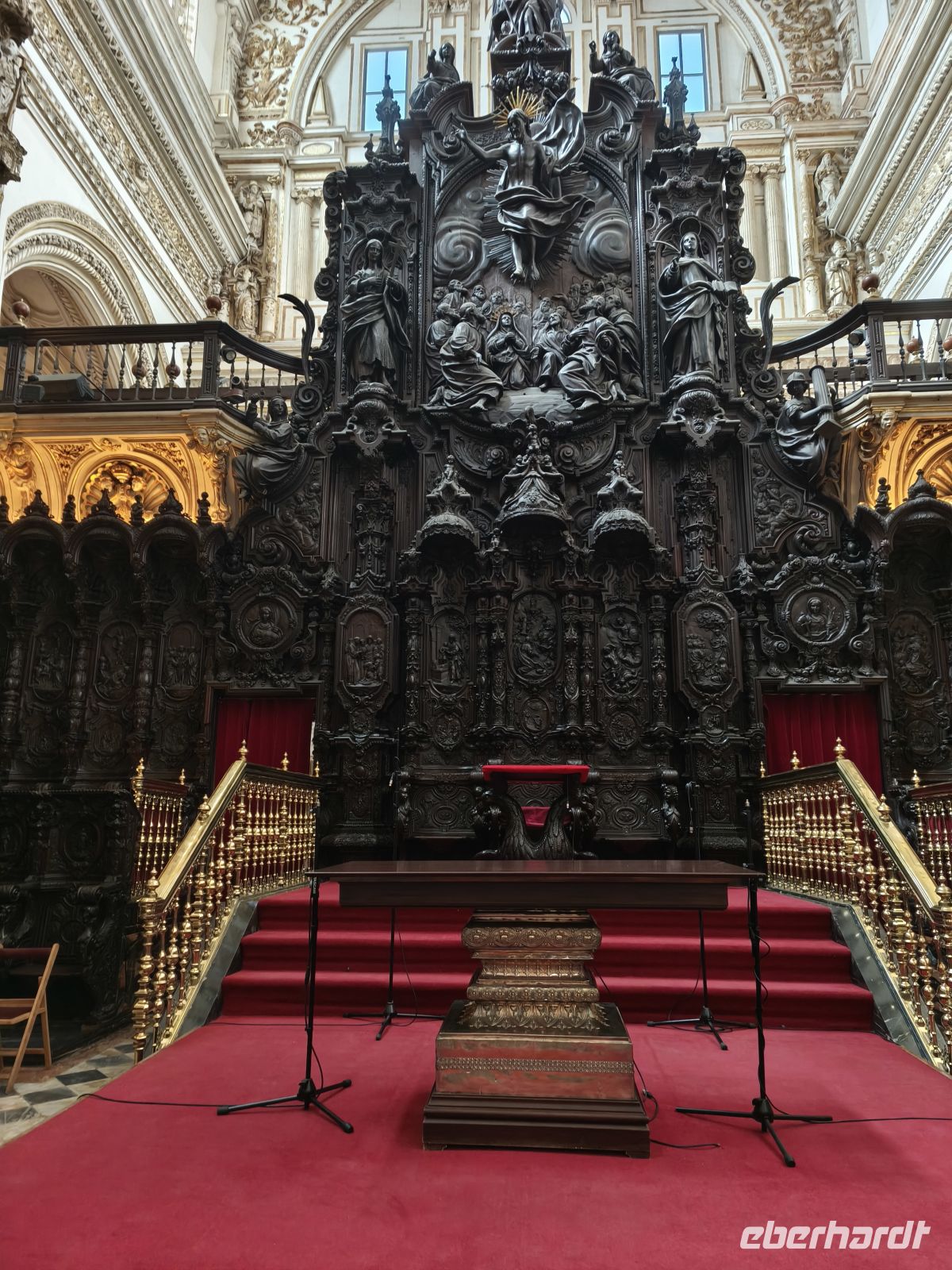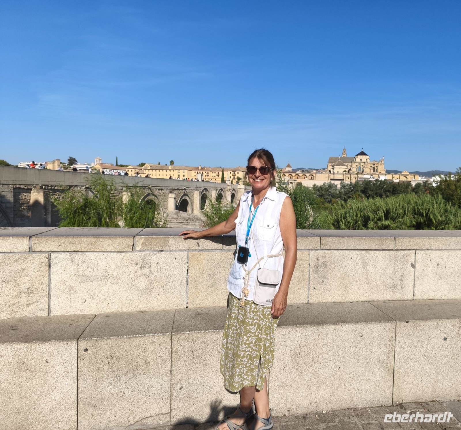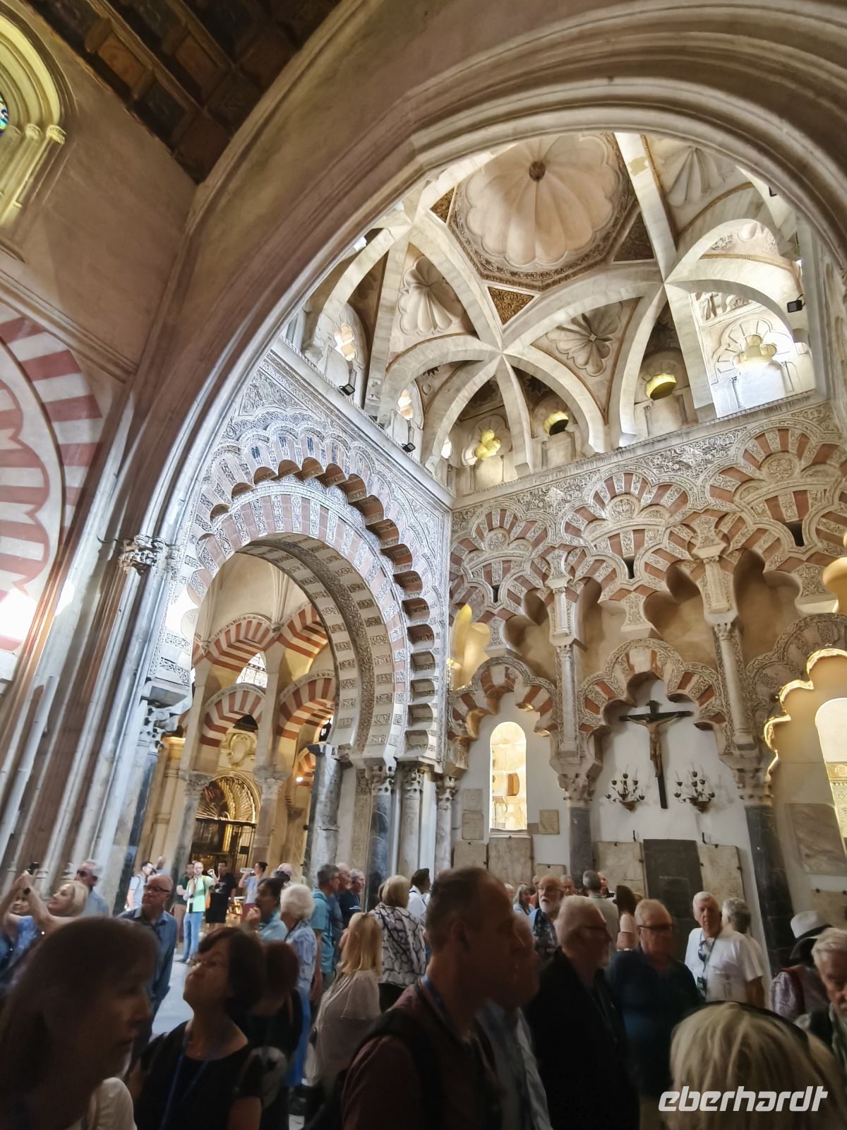 Heute besuchen wir die Stadt Cordoba. Über 16 mächtige Steinbögen führt uns die Puente Romana über den Fluss Guadalquivir direkt auf die Stadt zu. Wir haben einen fantastischer "Postkartenblick" von der Brücke auf die Mezquita Kathedrale, das Wahrzeichen von Cordoba. Am Haupteingang treffen wir unsere örtliche Reiseführerin Nuria. Sie führt uns durch den "Patio de los Naranjos" der mit vielen Orangenbäumen bestückt ist in die Kathedrale. Im inneren erwartet uns ein atemberaubender Anblick: unzählige rot-weiße Bögen, die sich scheinbar endlos durch den Raum ziehen. Nuria erzählt, dass die Moschee im 8Jh. unter den Mauren erbaut wurde und später zur Kathedrale umgebaut wurde, nachdem die Christen die Stadt zurückerobert hatten. Besonders faszinierend war der Gegensatz zwischen der maurischen Architektur und der barocken Kathedrale, die mitten in das ehemalige Gebetshaus, Moschee eingefügt wurde.