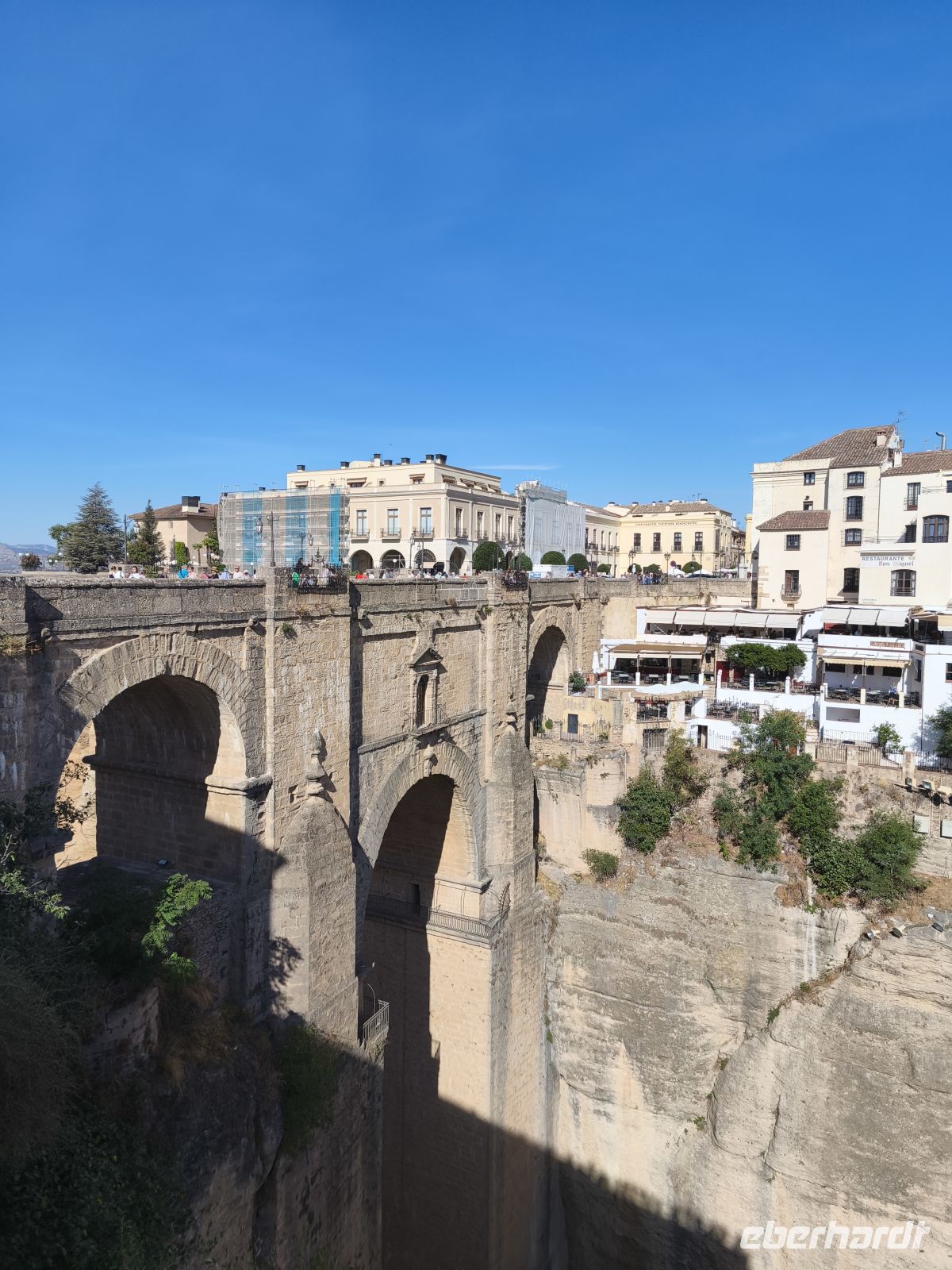 Am Busbahnhof treffen wir unseren örtlichen Reiseführer Daniel. Er erzählt uns, während wir Richtung Altstadt laufen von der langen Geschichte Rondas-von den Römern über die Mauren bis hin zur modernen Zeit. Unser erster Stopp ist die berühmte Puente Nuevo. Die Brücke verbindet die beiden Stadtteile, die durch eine hundert Meter tiefe Schlucht getrennt sind. Von der Aussichtsterrasse haben wir einen atemberaubenden Blick auf die Felsen, die Schlucht und die weißen Häuser. Daniel erzählt uns, dass die Brücke im 18. Jahrhundert nach 40 Jahren Bauzeit fertiggestellt wurde.
