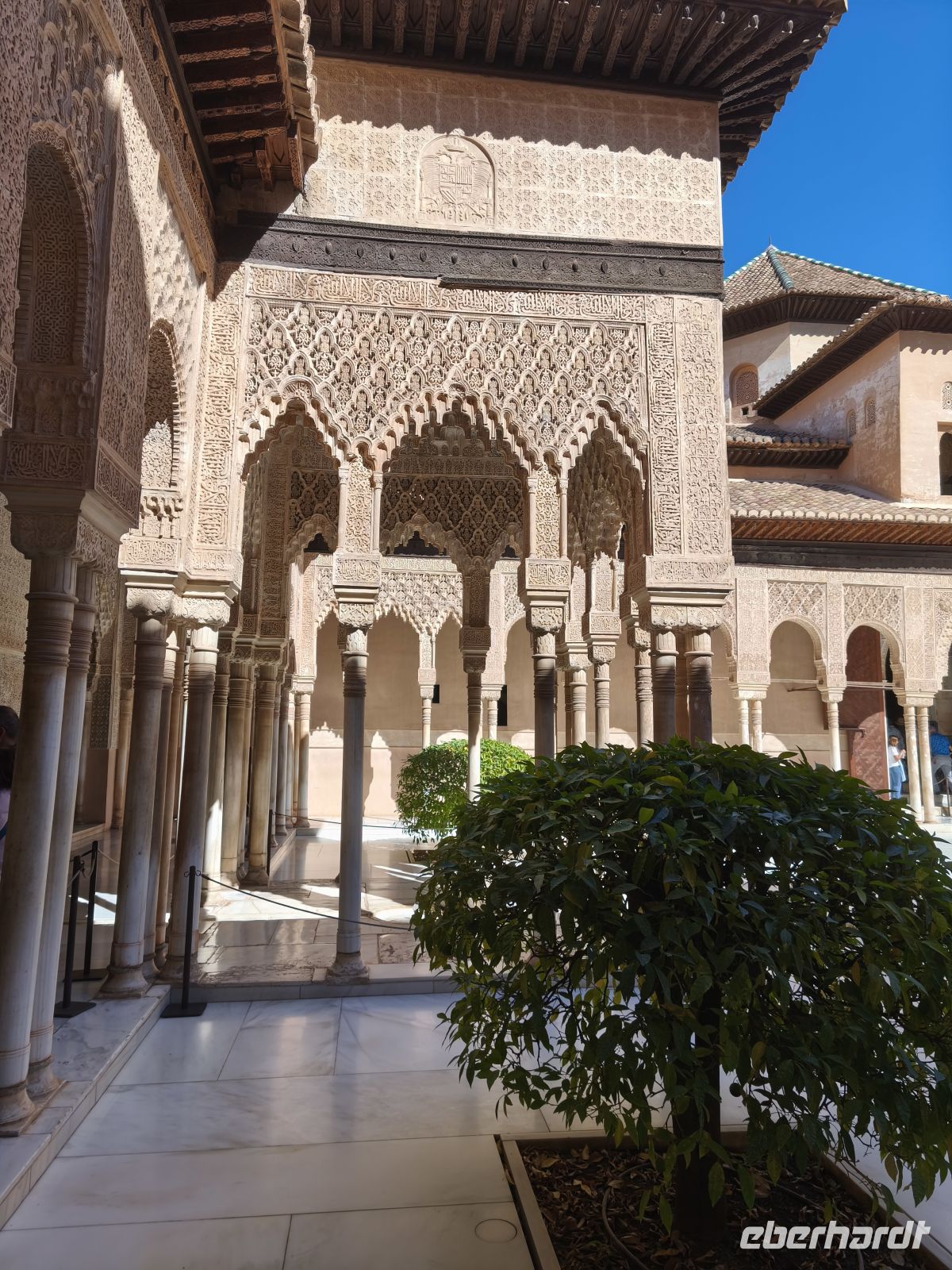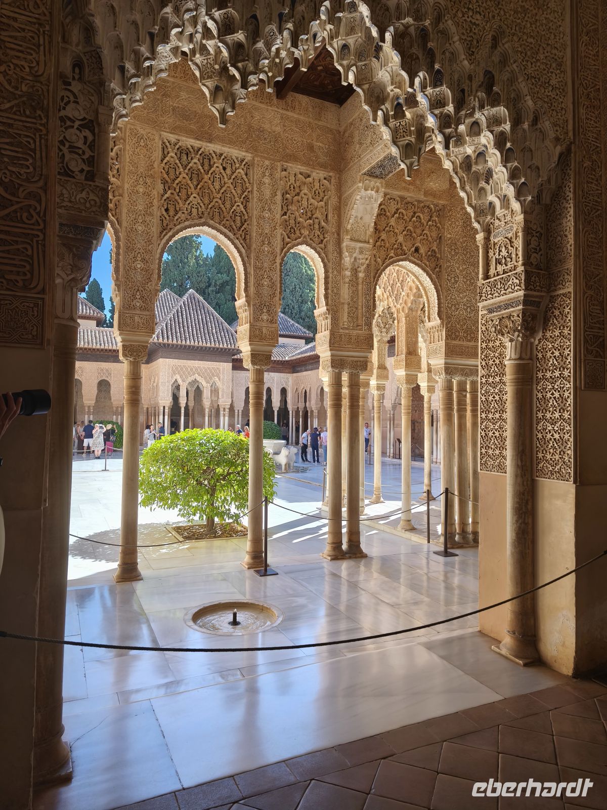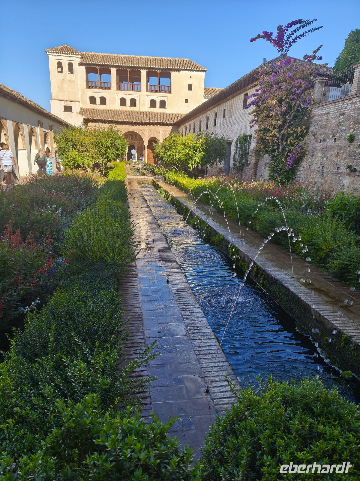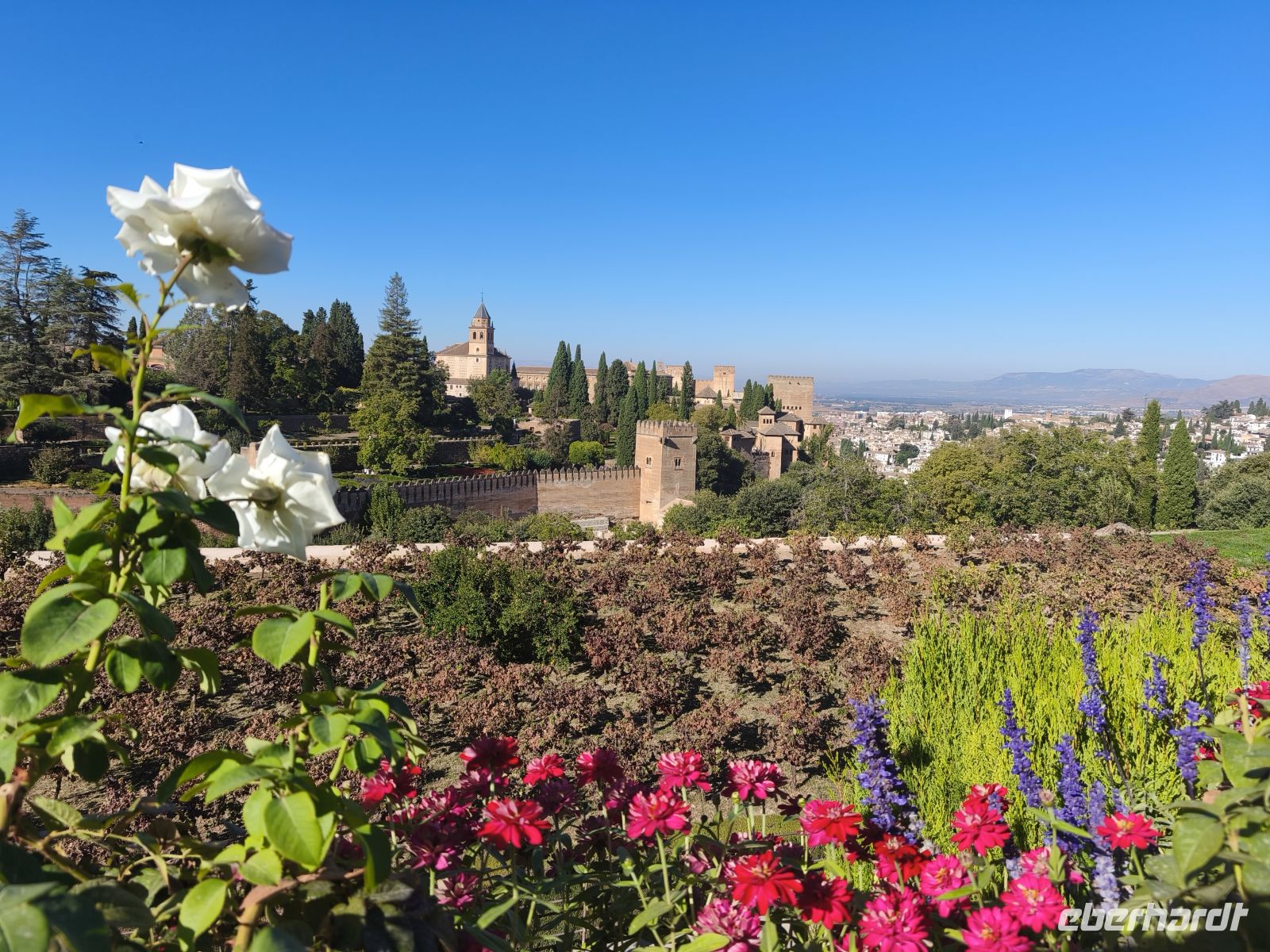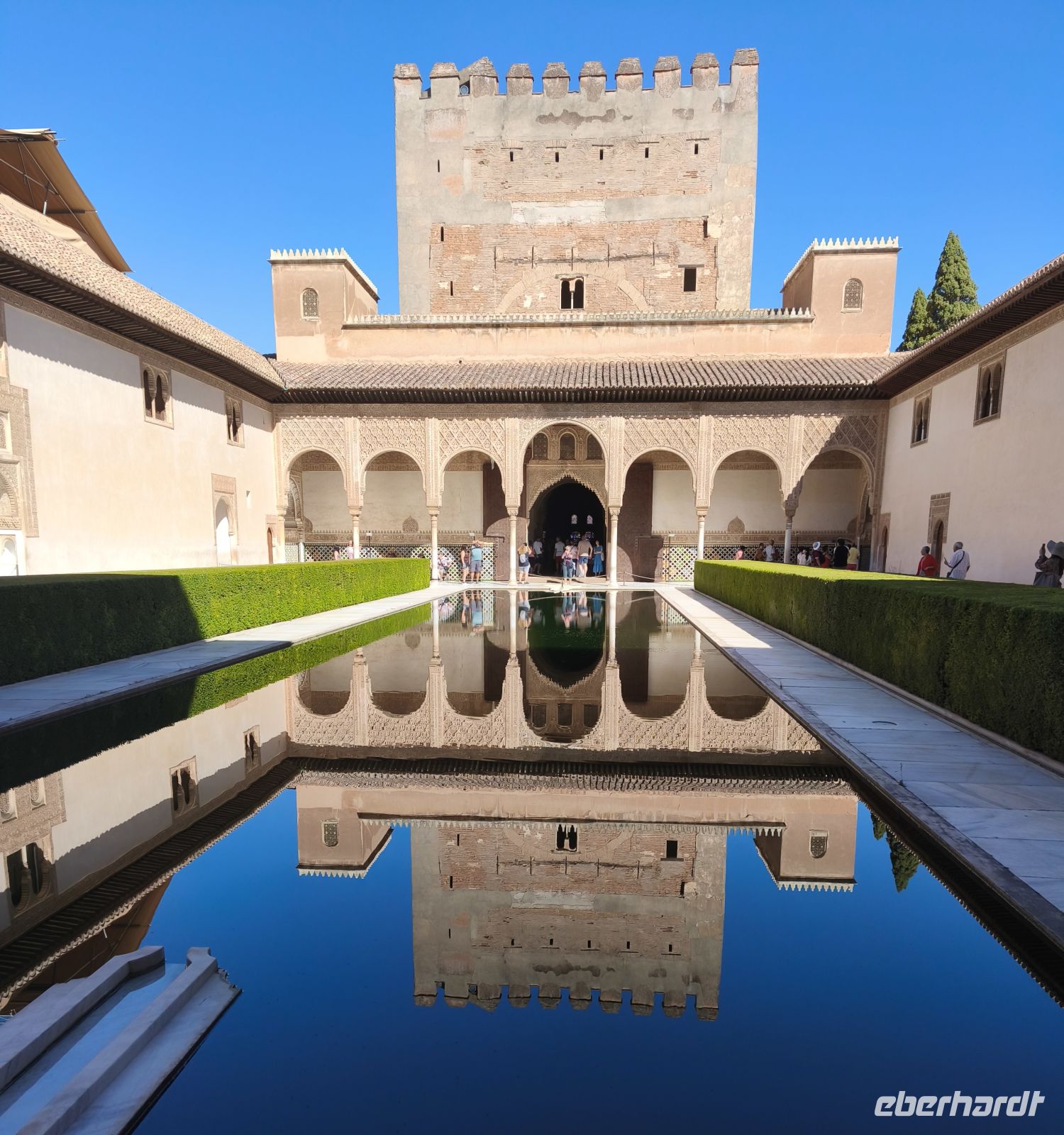 Heute ist sicherlich eine der Höhepunkte der Reise, die Besichtigung der Alhambra und die Gärten des Generalife. UNESCO Kulturerbe erster Klasse und eines der meistbesuchten Attraktionen in Europa und der Welt. Die Alhambra ist eine historische Palast und Festungsanlage, die als herausragendes Beispiel maurischer Architektur gilt. Sie ist ein sehr weitläufiger Komplex aus Palästen, Gärten und Befestigungsanlagen, der sich auf dem Sabikah-Hügel befindet. Der Name Alhambra bedeutet die rote Festung und bezieht sich auf die rötliche Färbung der Mauern. Wir haben einen hervorragenden Reiseführer, Pedro, der exklusiv Eberhardt Reisende führt. Er erklärt uns auf charmante und humorvolle Weise die Architektur und Geschichte der Alhambra und zeigt uns die besten "Postkartenfotomotive" . Wir sind absolut begeistert von dieser einmaligen Anlage. Nach über zwei Stunden endet die Führung und ich laufe mit einigen Gästen einmal um die Alhambra, natürlich mit einem Stopp für ein kühles Getränk und einen kleinen Snack.