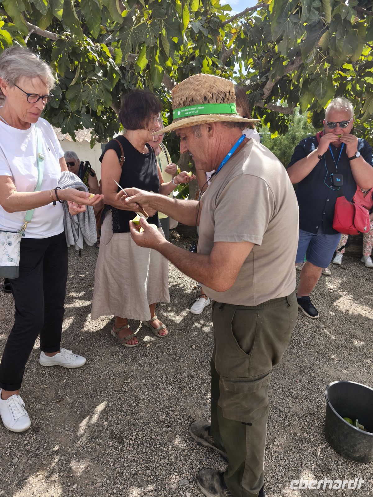 Am Nachmittag besuchen wir die Zitrusplantage von Juanito, ein echtes "Original" . Probieren sie sagt er auf deutsch und reicht jedem ein Stückchen Zitrone. Wir beißen hinein, süß und sauer zugleich....er zwinkert, "wie jede gute Liebe". So humorvoll und mit leicht schlüpfrigen Andeutungen führt er uns durch seine Plantage. Zitronen brauchen Sonne Geduld und zarte Hände, aber nicht zu zart fügt er mit schelmischen Lächeln hinzu. Wir lachen viel und lernen einiges über die vielen verschieden Zitruspflanzen. Am Ende der Tour dürfen wir seinen leckeren Orangensaft probieren.