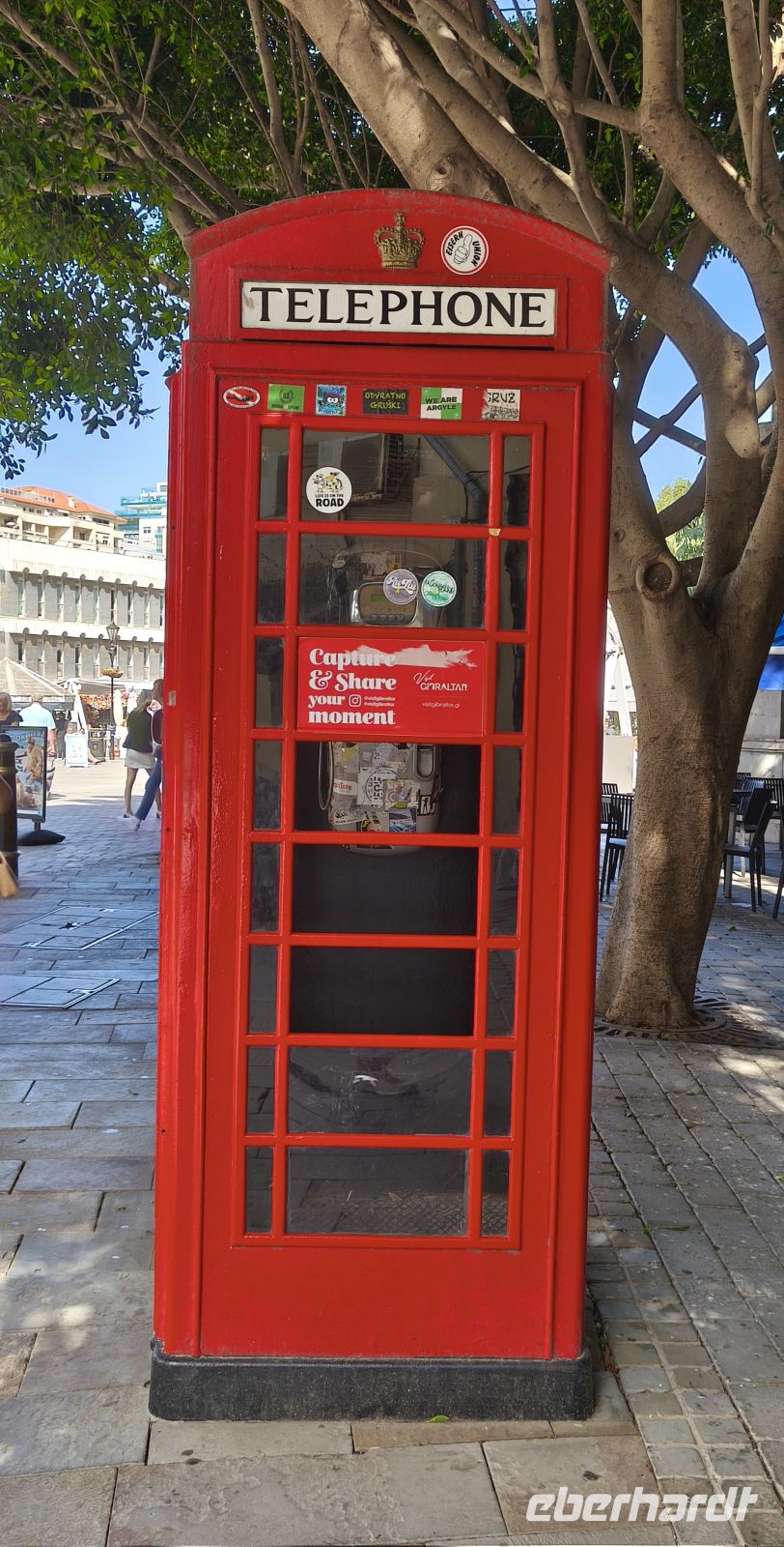 Am Ende der Rundfahrt entlässt uns Claudine an der Main Street. Hier gibt es britische Ordnung und mediterrane Lebensart. Gesäumt von Häusern im Kolonialstil gibt es Pubs mit Fish and Chips und Bars mit Tapas. Man entdeckt auch eine rote Telefonzelle.