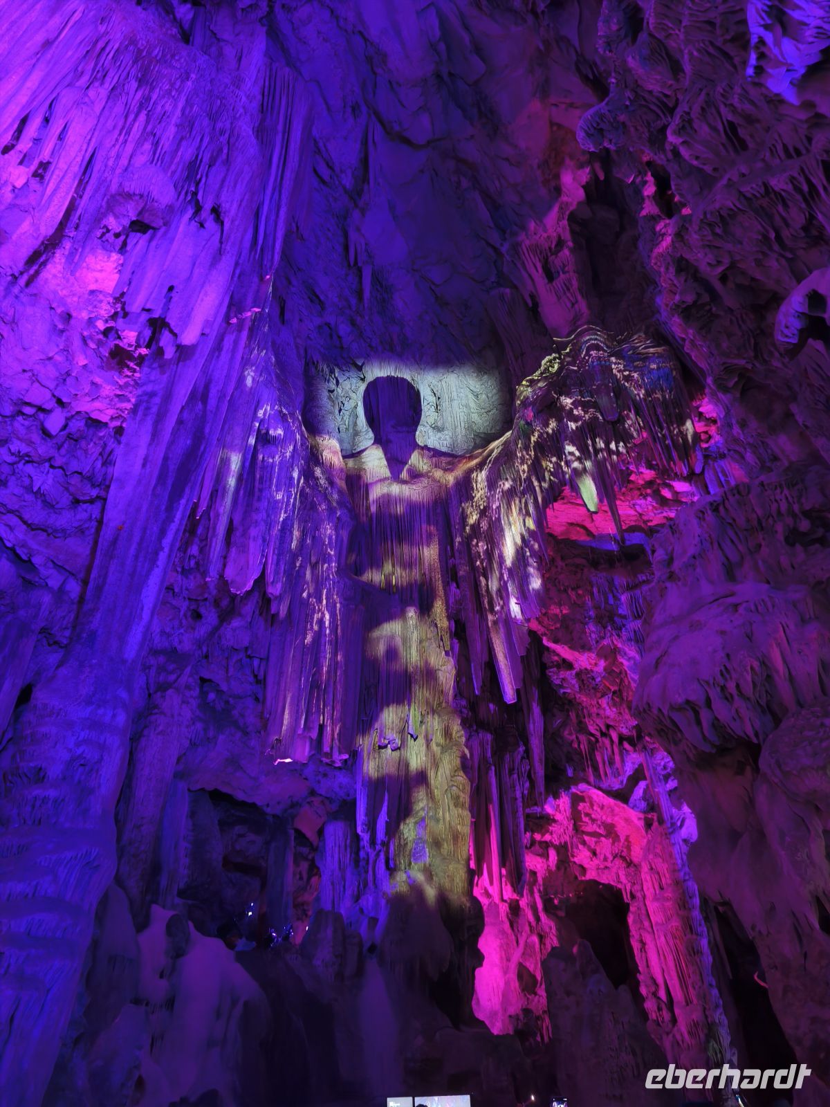 Angekommen müssen wir die Passkontrolle passieren, spanische Seite, englische Seite dann sind wir im britischen Überseegebiet. Dort erwartet uns ein Kleinbus mit Claudine unserer Fahrerin. Wir fahren kurvenreich hoch zum Europa Point wo wir bis Afrika schauen können nur 14km entfernt. Weiter geht es zur Höhle St. Michaels Cave. Wir spazieren durch und sind beeindruckt, es gibt eine Licht und Klanginstallation und bei genauem hinsehen meint man einen Engel zwischen Stalagmiten und Stalaktiten zu erkennen.