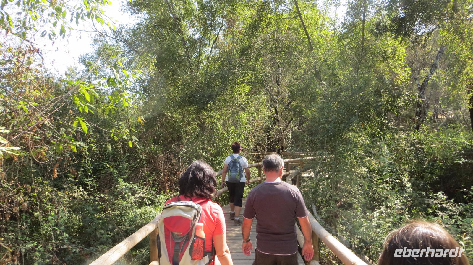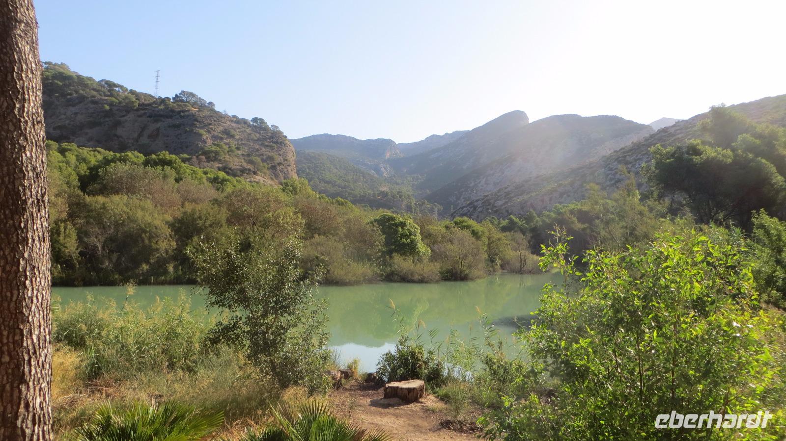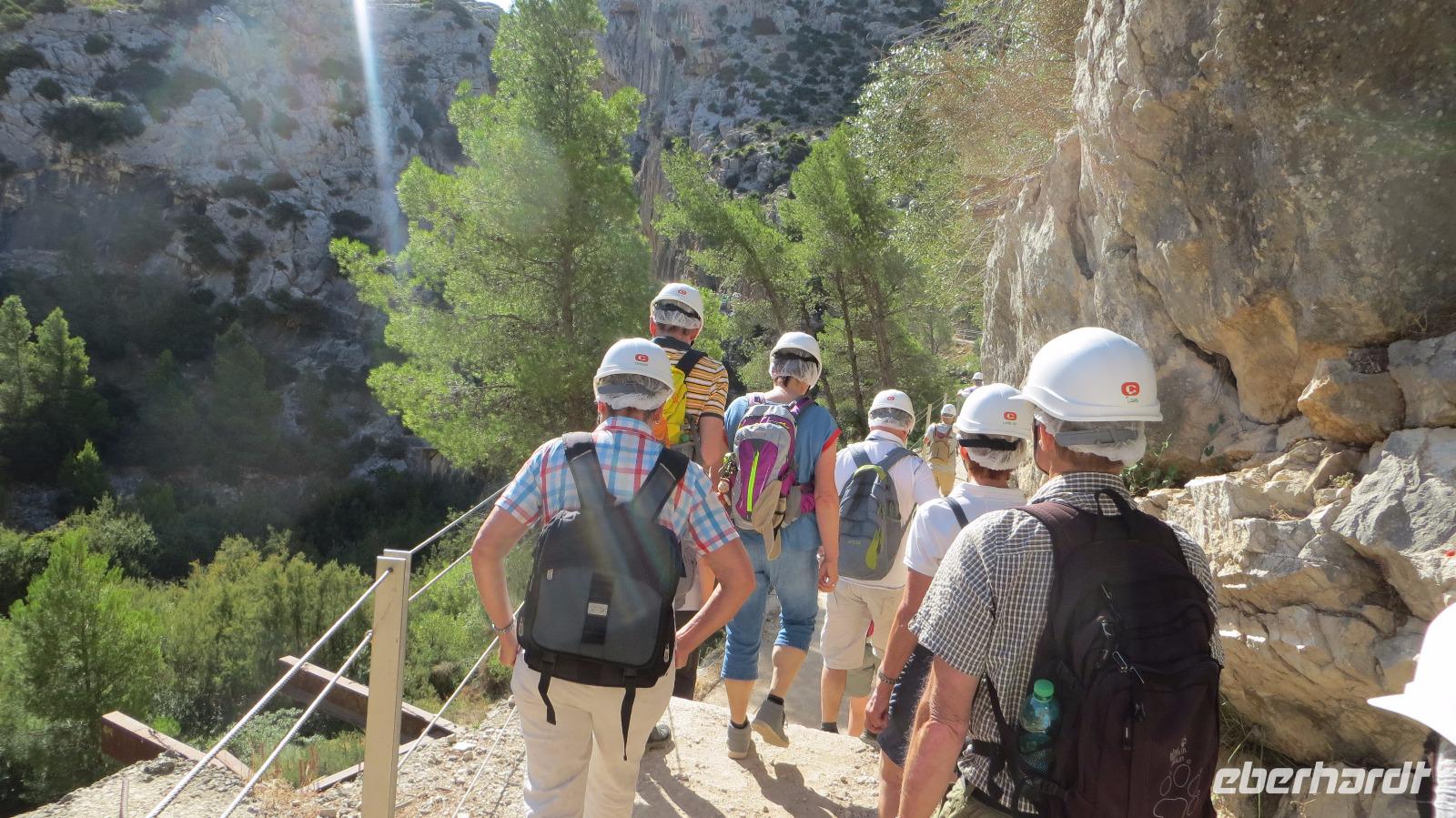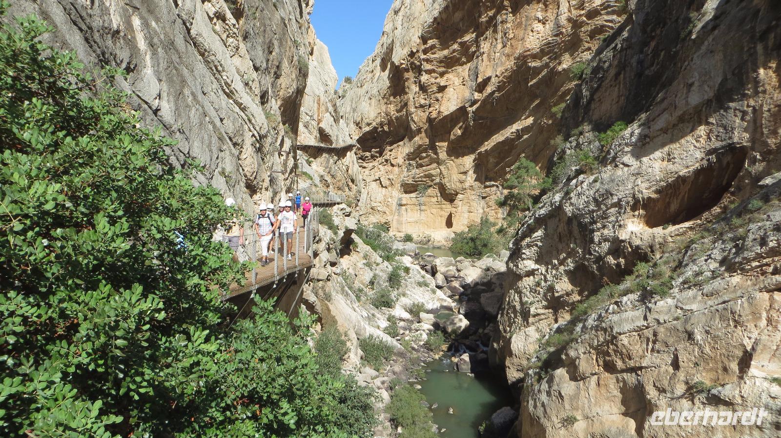 Die Sonne schien und unser Abenteuer begann! Wir fuhren durch das Guadalhorce-Tal in Richtung Nordem bis Ardales. Auf diesem Weg haben wir die verschiedene Zitronen- und Orangenplantage der Provinz gesehen. In Ardales angekommen, sind wir ausgestiegen und sind unsere ersten 2,7 Km bis zum Eingang des Caminito del Rey gegangen. Am Anfang war es etwas frisch aber langsam kamen die warmen Temperaturen und wir konnten erste Eindrücke von Crecendo bekommen. Eine leichte Brise mit Mittelmeeraroma, die ruhige Lage zwischen Kiefern und dem See sowie der Klang der Natur machten diese erste Strecke zu einem ganz besonderen Erlebnis.
