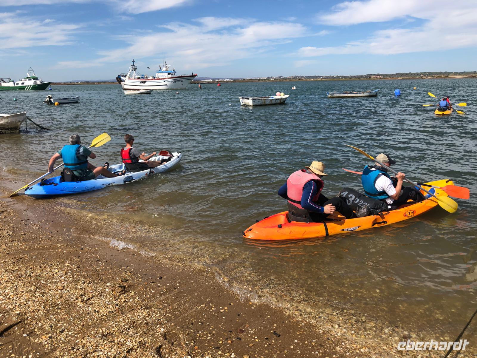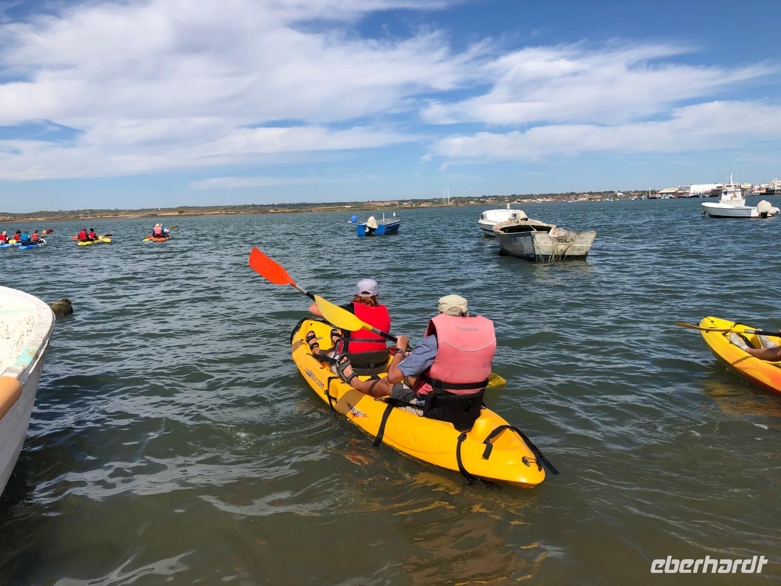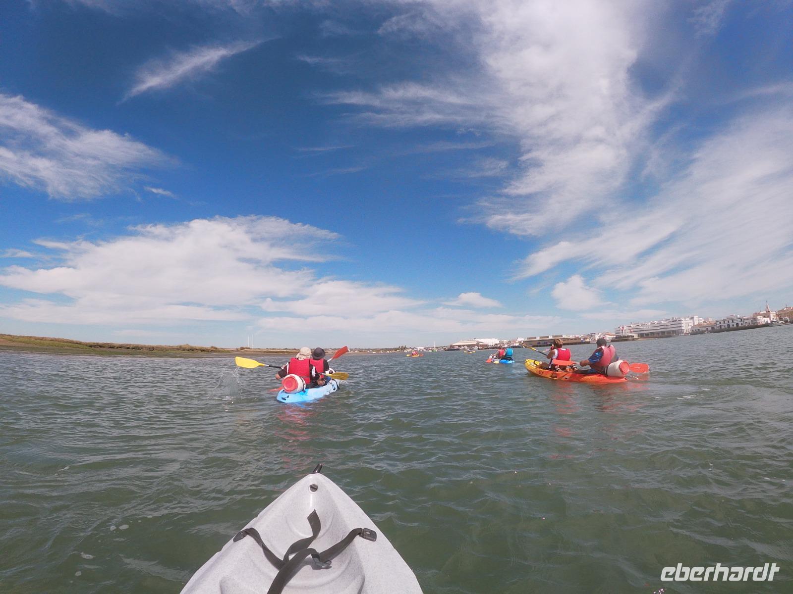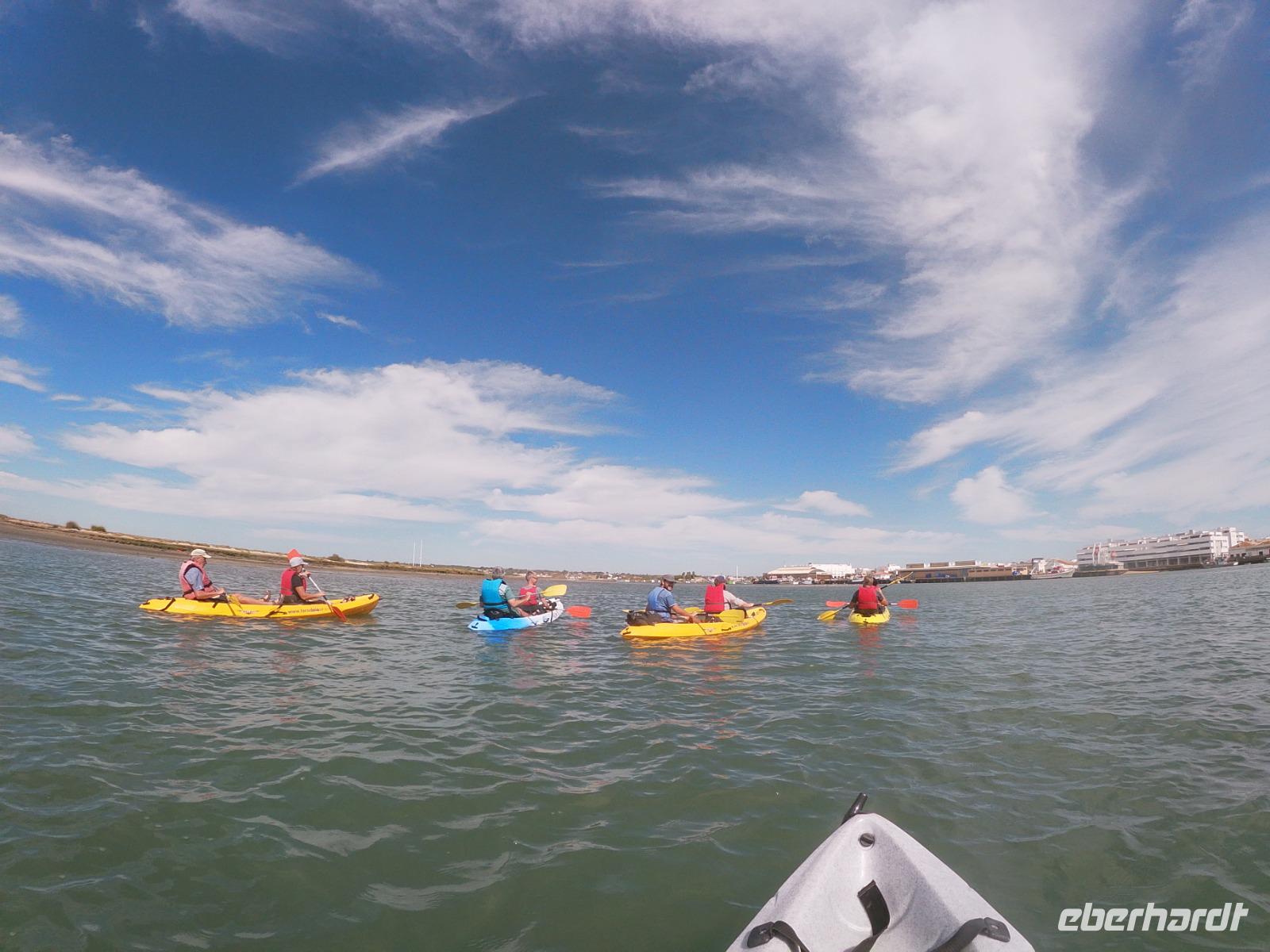 Im Yachthafen Isla Cristinas suchten wir unsere Kayak auf und eroberten, nach kurzem Einleitungskurs, das Wasser. Mit gelernter Technik probierten wir unsere Kenntnisse und Fähigkeiten im Wasser aus. Wir verließen den Hafen und besuchten die Sümpfe, jedoch machte es die Strömung zwischen diesen Streckenabschnitten etwas komplizierter. Trotz dessen haben wir die Aufgabe gemeistert. Auf unsere Route sahen wir den Fischermarkt und erkundeten den Atlantik, was uns aufgrund von Niedrigwasser ermöglicht wurde. Am Strand angekommen machten wir eine kleine Pause und fuhren nach dieser von der Strömung getrieben bis in die Sümpfe. In den Sümpfen angekommen fuhren wir soweit wie möglich rein und sahen zahlreiche kleine Krabben und Vögel. Auf der Rückfahrt besuchten wir wieder den Strand mit dem Leuchtturm.