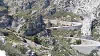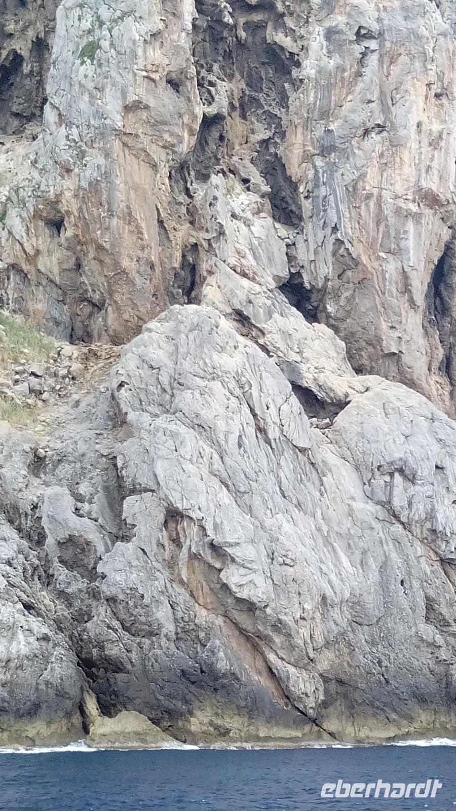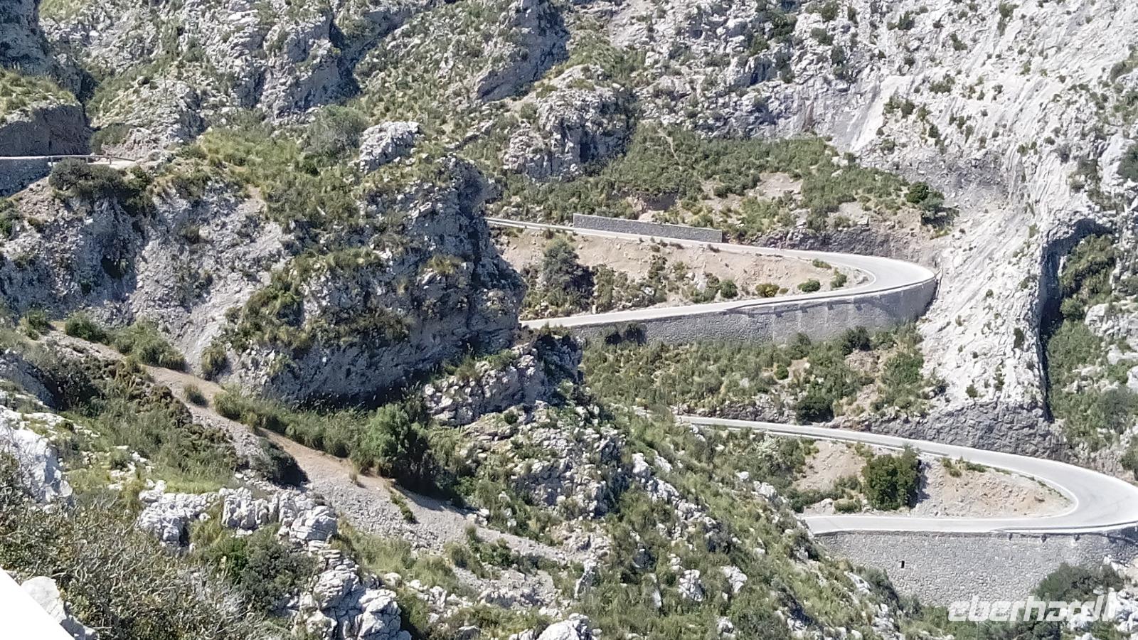 -Serpentinenstraße mit Krawattenknoten (nudo de la corbata) und unzähligen Fahrradfahrern nach Sa Calobra: Mittagessen in Bucht, Spaziergang durch mehrere Tunnel zur Schlucht Torrent de Pareis: hinter der Bucht und hinter Felsen eröffnete sich ein ungewöhnlicher "Hinterstrand" inmitten von steilen Felsen