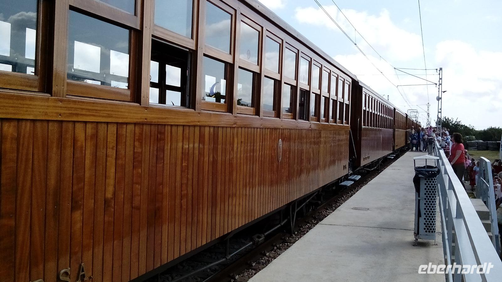 -mit altmodischem Zug (1913) durch viele Tunnel im Tramuntana-Gebirge bis Son Reus (son = von)
