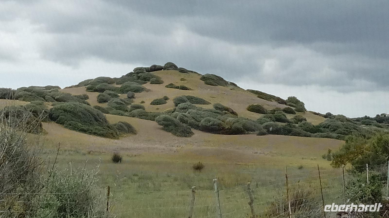 -Fotostopp kurz vor Cap de Cavallería (da sonst keine Wendemöglichkeit für Bus): interessanter Bewuchs, ganz nach Wind ausgerichtet: Büsche im Norden "weggeduckt", Richtung Süden "geöffnet"; imposante Steilküste; Wasser auf zwei Seiten