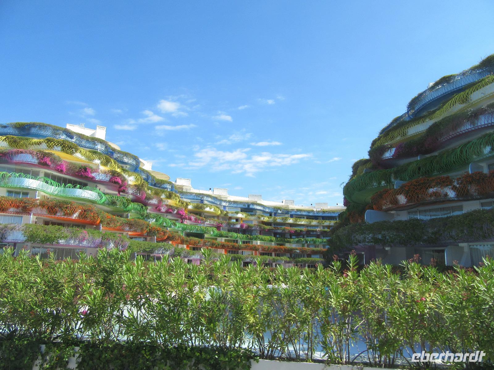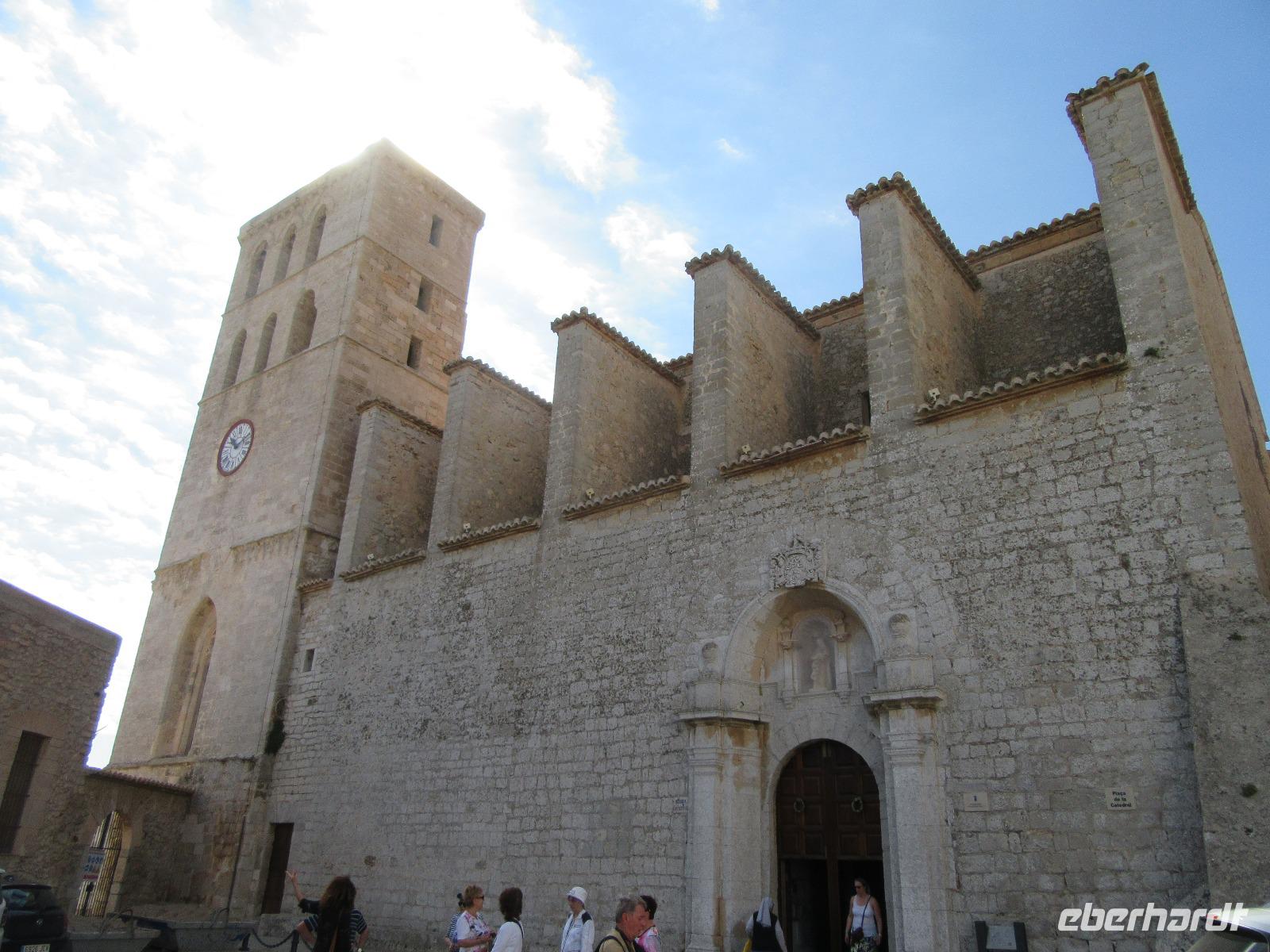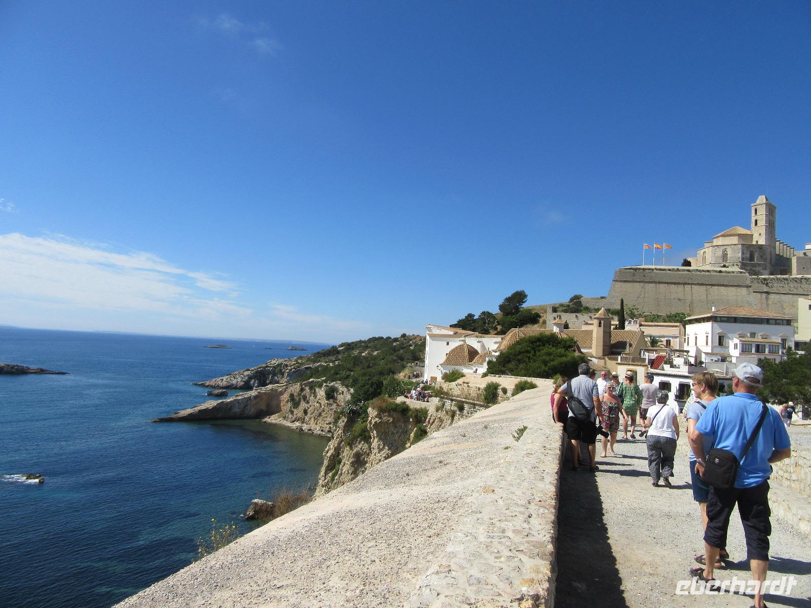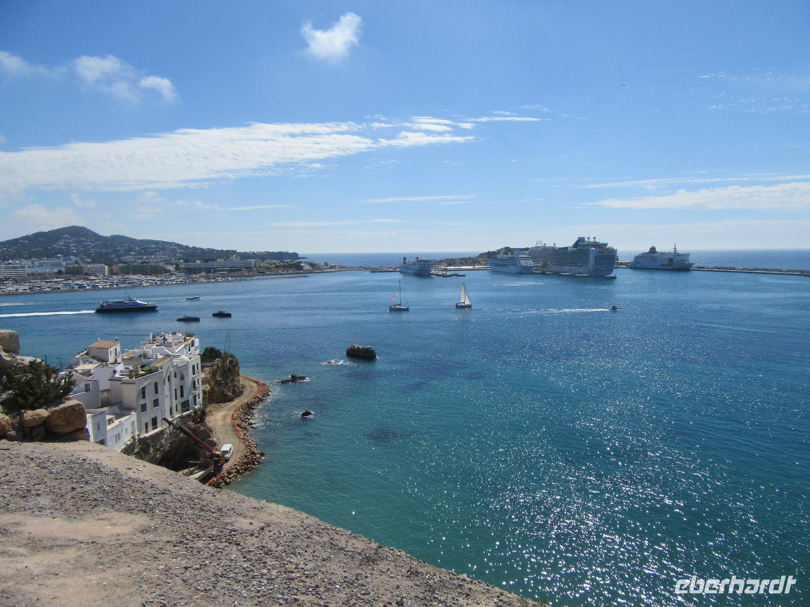 Ibiza oder auf Katalanisch "Eivissa" wartet auf uns. Am Anfang des Tages spazieren wir entlang der Promenade, bis unser Bus ankam und wir uns mit unserer Reiseleiterin Cheska und unserem Busfahrer Juan bekannt machten. Alle zusammen fuhren wir erst in die Hauptstadt, mit dem charakteristischen Hügel der Metropole und besuchten die Altstadt "Dalt Vila". Wir überquerten die alte Mauer von unten nach oben, sahen auf unserem Weg das alte defensive System und einen alten Canyon. Auf dem höchsten Punkt angekommen hatten wir den besten Ausblick über die Bucht und auf der anderen Seite auf Playa d'En Bossa, wo sich die berühmten Hard Rock und Ushuaia Hotels und die großen Partyanlagen befinden. Wir besuchten die Kathedrale und sahen die Schutz-Madonna "Unsere Jungfrau vom Schnee" Dann ging es wieder runter und wir fuhren durch den Yachthafen, vorbei an der Statue der Hand mit den Podencos (Hunden) und die teuersten Apartments der Insel befinden. Leider haben wir dort Paris Hilton oder bekannte Fußballspieler nicht getroffen, aber wir können zumindest sagen, dass wir den größten Hafen Europas gesehen haben.