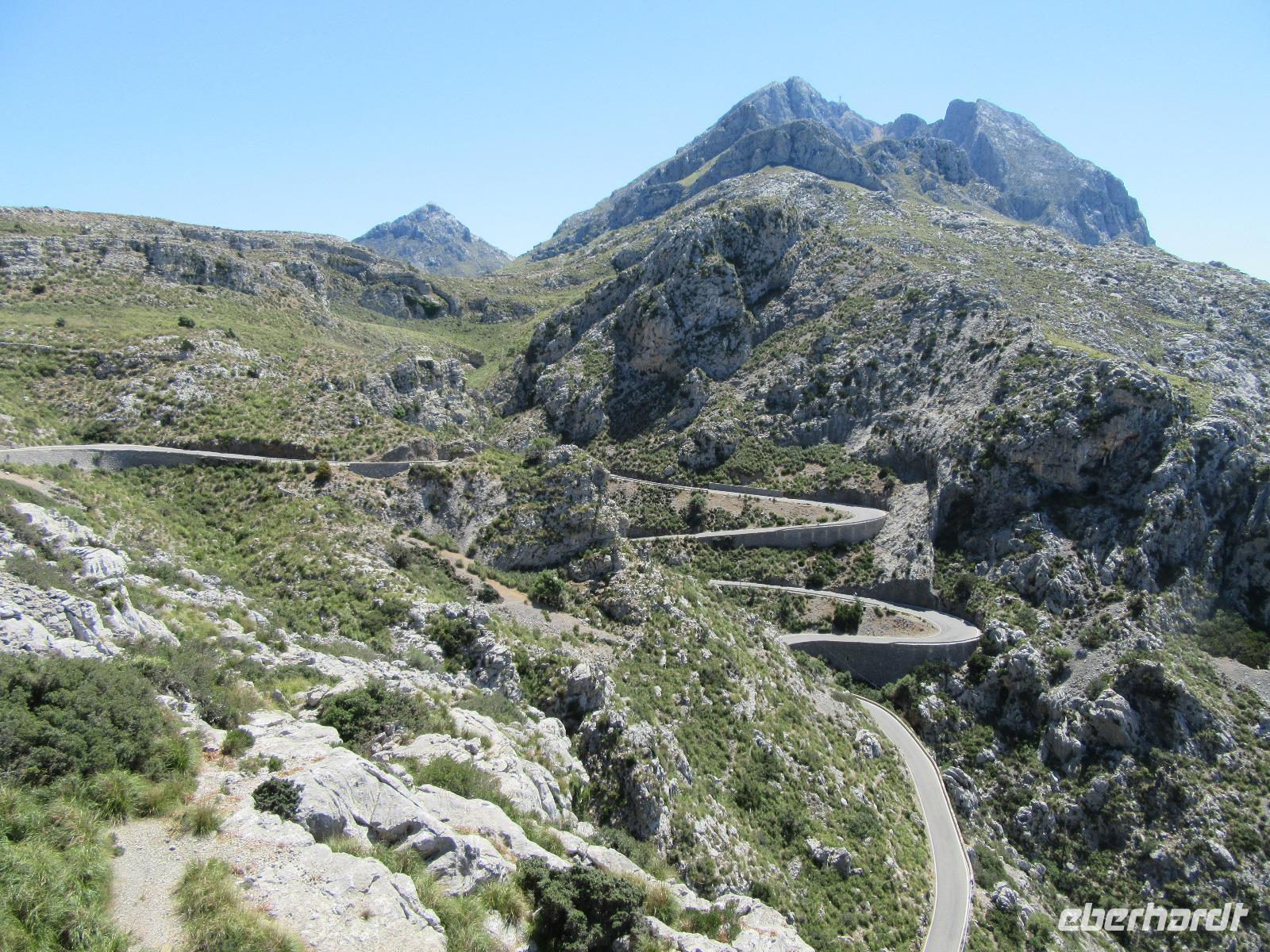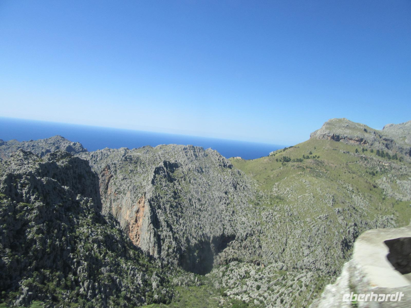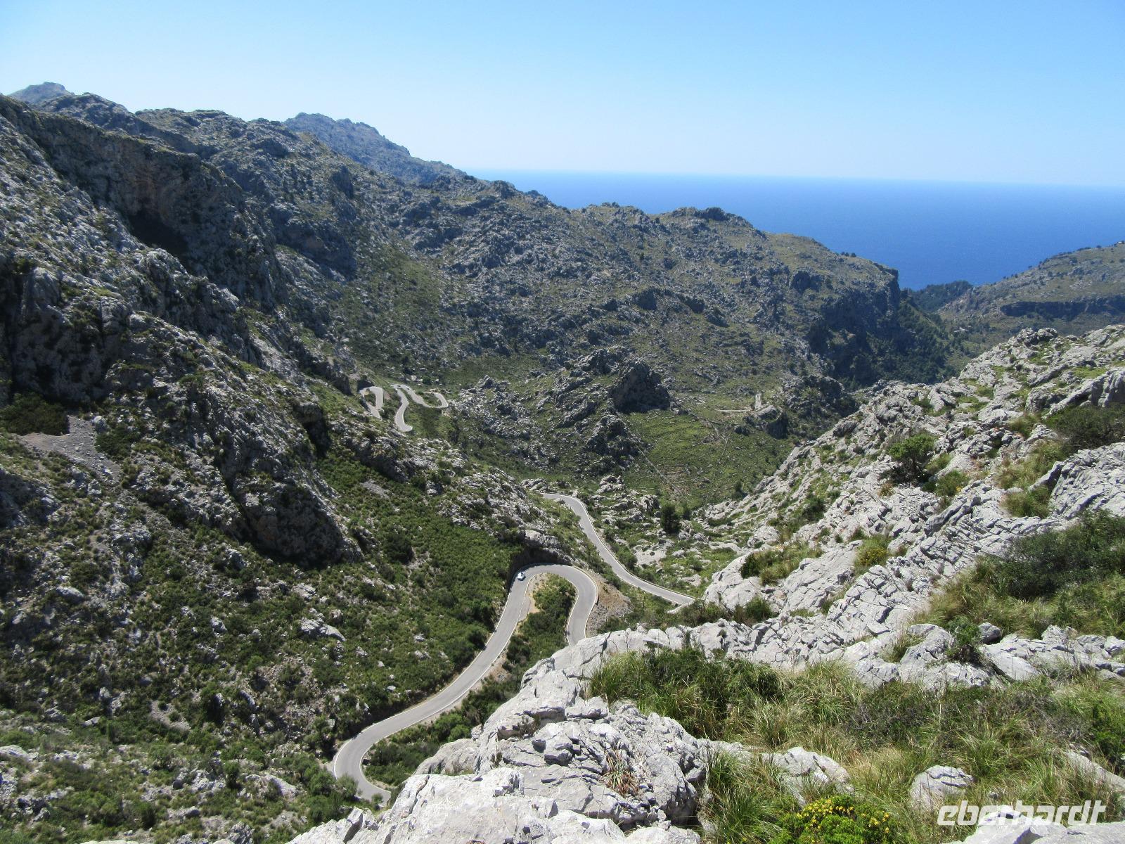 Anschließend fuhren wir über die 9 Km Serpentinenstraße auf einen Berg bis ca. 900 m Höhe. Auf diesem höchsten Punkt der Serpentinenstraße, machten wir einen Fotostopp auf dem Aussichtspunkt Nus de Sa Corbata. Die Ziegen, welche in den Steinen umher sprangen amüsierten uns.