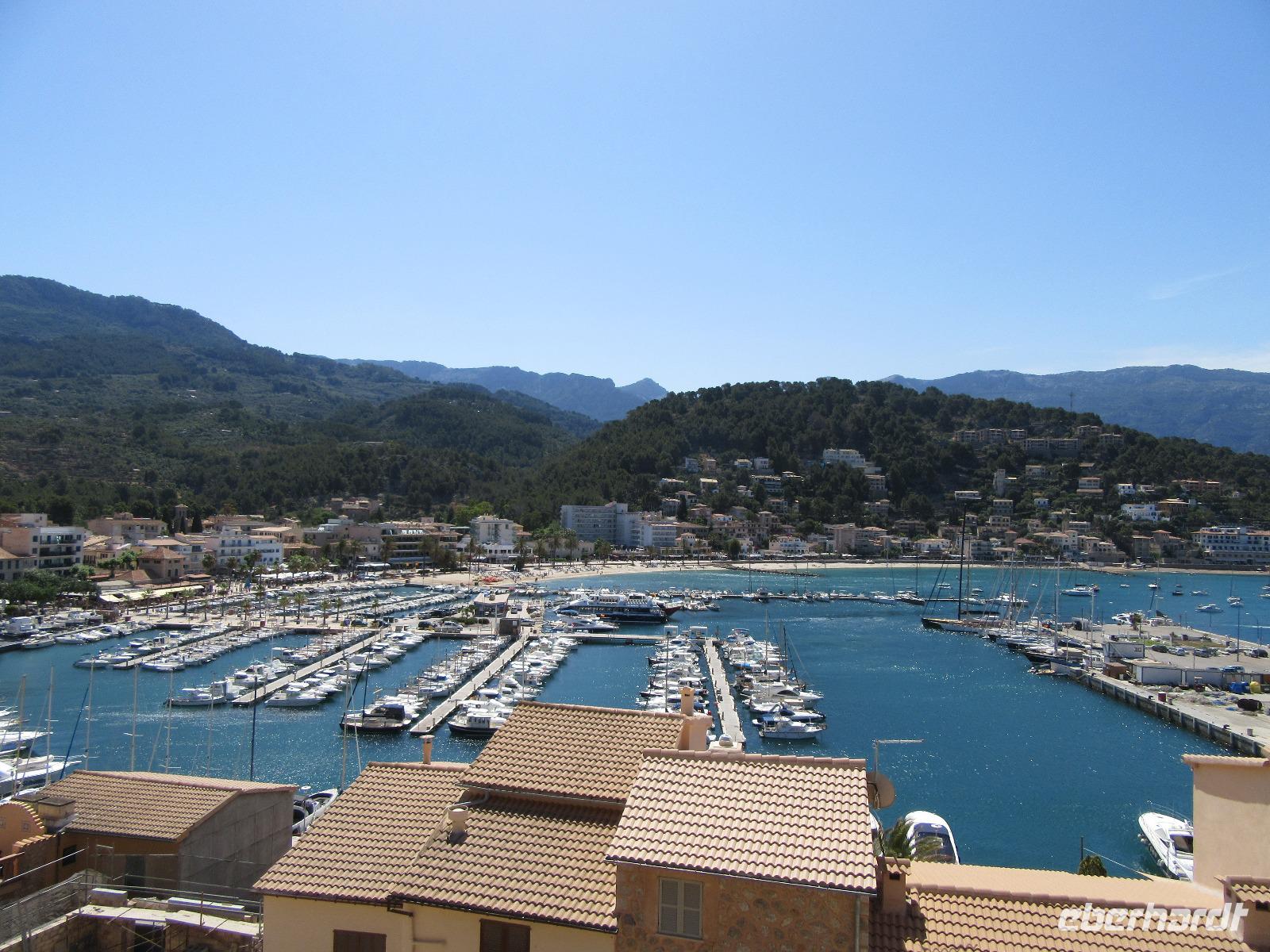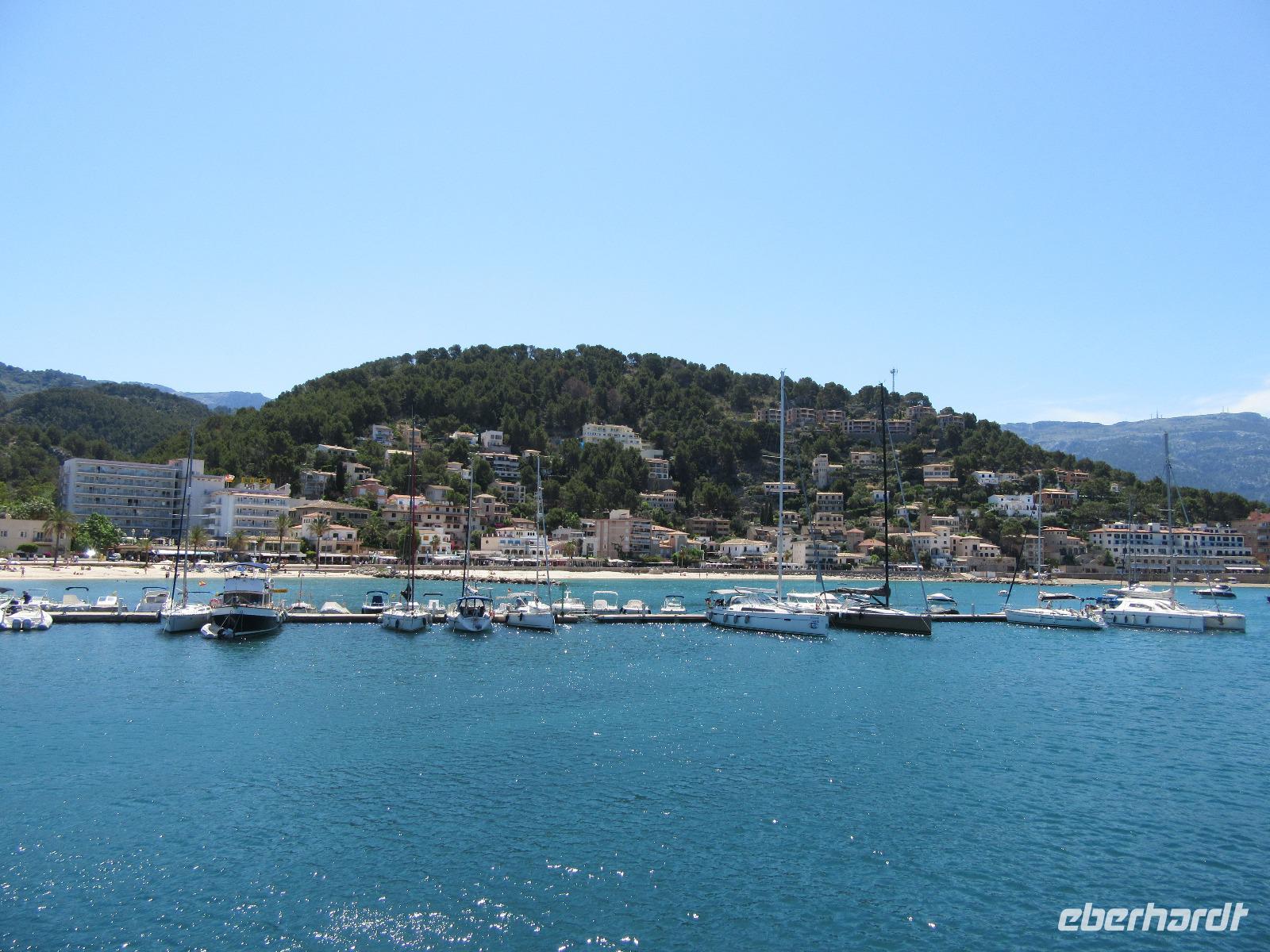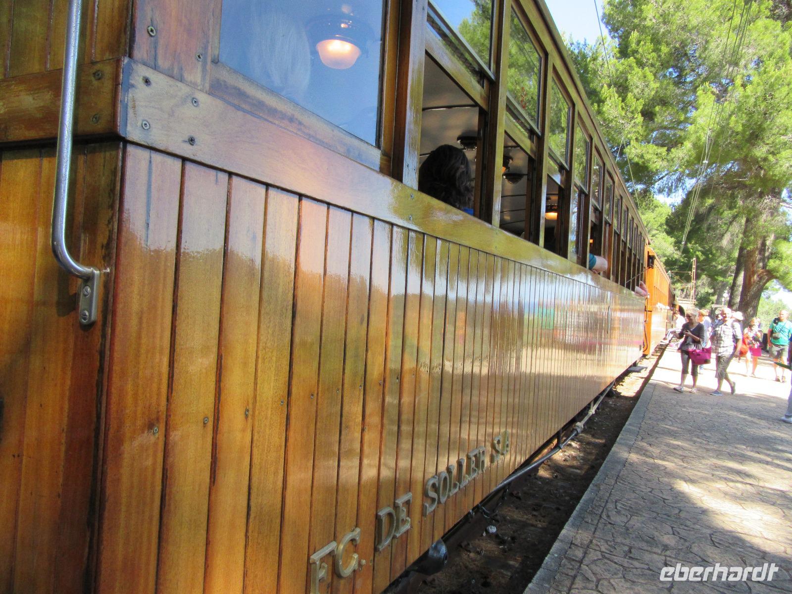 An diesen Tag wollten wir die verschiedenen Verkehrsmittel der Insel benutzen. Am Anfang des Tages fuhren wir durch die Platja de Palma und sahen den bekannten Ballermann und den Balneario Nummer 6. Aber das war nicht der Grund unserer Reise, deswegen fuhren wir zur Bahnstation und fuhren mit der Eisenbahn Roter Blitz bis Soller. Die Strecke war sehr interessant durch die Landschaft des Tramuntana Gebirge durch Johannesbrot-, Feigen- und Mandelbäume und die verschiedenen Tunnel, wo der längste ca. 3 Km ist. Natürlich, machten wir den traditionellen Fotostopp, bevor wir in Soller angekommen sind. In Soller angekommen, nahmen wir die historische Straßenbahn bis Port Soller. Dort hatten wir kurz Zeit zur freien Verfügung, um auf eine Terrasse und/oder zum Aussichtspunkt auf dem Hügel zu gehen oder einfach durch den Hafen zu spazieren.