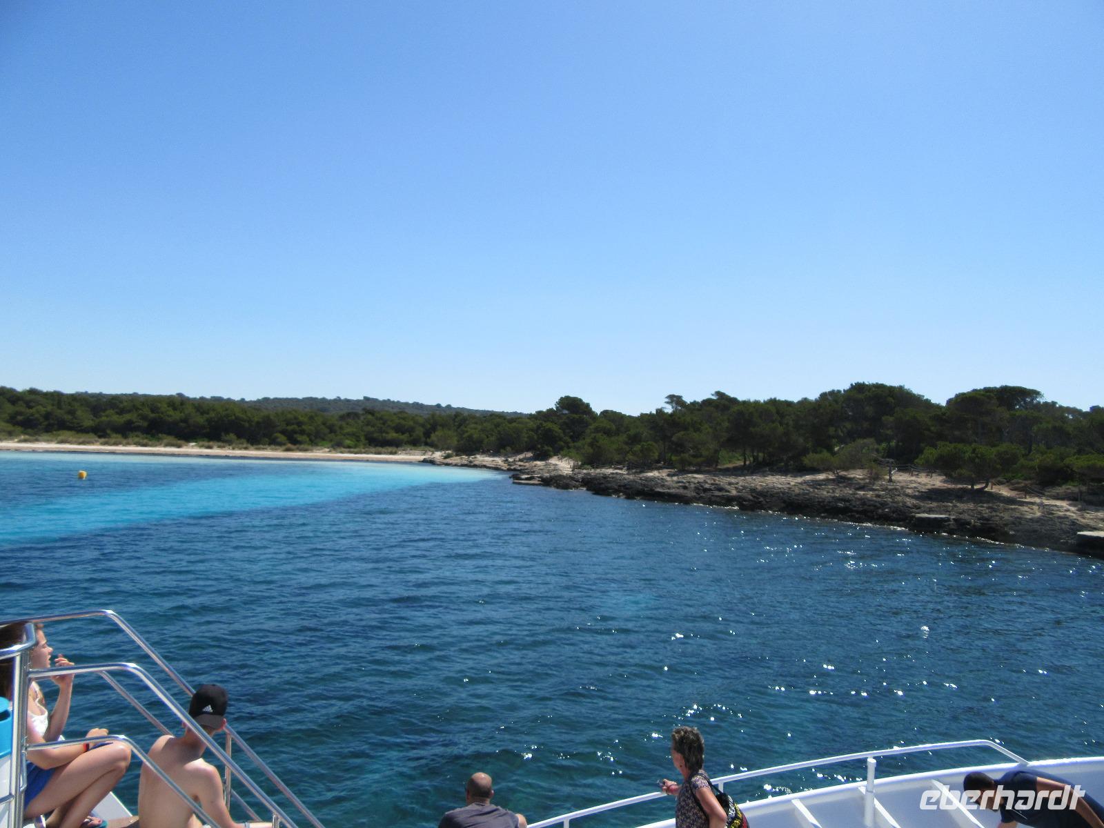 Ein Stück weiter machten wir unseren ersten Badestopp in Platges de Son Saura, wo wir die Möglichkeit hatten, entweder an diesen Strand zum Baden oder ca. 15 Minuten laufen an der Küste lang bis Es Talaier. Nach der Freizeit, kamen wir zum Boot zurück und genossen dort eine leckere Paella mit Sangría. Natürlich nach diesem Badestopp, konnten wir noch einmal Es Talaier bewundern, der Mittel Mai 2017 zum besten Strand Spaniens erklärt wurde. Man kann nur zu Fuß oder mit dem Boot kommen. Auf der einen Seite der Bucht befindet sich ein alter arabischer Wachturm und auf der anderen Seite der bekannte Cala en Turqueta, welcher seinen Namen von der türkisenen Farbe des Wassers erhalten. Dort machten wir auf unserer Rückfahrt den zweiten Badestopp. Man konnte direkt vom Boot springen oder ein Stück zu Fuß zum Strand laufen.