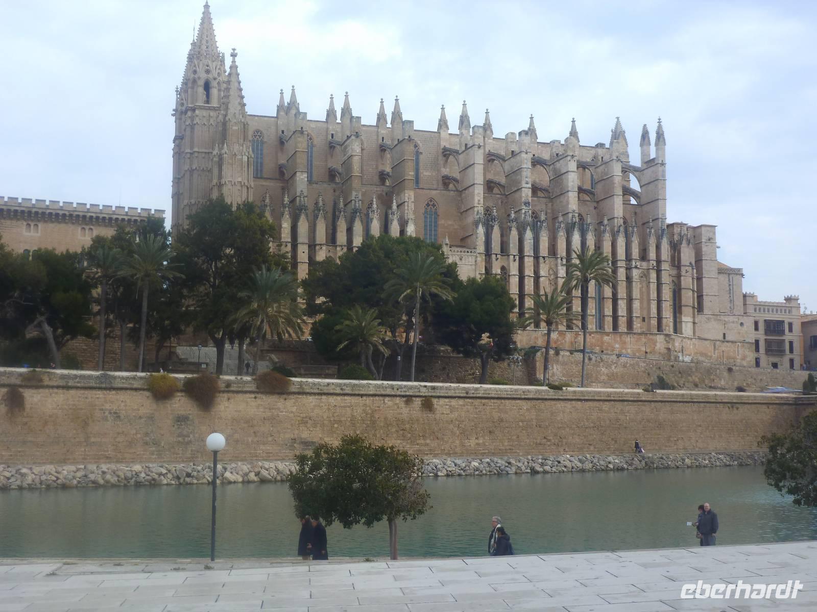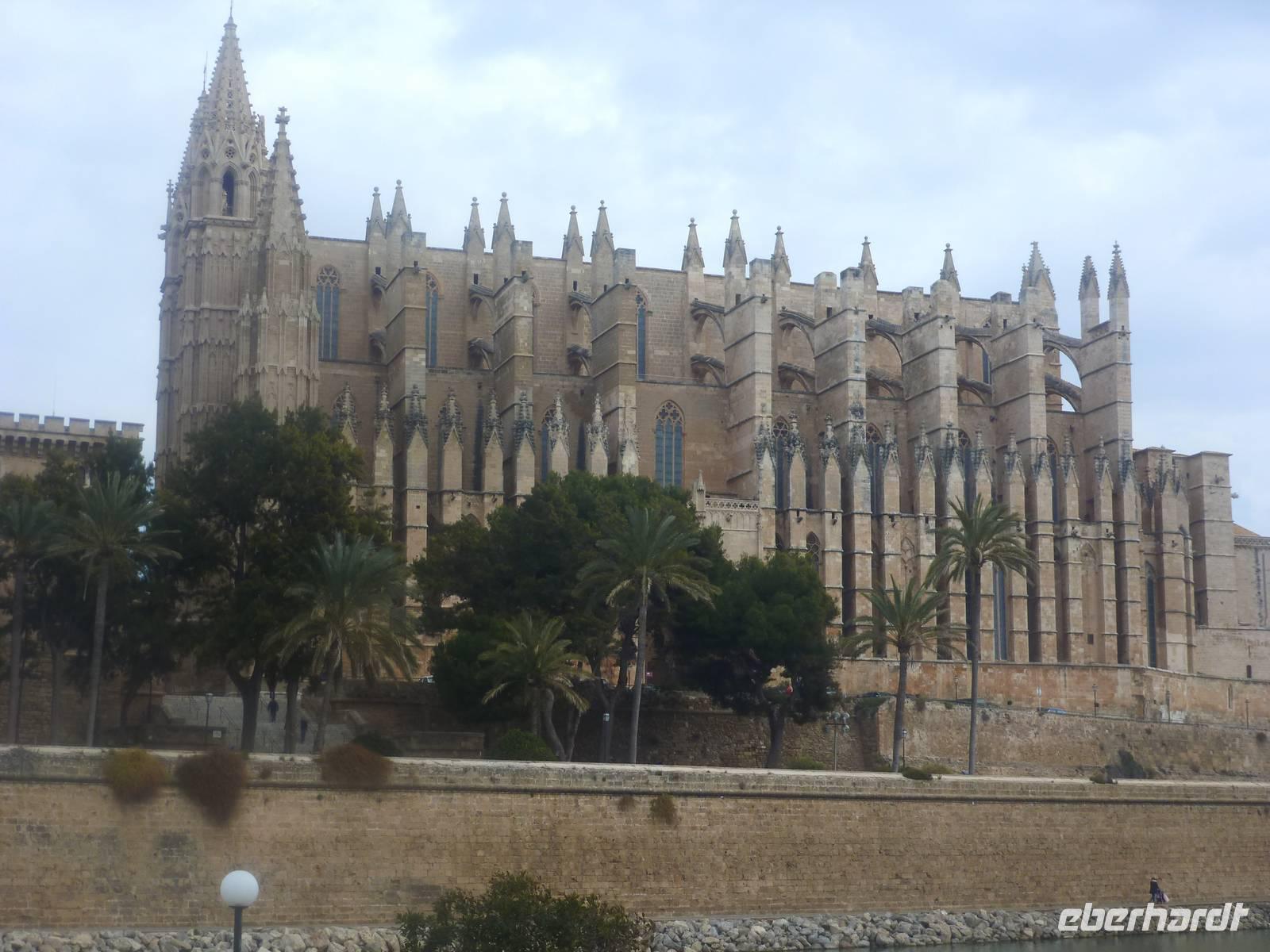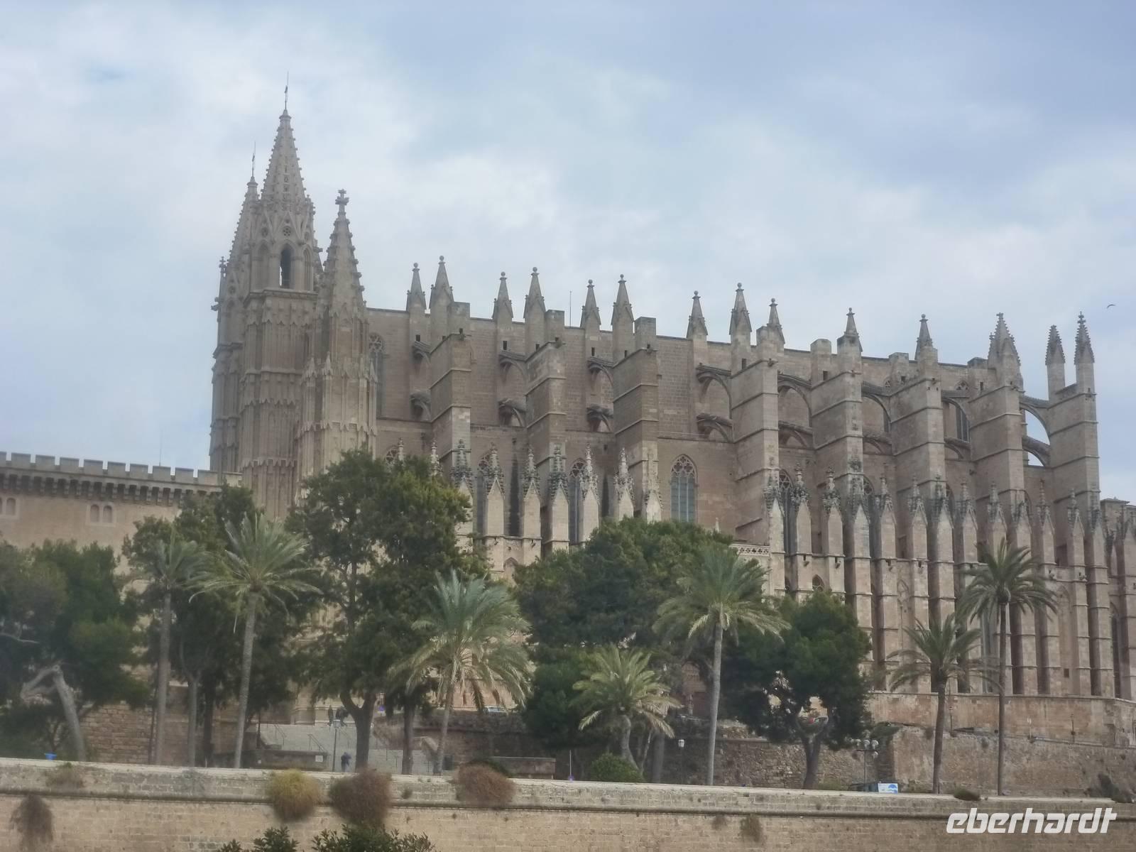 Der wunderschöne Ausblick über das bergige Hinterland, das weite Meer, die Stadt Palma, mit den vielen Jachten im Hafen und der Altstadt war atemberaubend schön. Unser nächstes Ziel, die prächtige Kathedrale „La Seu". Das ca. 110 Meter lange Hauptschiff fasziniert vor allem durch die 14 schlanken, knapp 22 Meter hohen Säulen, sowie durch die aus 1.236 Glasteilen bestehende Fensterrose, mit einem Durchmesser von 11,5 Metern. Magdalena bringt uns mit ihren interessanten Ausführungen, dieses einzigartige gotische Bauwerk aus dem 14. - 16. Jahrhundert näher.