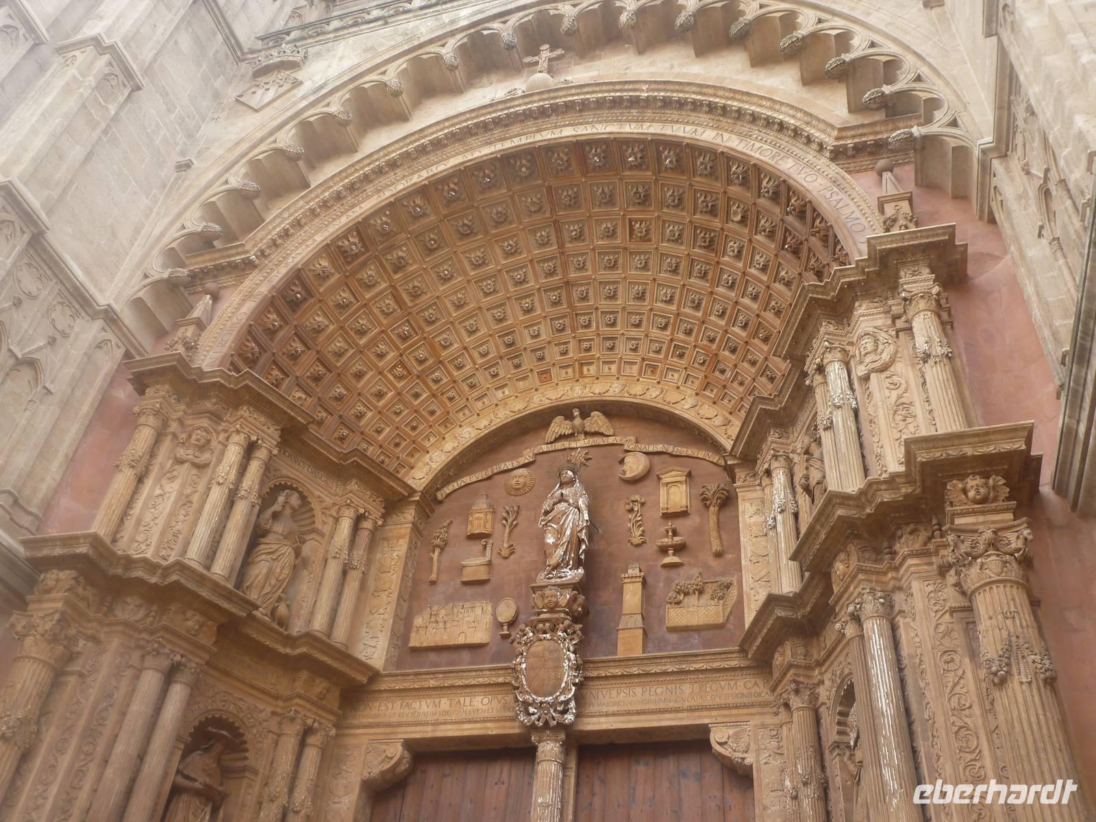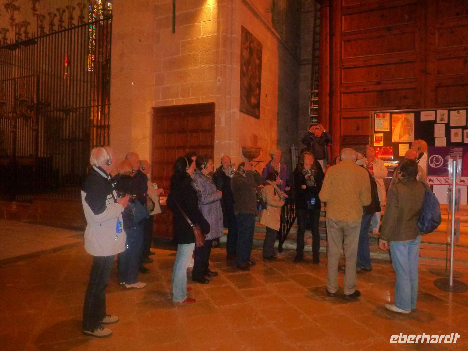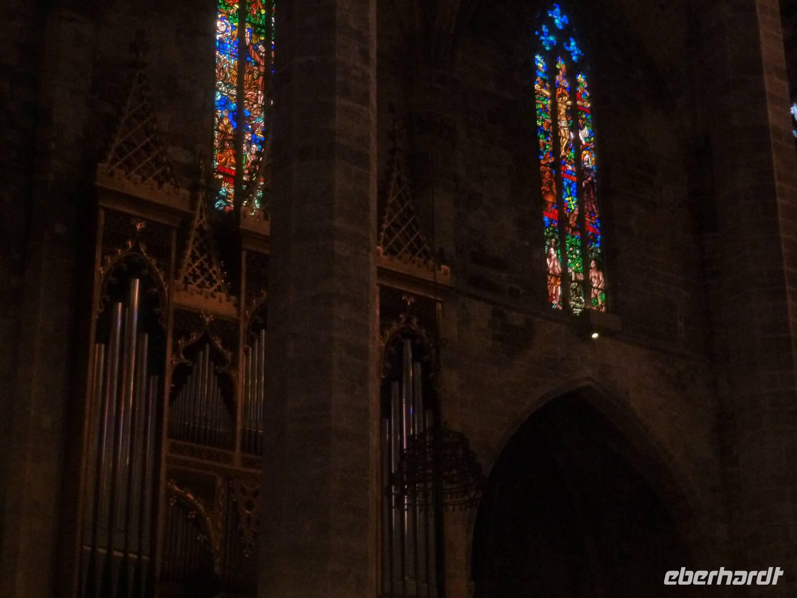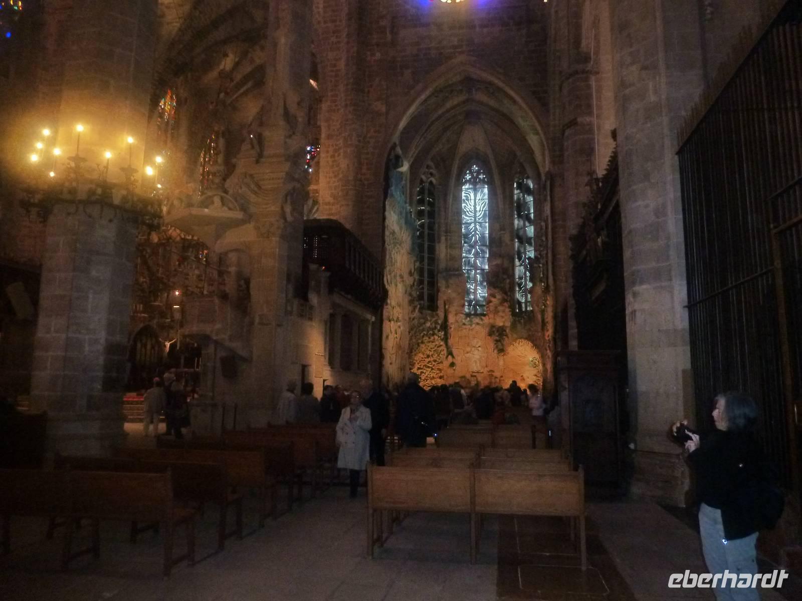 Der wunderschöne Ausblick über das bergige Hinterland, das weite Meer, die Stadt Palma, mit den vielen Jachten im Hafen und der Altstadt war atemberaubend schön. Unser nächstes Ziel, die prächtige Kathedrale „La Seu". Das ca. 110 Meter lange Hauptschiff fasziniert vor allem durch die 14 schlanken, knapp 22 Meter hohen Säulen, sowie durch die aus 1.236 Glasteilen bestehende Fensterrose, mit einem Durchmesser von 11,5 Metern. Magdalena bringt uns mit ihren interessanten Ausführungen, dieses einzigartige gotische Bauwerk aus dem 14. - 16. Jahrhundert näher.