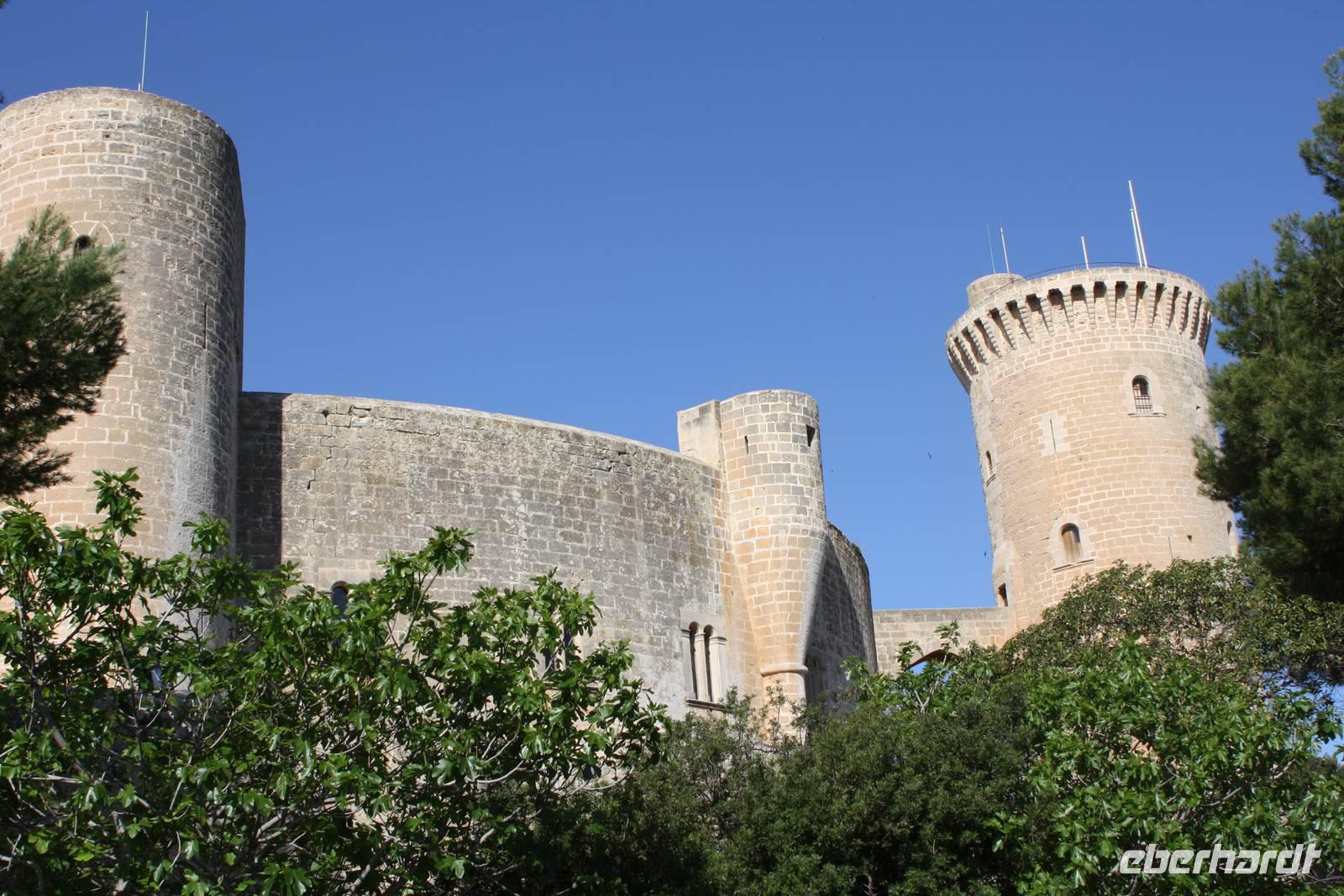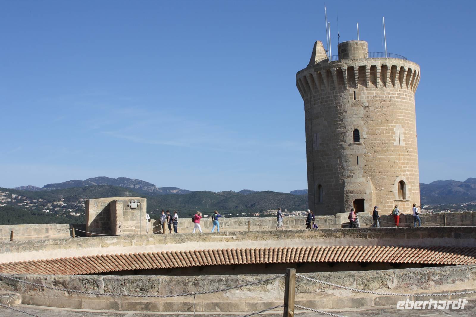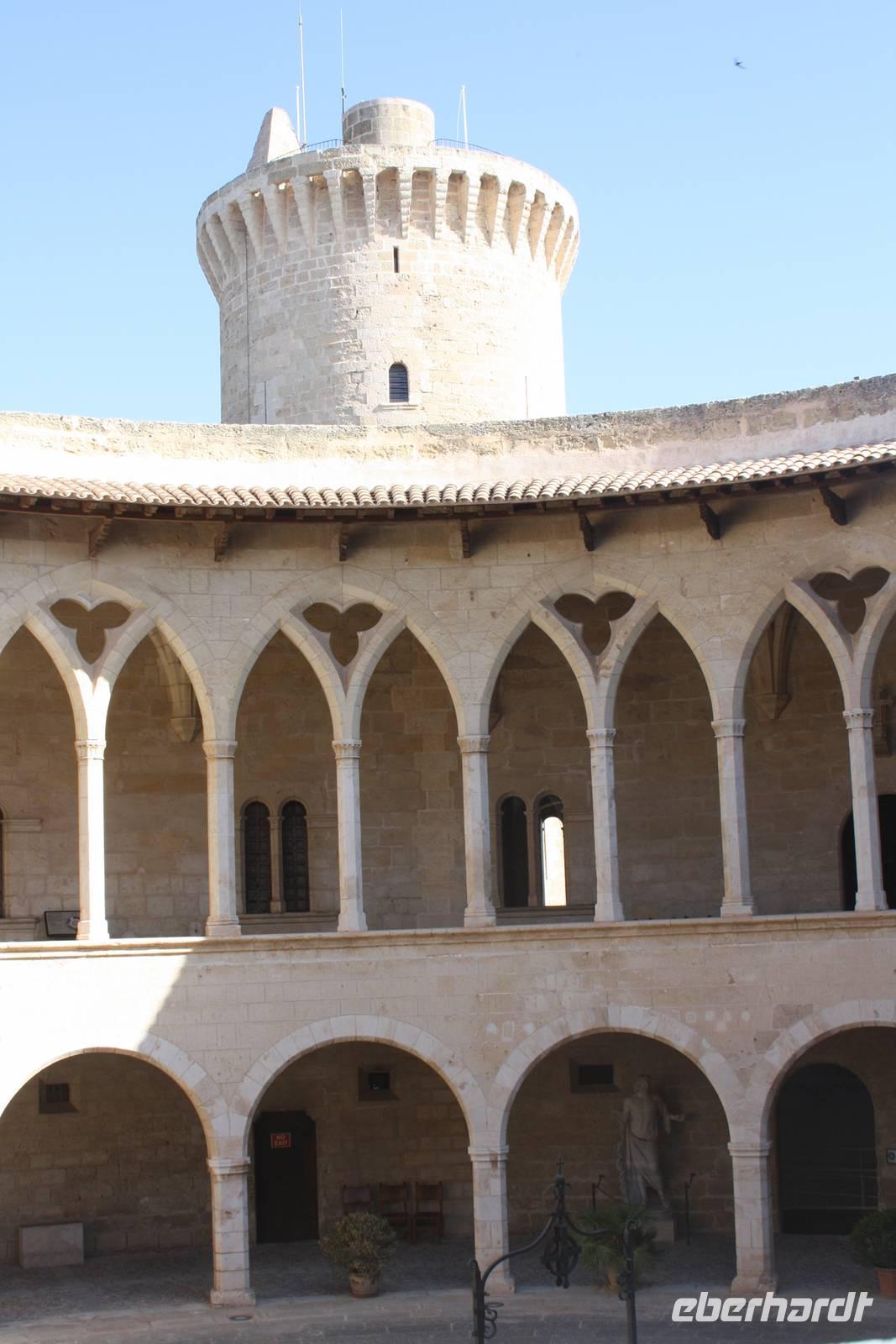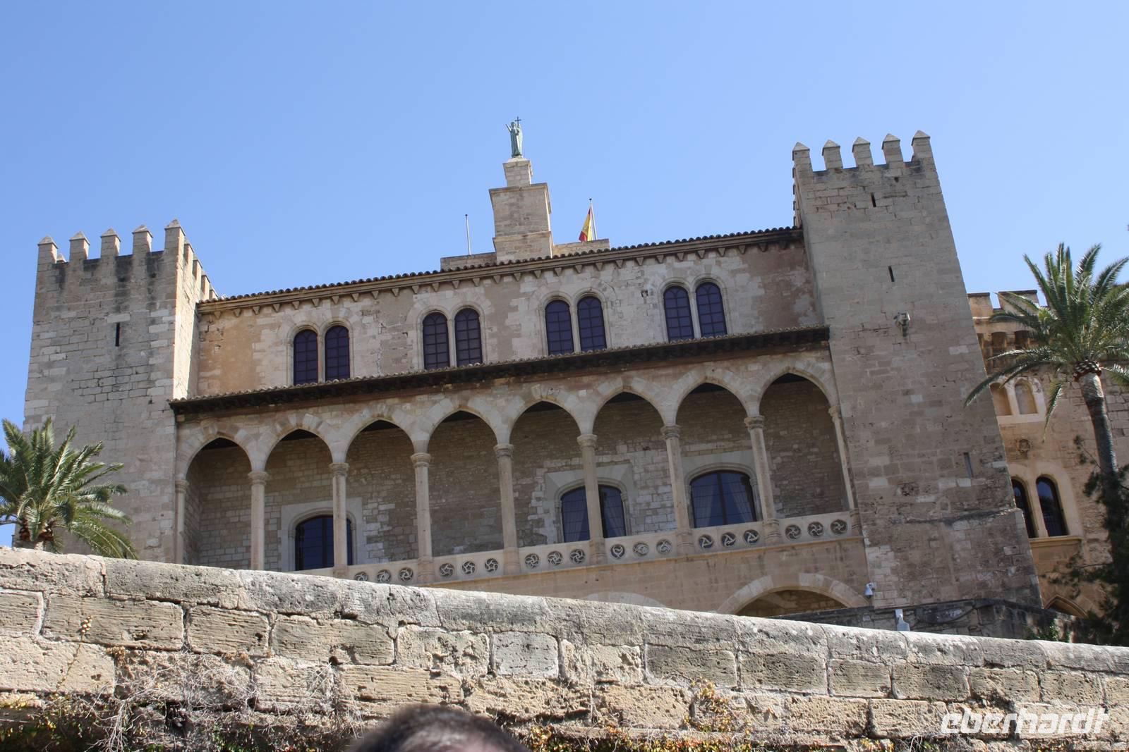 Um kurz vor um neun treffen wir an der Rezeption unsere örtliche Reiseleiterin für die kommende Woche: Magdalena. Markenzeichen: gelber Schirm. So kann ja nichts mehr schief gehen. Auch der Bus wartet schon auf uns und so fahren wir in die Hauptstadt der Balearen, nach Palma de Mallorca. Vorbei an der berühmten Kathedrale erreichen wir das Hard Rock Cafe Mallorca. Noch ist nicht sehr viel los in der Stadt. Nur einige Kreutzer liegen schon im Hafen und deren Ausflüge werden sicher auch bald los gehen. Unser erstes Ziel am heutigen Tag ist Schloss Bellver, welches auf einer Höhe von 113 Metern über der Stadt thront und von einem grünen Pinienwald umgeben ist. Magdalena holt unsere Eintrittskarten und führt uns im Schloss Bellver, dem einstigen Sommersitz der spanischen Könige. Mit ihrem kreisrunden Grundriss ist das Schloss einzigartig in Spanien. Magdalena erklärt uns die wechselhafte Geschichte des Castells und wir bestaunen die zweigeschossigen Arkandengänge. Über Treppen gelangen wir auf die Dachplattform und bewundern von hier den schönen Blick auf Palma mit seinem Jachthafen und der Kathedrale. Anschließend nutzen wir die Zeit, auch die Innenräume des Castells zu besichtigen. Zwar ist das Schloss wenig möbliert oder gar dekoriert aber der Thronsaal und das Kaminzimmer sind eindeutig erkennbar. Zurück am Bus bringt uns José entlang des Hafens zur gewaltigen Kathedrale, dem Wahrzeichen Palma de Mallorcas. Auch hier erfahren wir eine Führung durch Magdalena. Zunächst teilt sie uns Kopfhörer aus, damit wir sie besser durch ihr Mikrofon verstehen können. Der Dom, oder La Seu, wie sie die Mallorquiner nennen, ist auch als „Kathedrale des Lichts" bekannt. Insbesondere die große Fensterrossette mit ihren über 1.000 bunten Einzelscheiben sorgt für ein einmaliges Farbenspiel im Inneren des Doms. Ganz besonders beeindruckend ist der Altar, der von Antoni Gaudi stammt und stark an den Altar in der La Sagrada Familia in Barcelona erinnert. Die Kathedrale ist wirklich sehr imposant und eindrucksvoll. Gegen Mittag spazieren wir zusammen mit Magdalena durch die engen Gassen der Stadt und werfen einen kurzen Blick in die Innenhöfe der Stadt. Weiter geht es über den Placa Major zu einem der drei großen Märkte der Stadt. Heute ist Montag und die Stände sind aufgrund des Wochenendes nicht alle besetzt und besonders die Fischstände haben geschlossen, dennoch erhalten wir einen guten Einblick in das alltägliche Leben der Mallorquiner. Frisches Obst und Gemüsestände finden sich neben zahlreichen Fleischereien, die saftigen Schinken, Salamis und weitere Wurstsorten. Wer einen Hunger verspürt, kann sich an den Tapas-Ständen eine Kleinigkeit holen, eben typisch spanisch. Der restliche Nachmittag steht uns frei zur Verfügung. Ein Großteil der Gruppe fährt zusammen mit Magdalena zurück zu unserem Hotel in Playa de Palma und verbringt die Zeit beim Schwimmen im Mittelmeer oder bei einem Spaziergang entlang der Promenade. Gemeinsam mit Familie Hauswald bleibe ich noch in der Stadt. Zunächst bestellen wir uns in einem kleinen Restaurant einen Kaffee. Danach spazieren wir durch die Straßen der Hauptstadt, unter anderem auch über die Blumenstraße und der La Rambla. Wir bestaunen die Pflanzenpracht, ein Institut und die Hinterhöfe der vielen Gassen. Zum Abschluss unseres Aufenthaltes nehmen wir in einem Restaurant gegenüber der Kathedrale Platz und bestellen uns einen typischen Sangria, der uns sehr gut schmeckt. Mit dem Linienbus Nummer 15 gelangen wir schließlich zurück zu unserem Hotel, wo wir wieder gemeinsam mit der Gruppe zu Abend essen.
